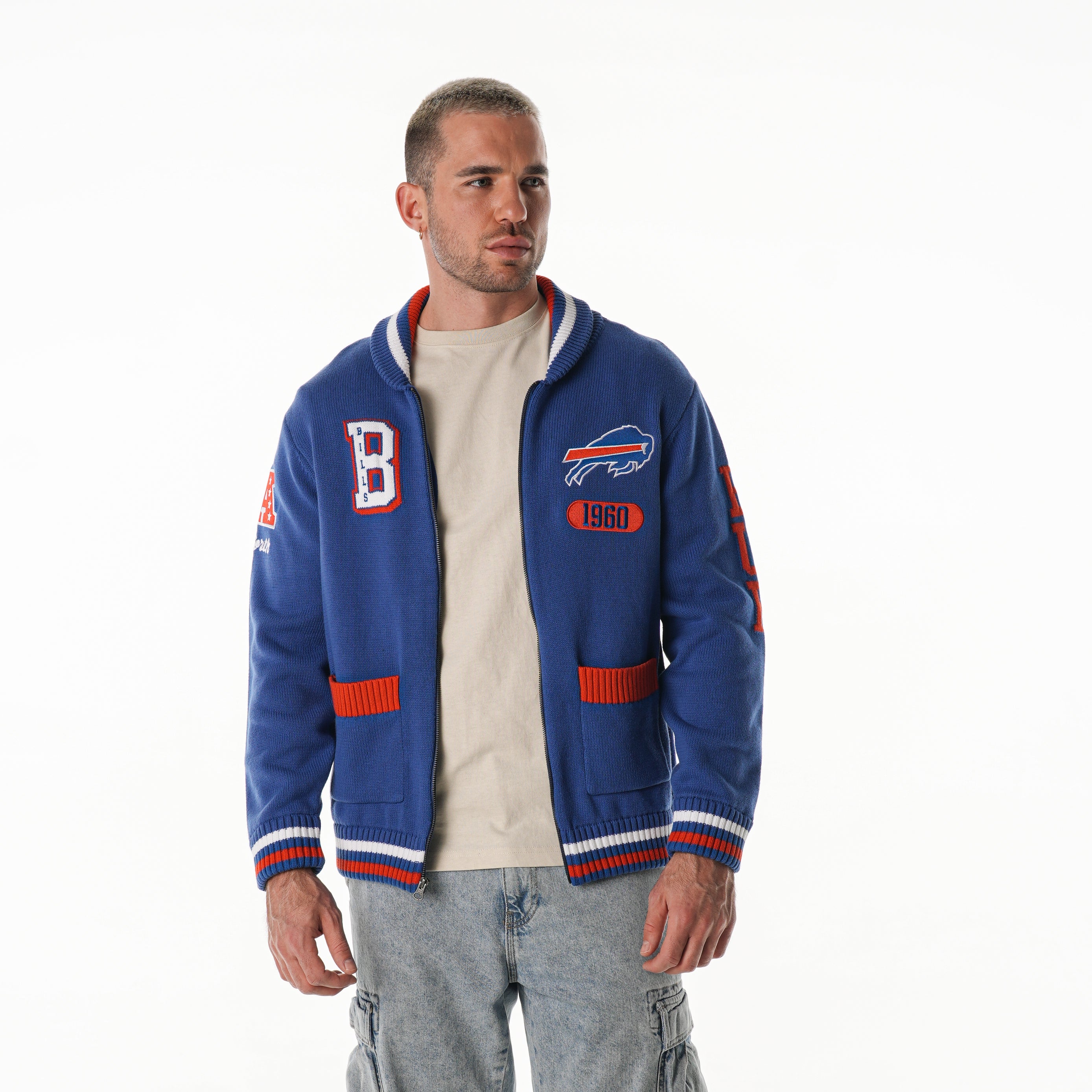 Rep Bills Mafia with bold knit details. This Buffalo Bills jacquard sweater features a full-zip front and premium woven graphics that showcase team pride from every angle. Built in a midweight knit, it’s the perfect layering piece for game day at Highmark Stadium or everyday wear.