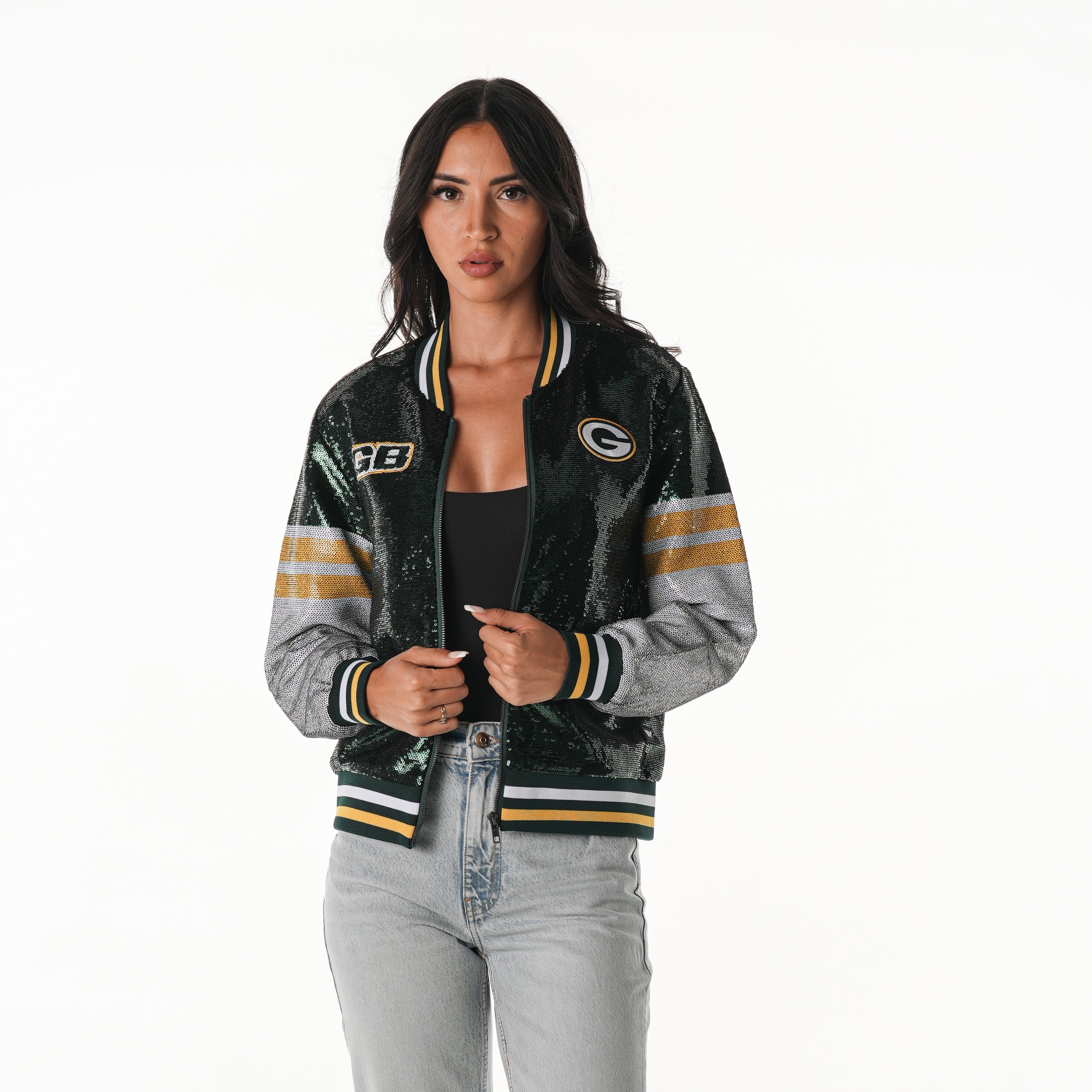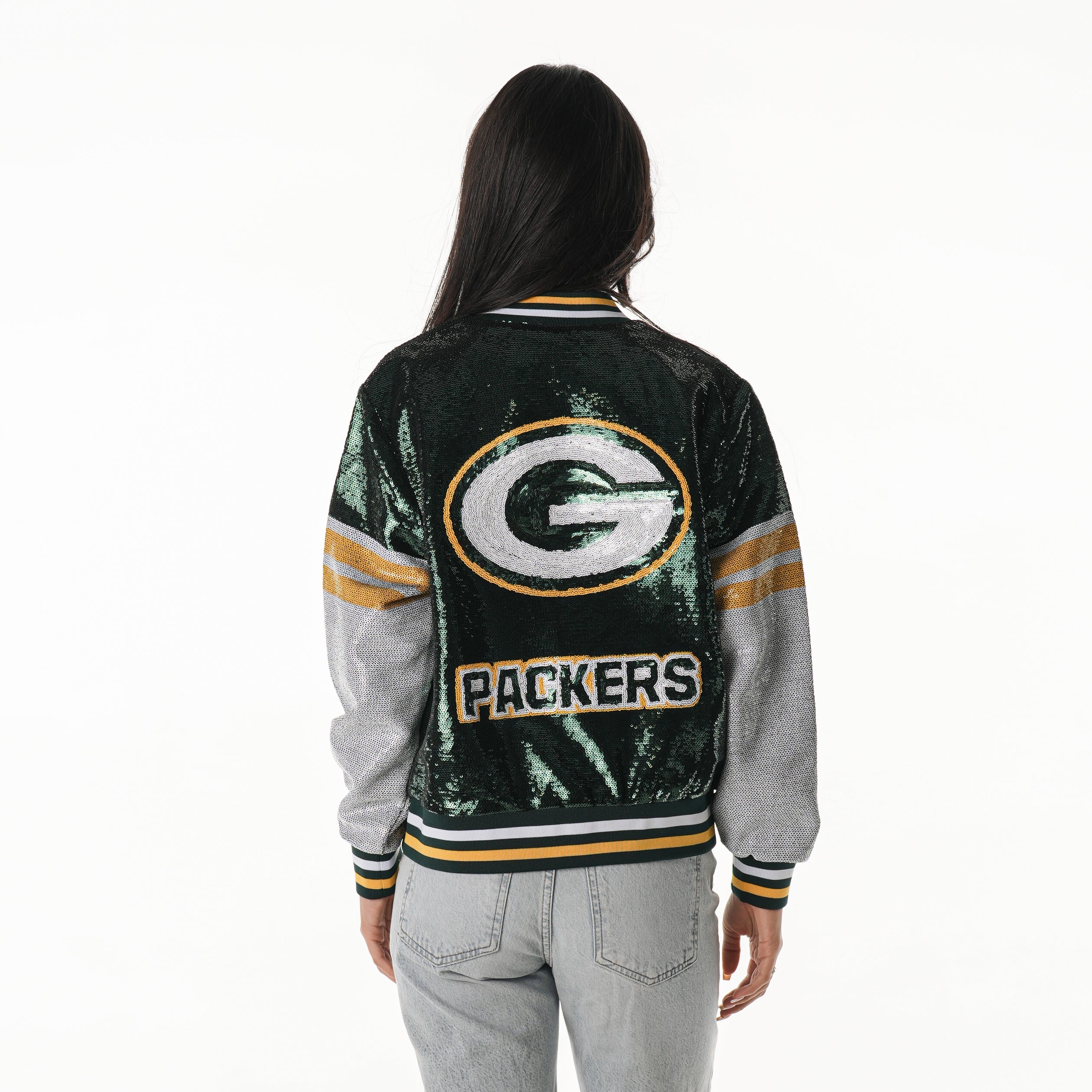 Shine bright on game day with this Packers sequin jacket, featuring bold team logos and striped sleeve detailing. A statement-making piece designed in green and silver sequins with classic varsity trim.