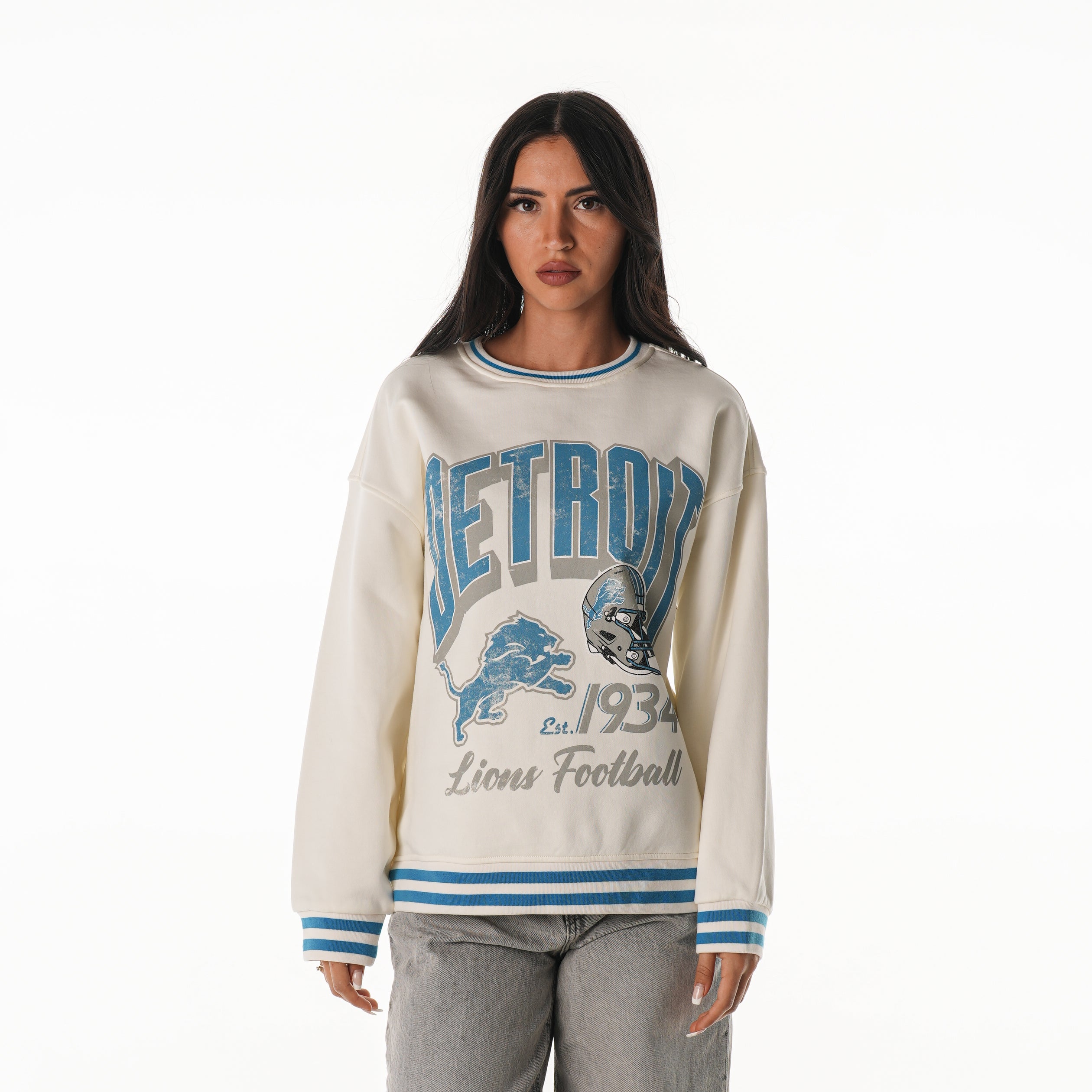 Rep the Lions with a vintage-inspired edge in this oversized crew fleece. Featuring bold front graphics with the team name, logo, and helmet, plus striped trim at the cuffs and hem for a retro finish, it’s the perfect piece for game day or casual wear.