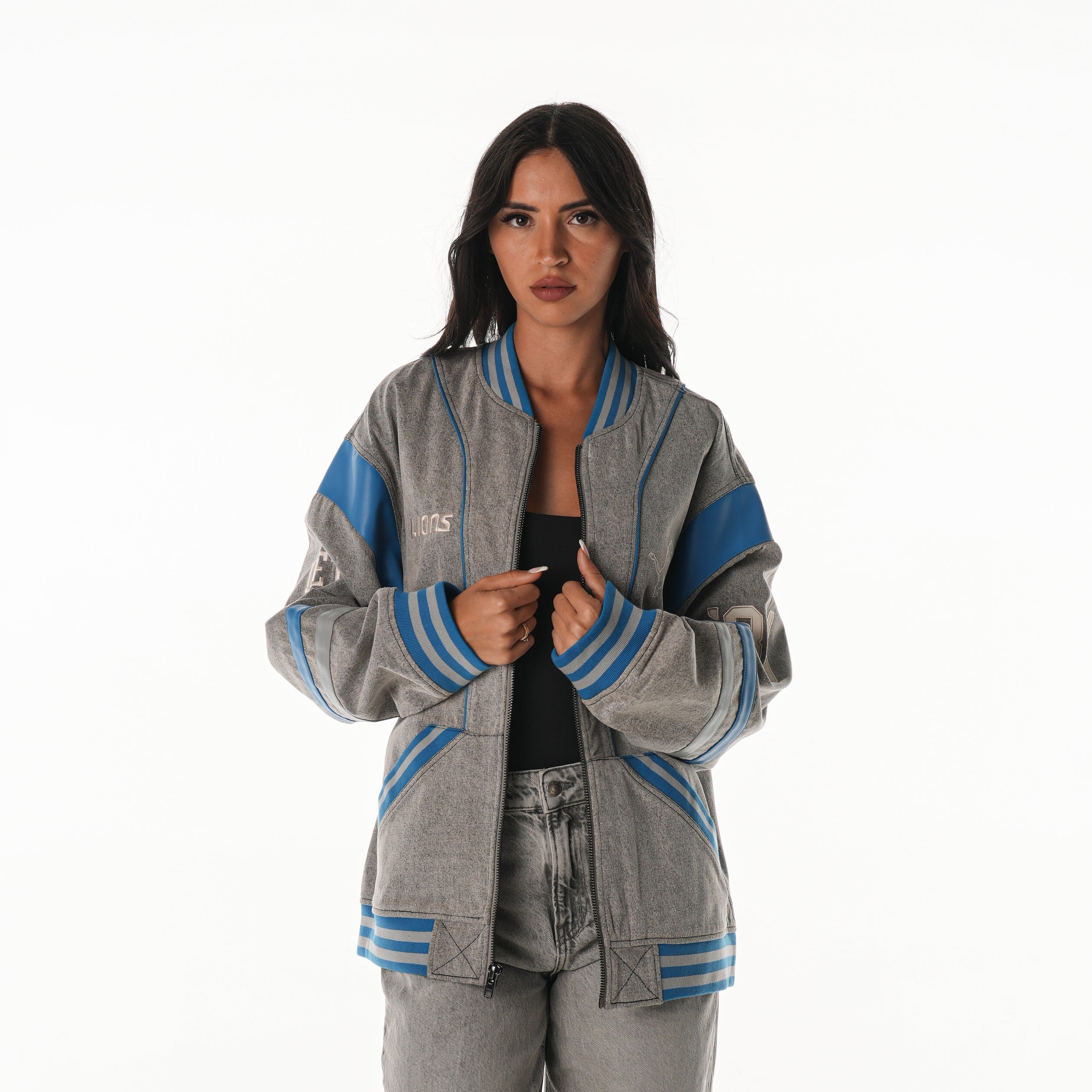 Rep the Lions in this retro oversized denim jacket, designed in washed grey with Honolulu Blue accents. Front team hits and an oversized back graphic bring vintage vibes—perfect for game day or everyday wear.