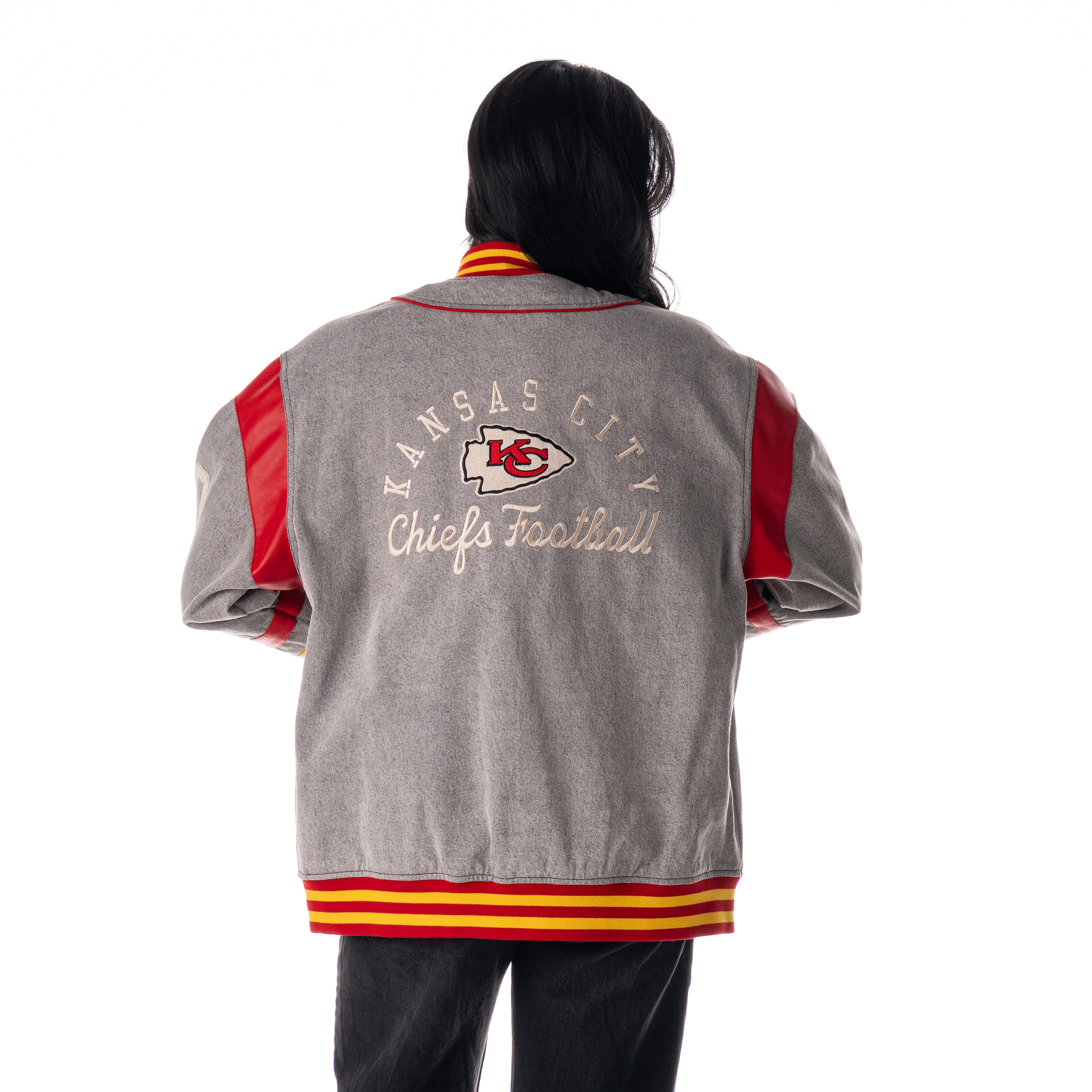 This unisex oversized denim jacket features retro Chiefs graphics on the back with contrast sleeves and striped trim for a throwback look. The grey denim keeps it versatile while still delivering strong team presence.