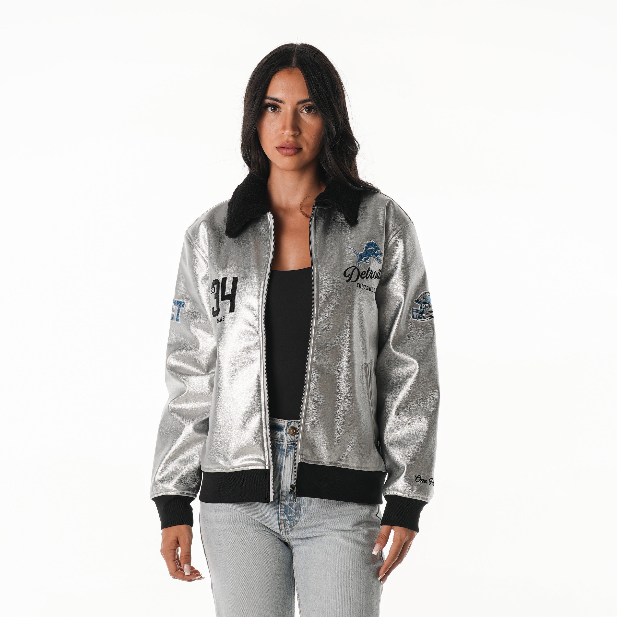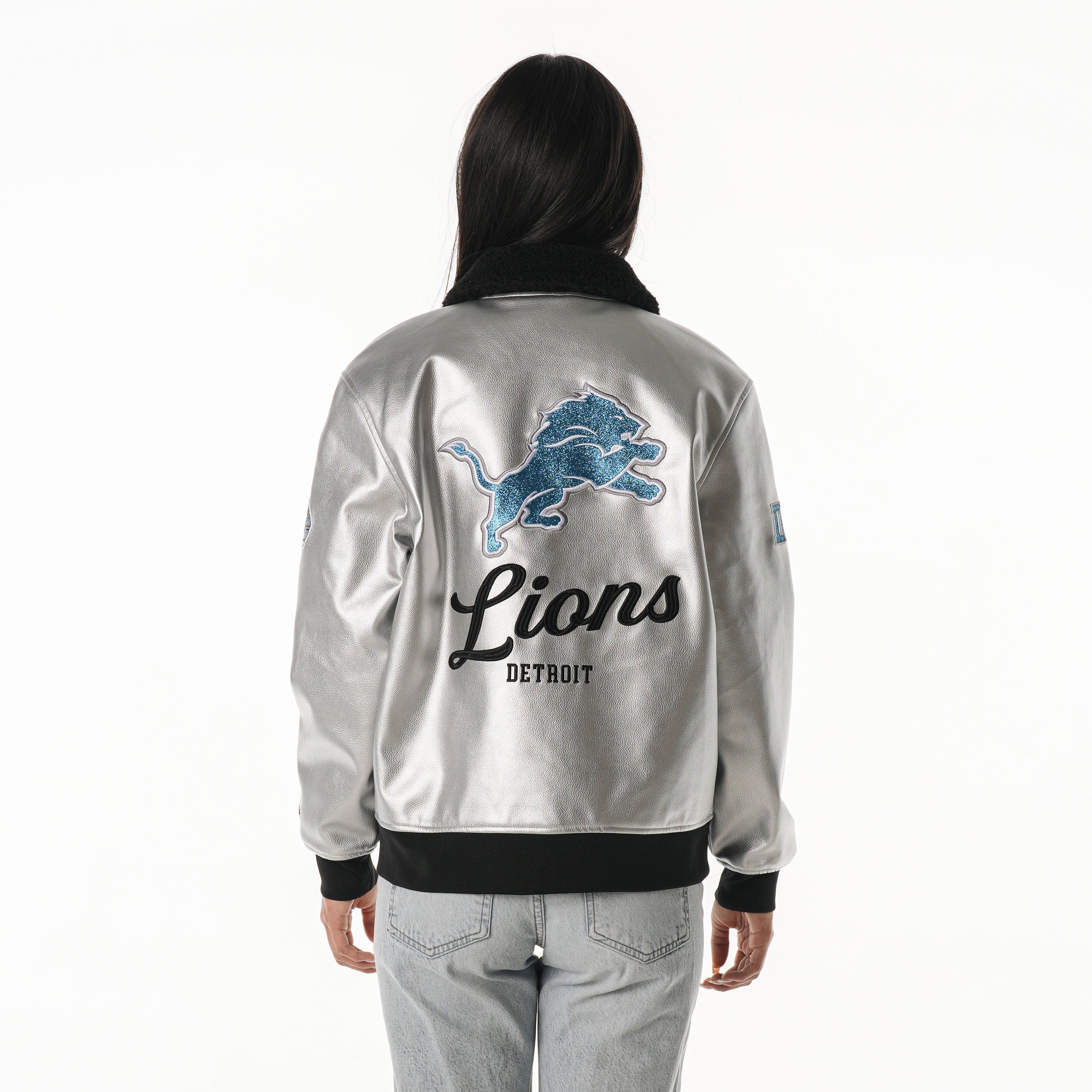 Rep the Lions in this metallic bomber, designed in silver with bold team graphics and a cozy sherpa collar. Detailed front patches and a statement back logo make it a standout piece for any fan.
