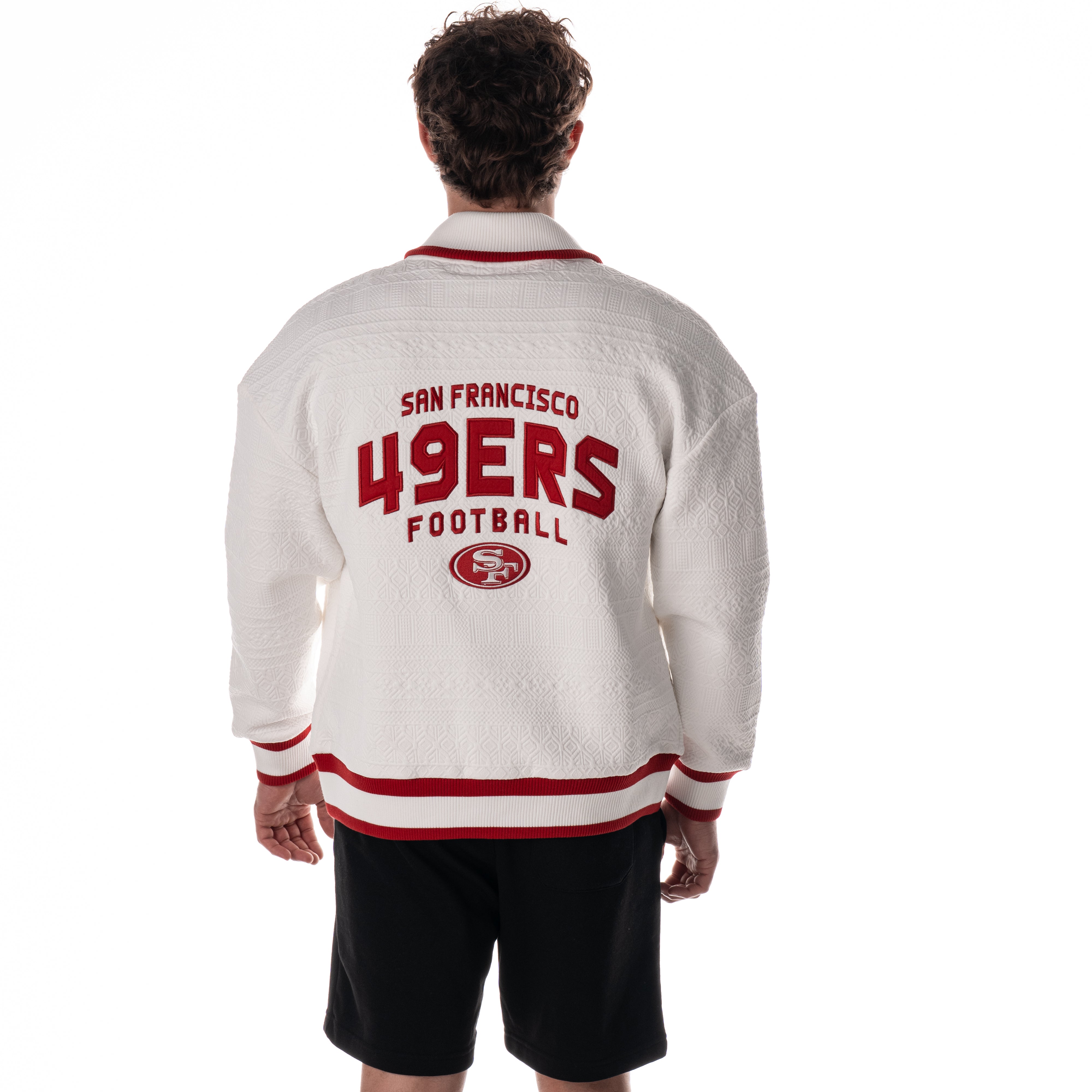 Rep the Niners in a vintage-inspired look that works on game day or any day. This unisex cable knit bomber brings in those classic team details with a clean front and bold back graphic that stands out. The striped trim gives it that throwback edge, and the relaxed fit makes it easy to layer with whatever you’re wearing. Officially licensed NFL product.