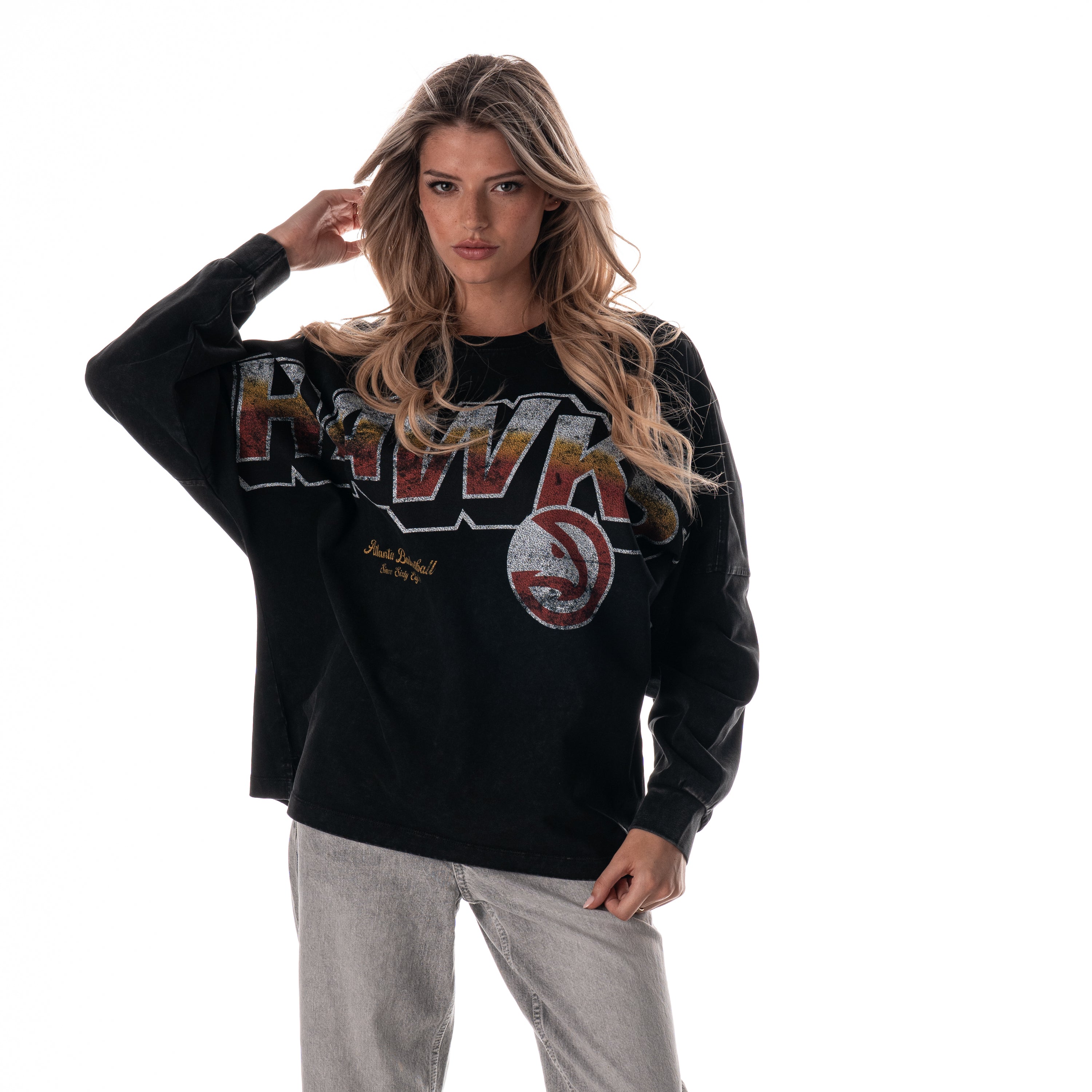 An easy, oversized long-sleeve tee with a bold Hawks graphic across the front. The dropped dolman sleeves give it that relaxed, throw-on fit you can wear with anything.