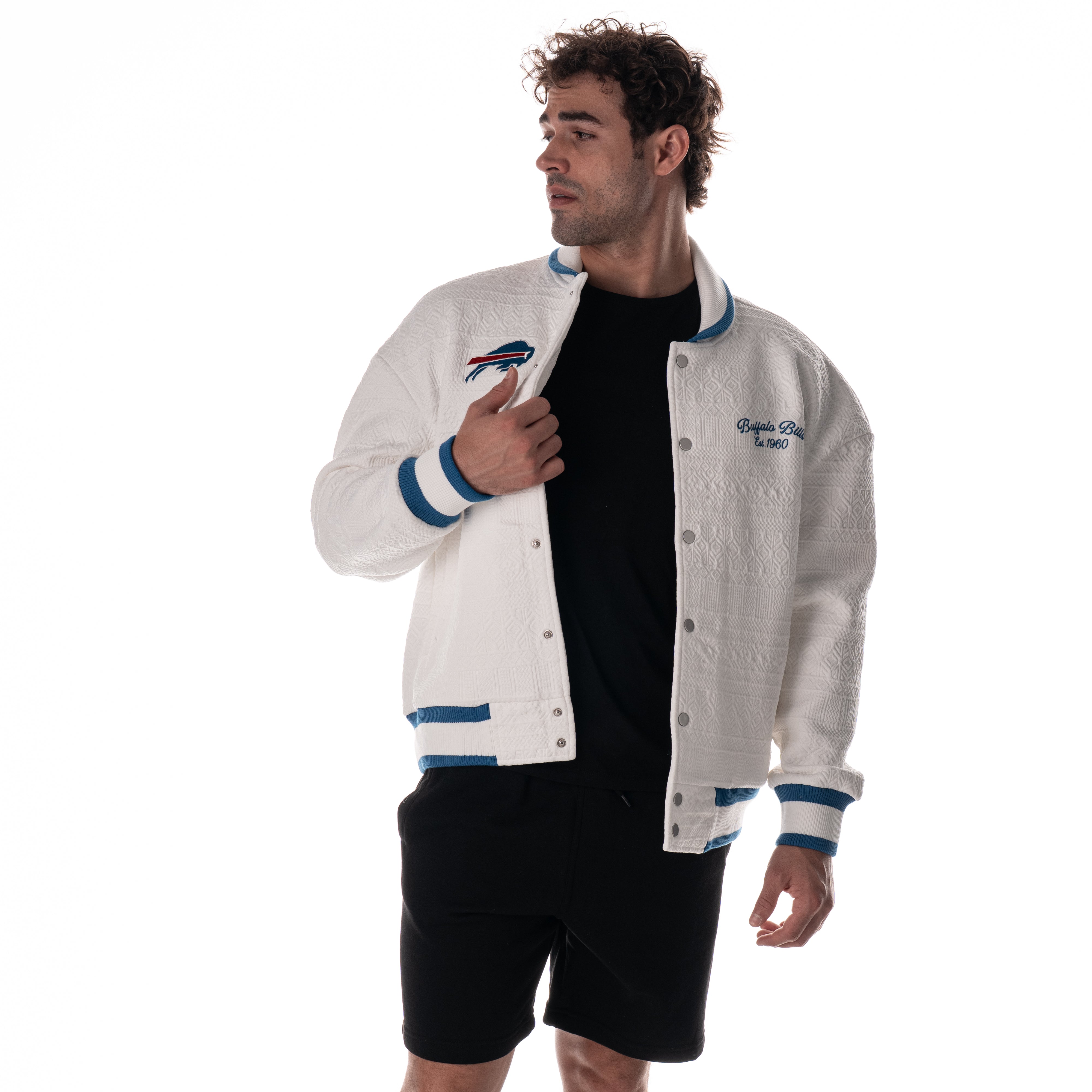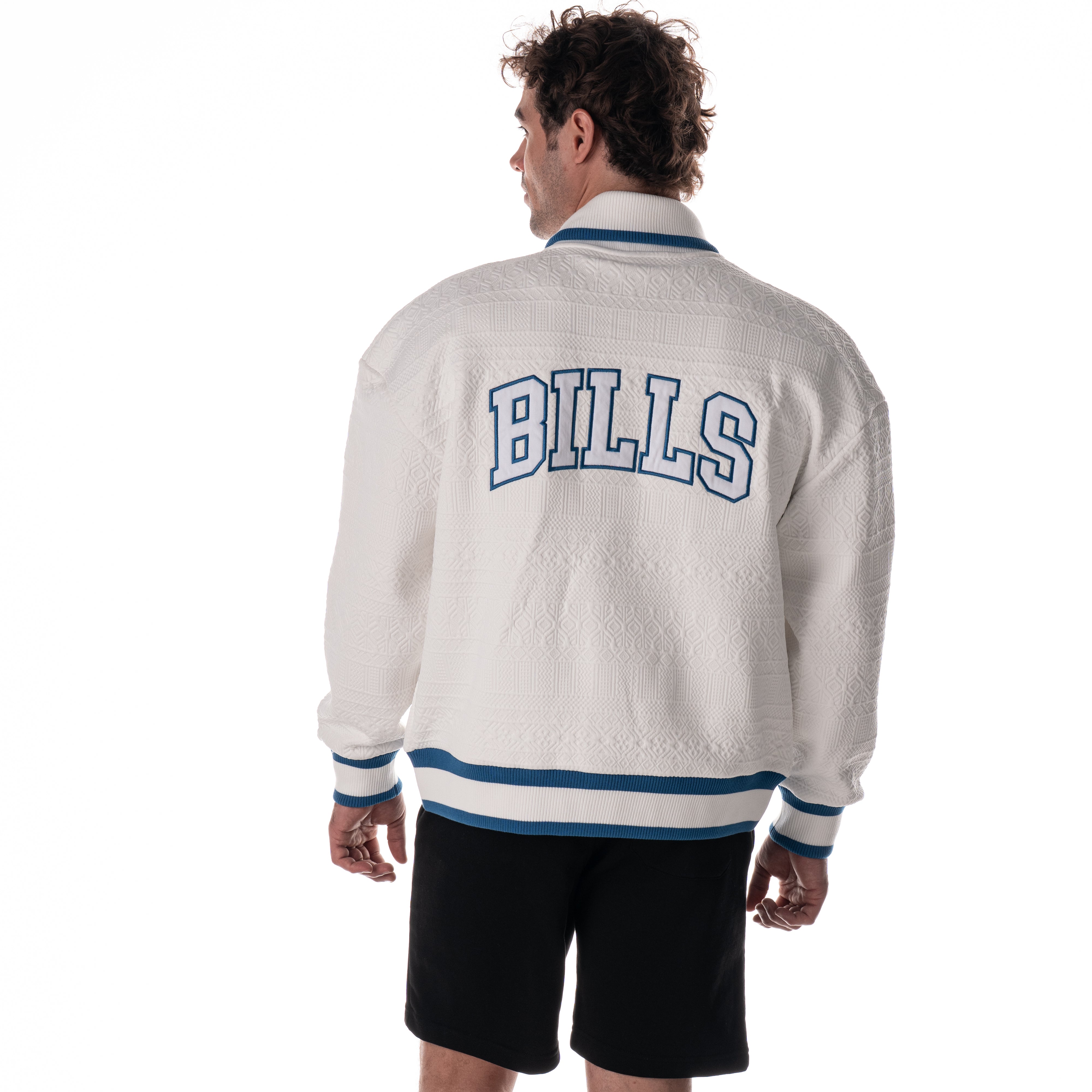 A textured cable knit bomber with clean team branding and a vintage-inspired feel. The front stays minimal, while the back shows off a bold Bills graphic. Finished with striped cuffs and a relaxed shape that works for layering.