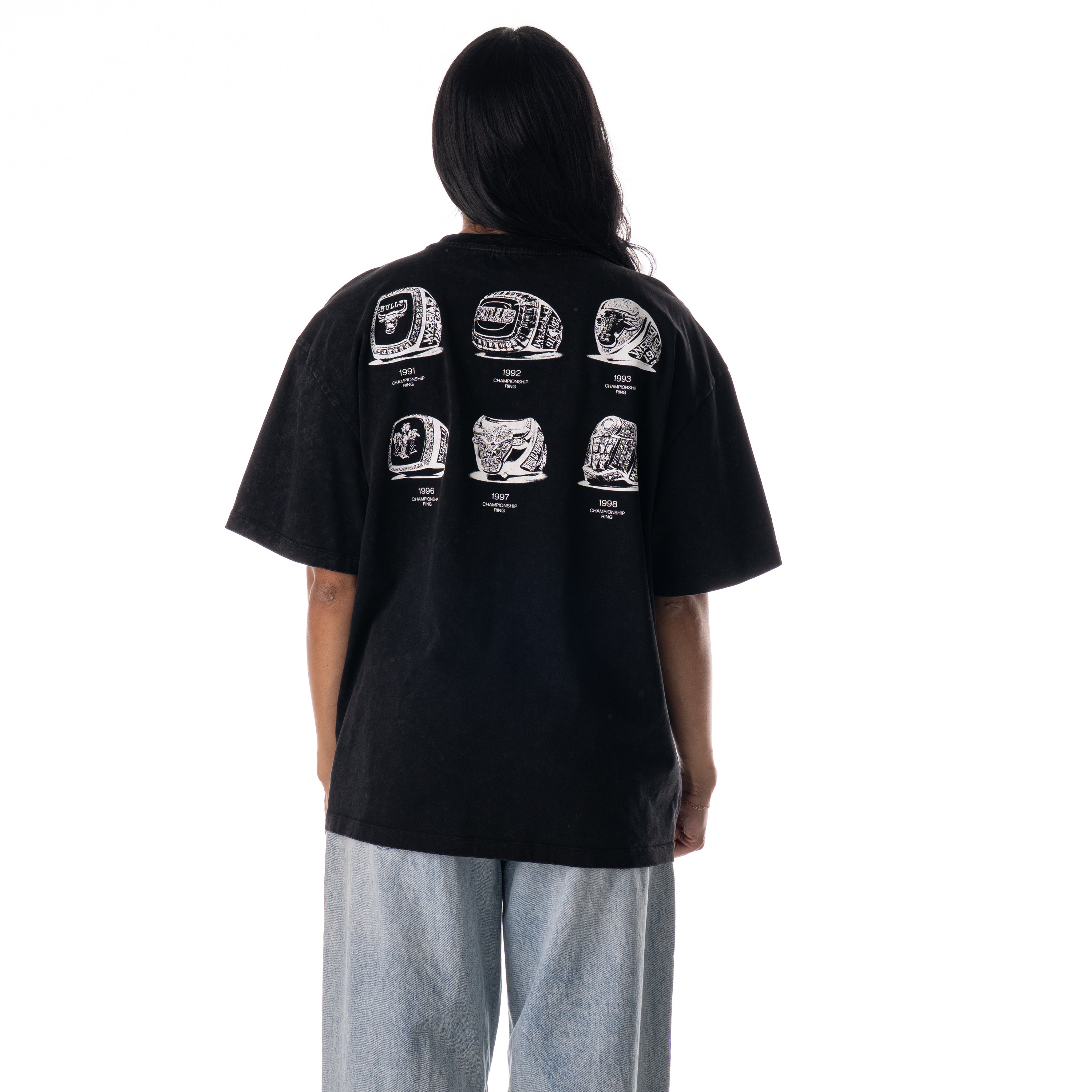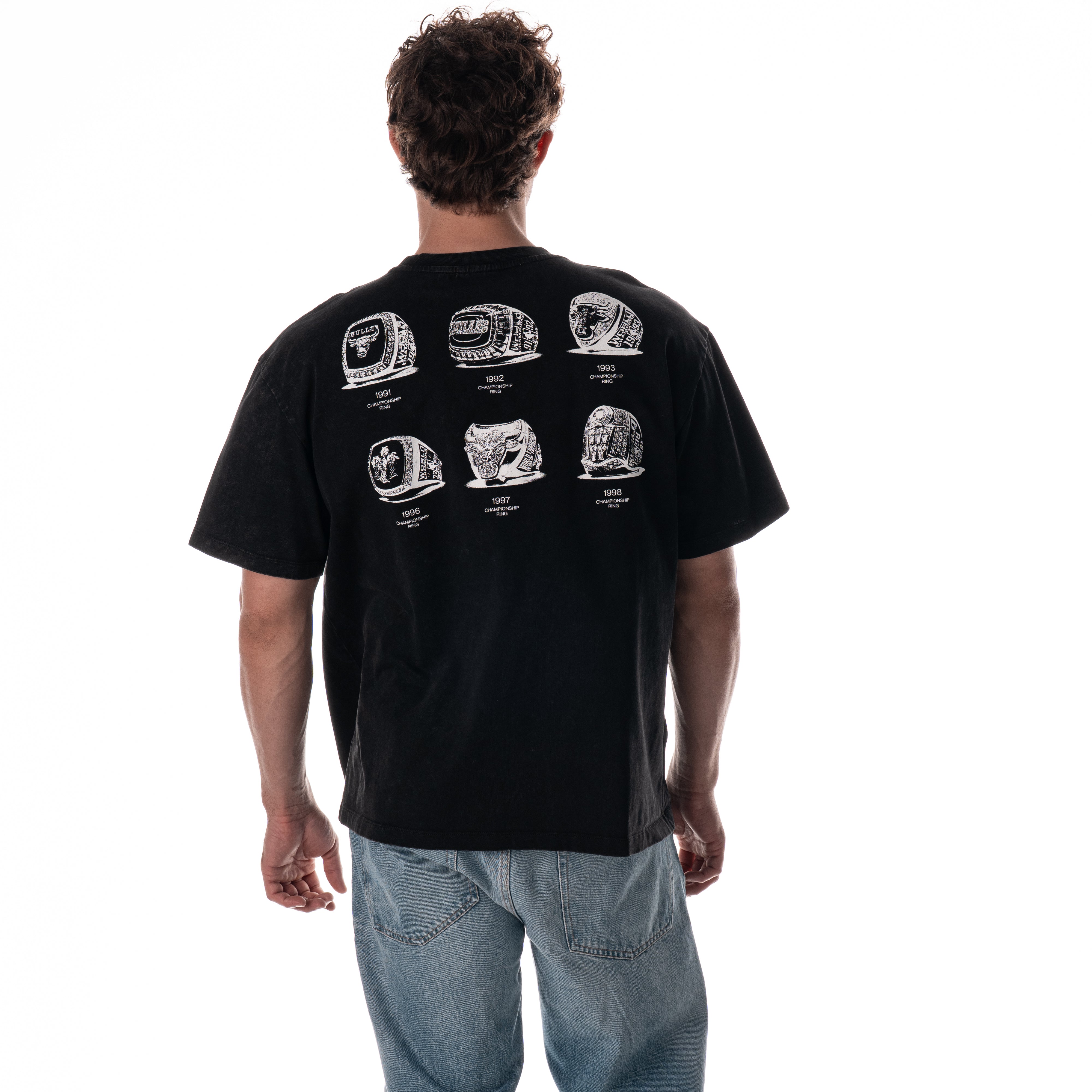 A simple everyday tee with Bulls details front and back. The washed-black base keeps it easy to wear, and the clean graphic hits give it that classic fan look without doing too much.