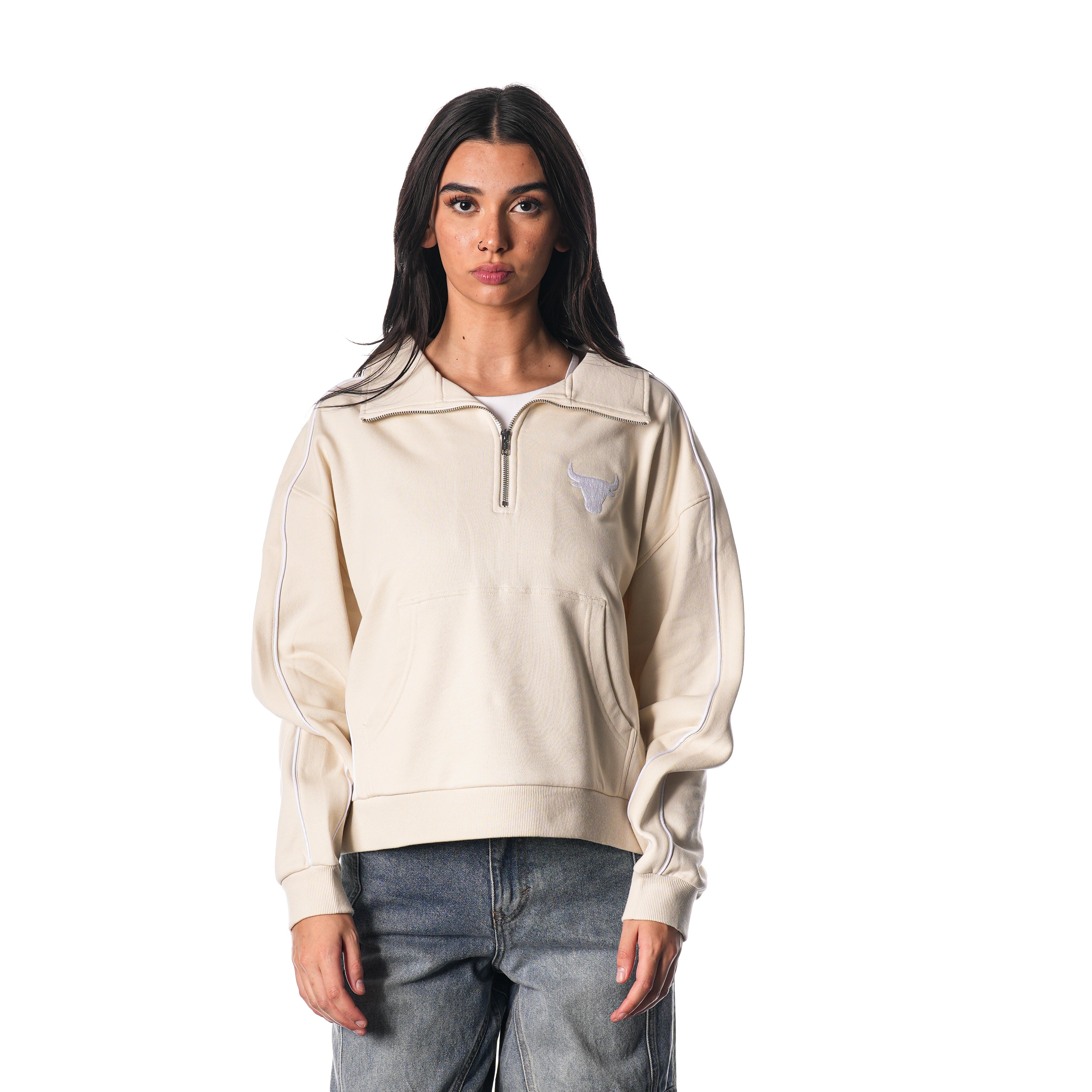 The Chicago Bulls Quarter Zip Fleece in cream combines cozy comfort with a sleek design. Perfect for staying warm while representing your Bulls pride on game day or any day.