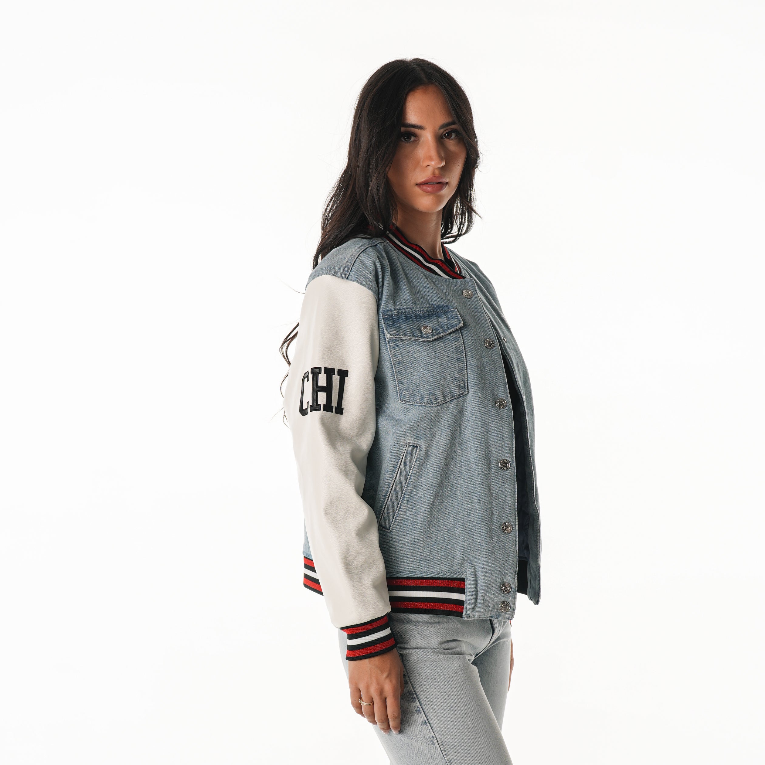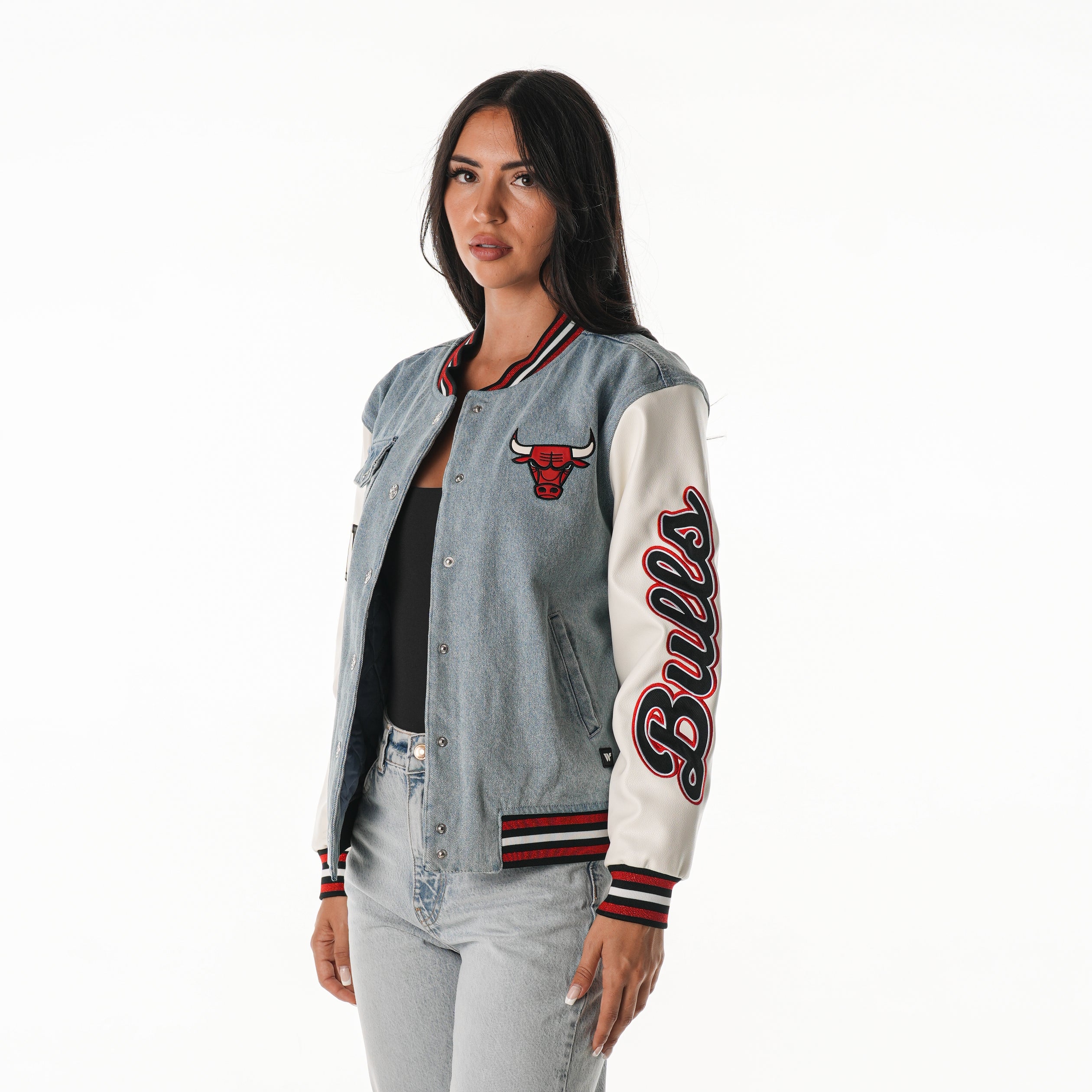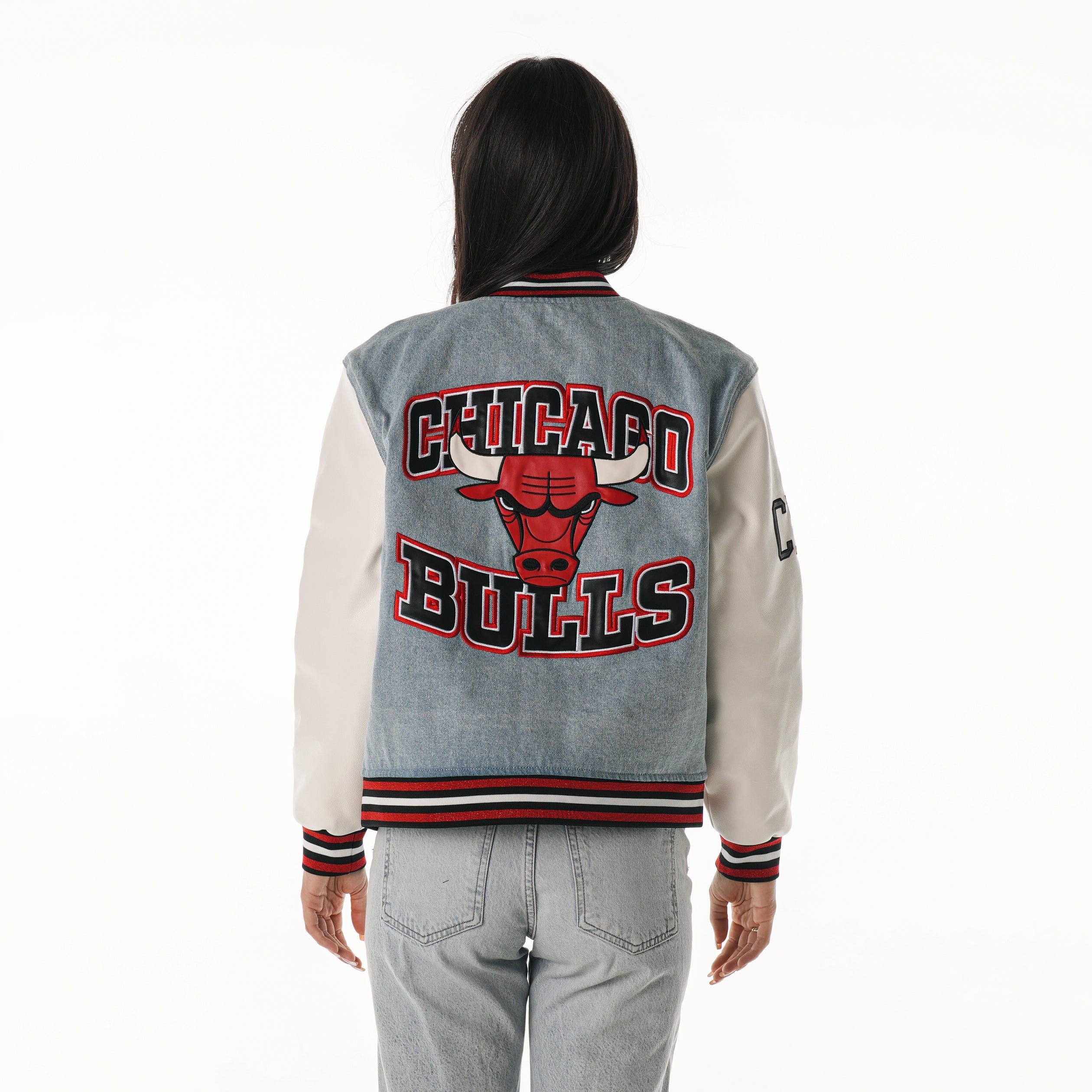 A denim varsity jacket with bold Chicago Bulls detailing on the front and back. Classic varsity trim and an easy, relaxed fit make it a solid layer for game day or everyday wear.