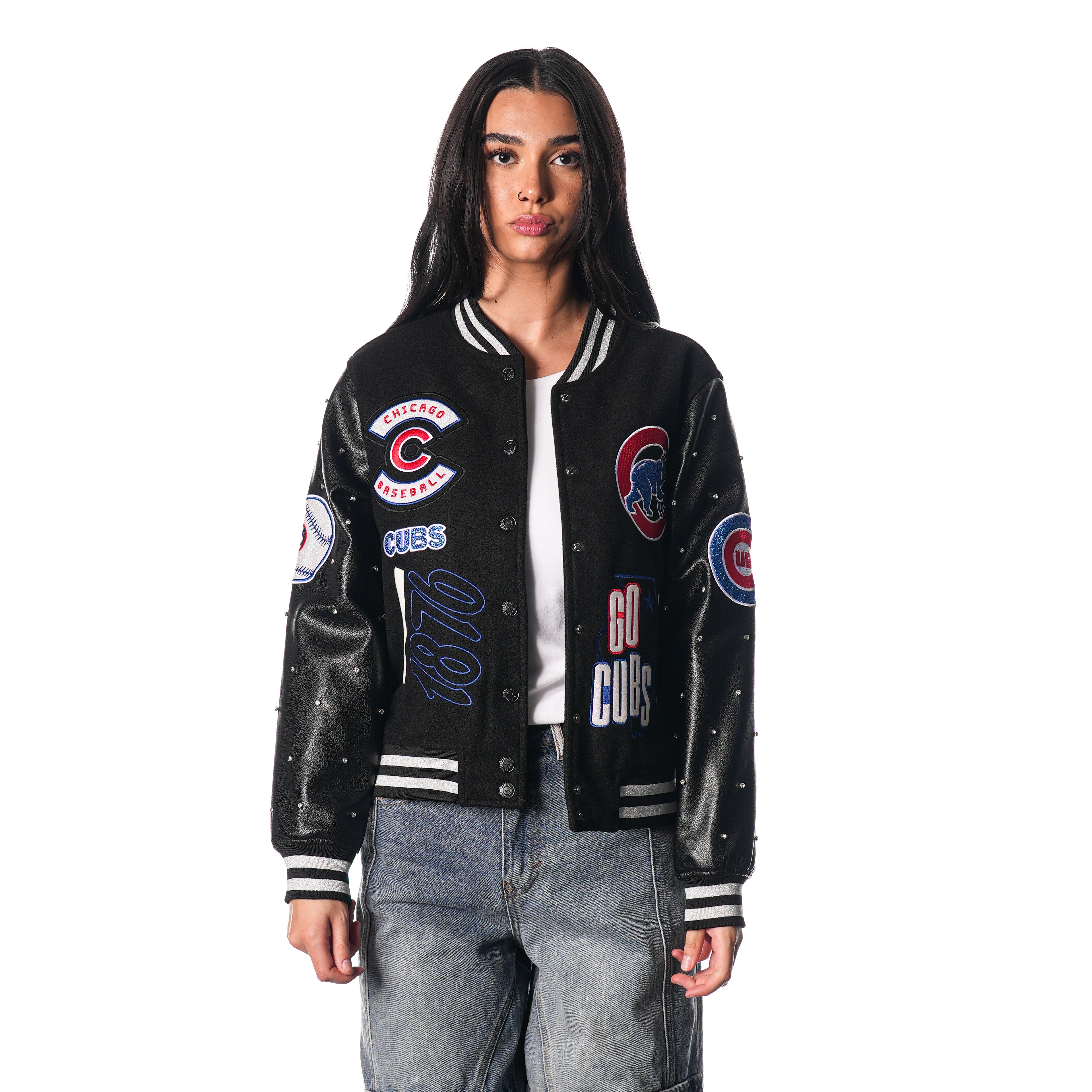 The black jacket features the iconic Chicago Cubs logo and a sparkle detail. Perfect for showing off your team pride on game day or any day.