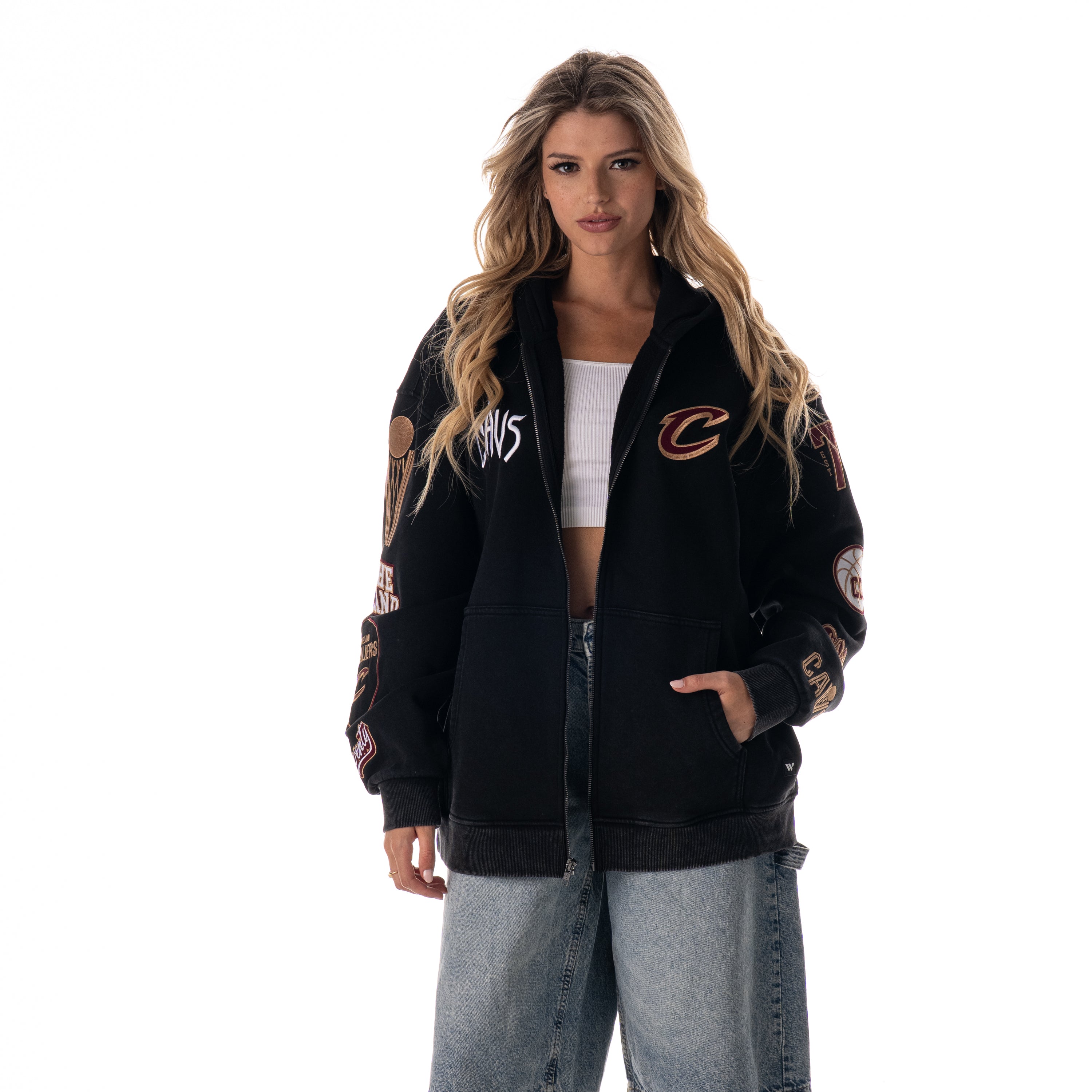 A black full-zip hoodie loaded with Cavs pride. It features a mix of old and new team logos across the sleeves and chest, giving it a bold, collectible look. The washed black finish keeps it easy to wear year-round while still making a statement.