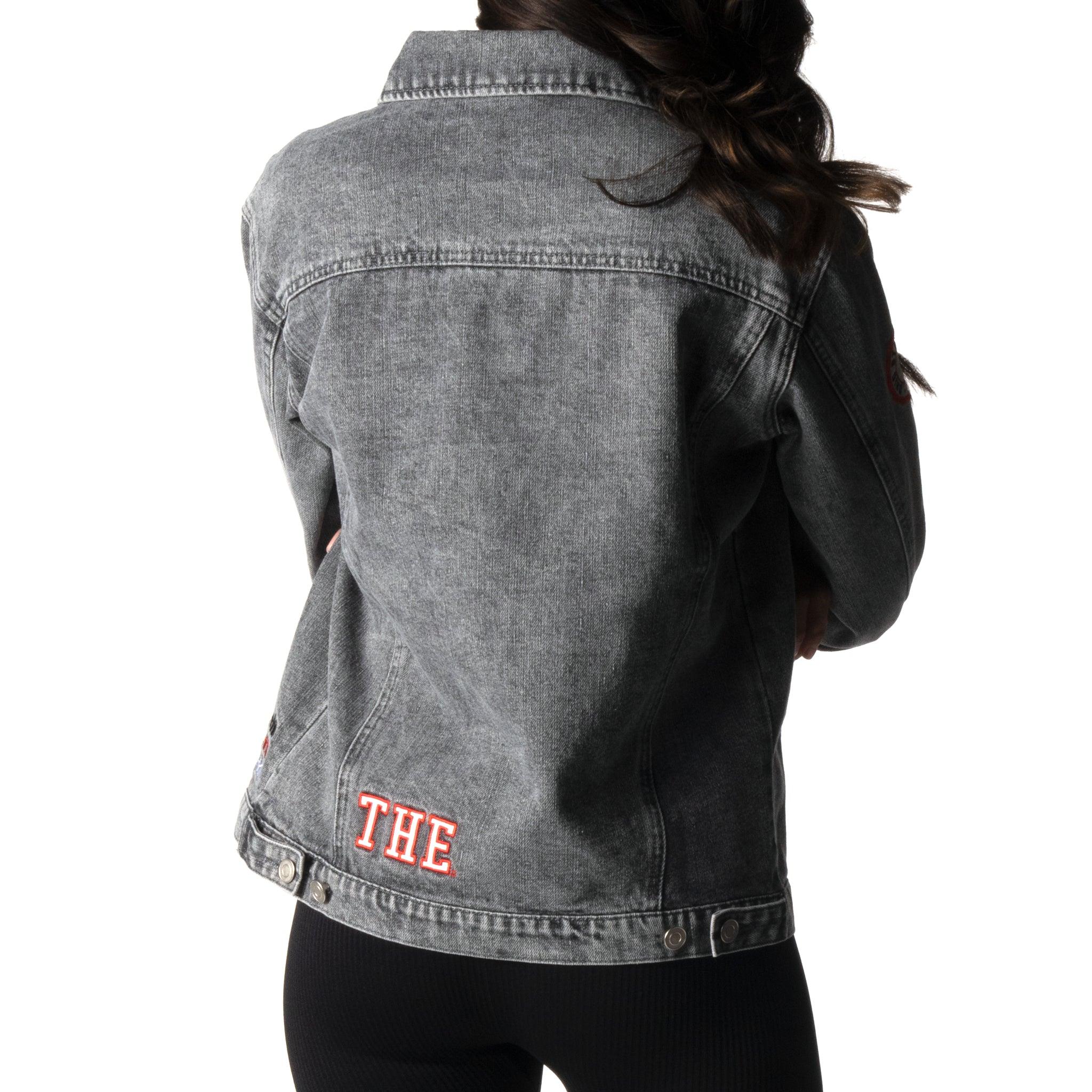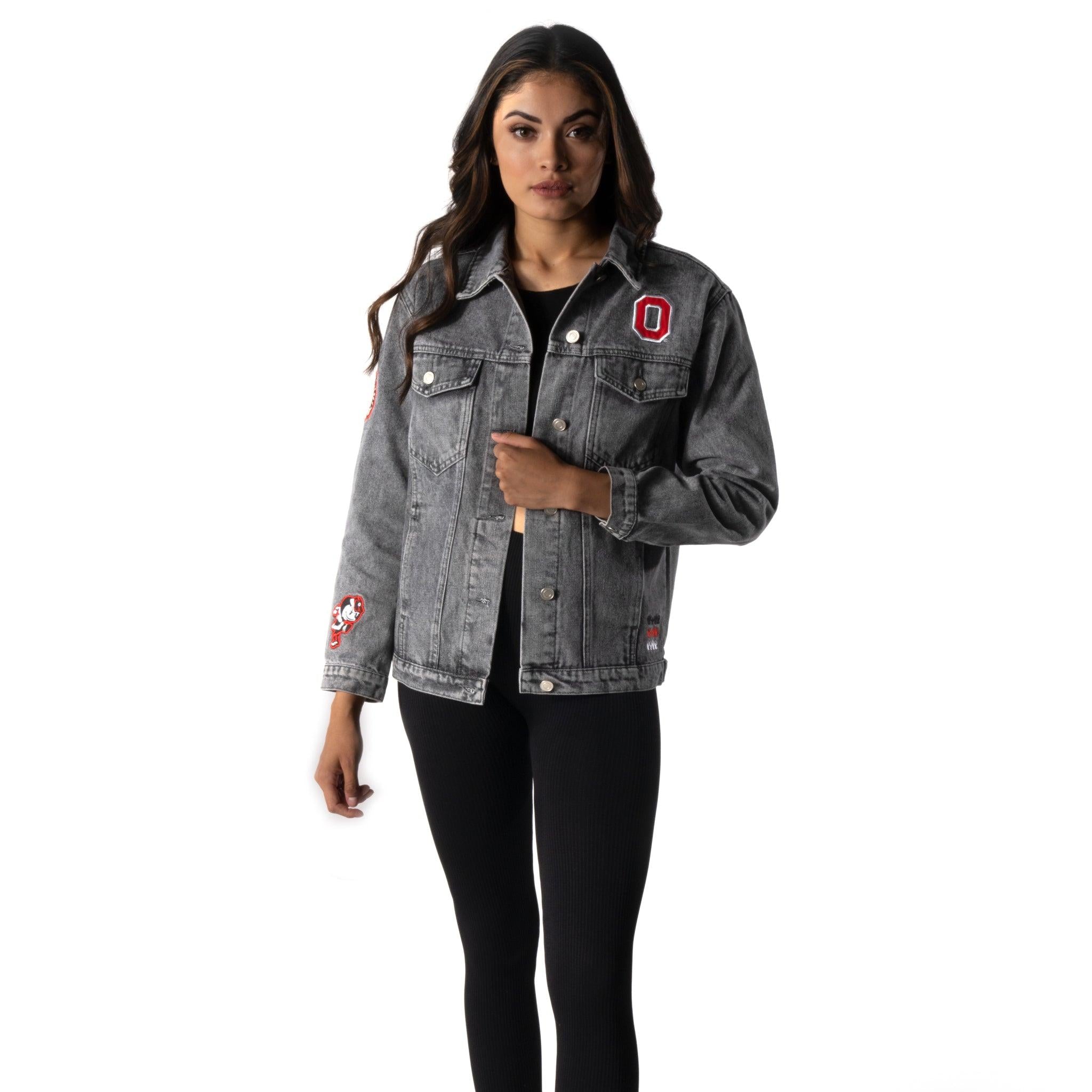 Patch denim jacket. With embroidered patches on sleeve, front, and back. Relaxed fit. For an oversized fit size up.