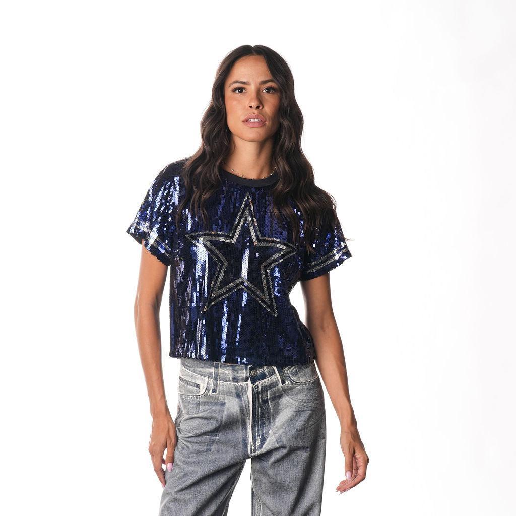 This navy cropped tee features bold sequin accents and the iconic Cowboys logo, blending casual comfort with standout style. Perfect for showing off your team spirit whether you're at the game or out with friends, this tee is a must-have for any Cowboys fan looking to add some sparkle to their look.