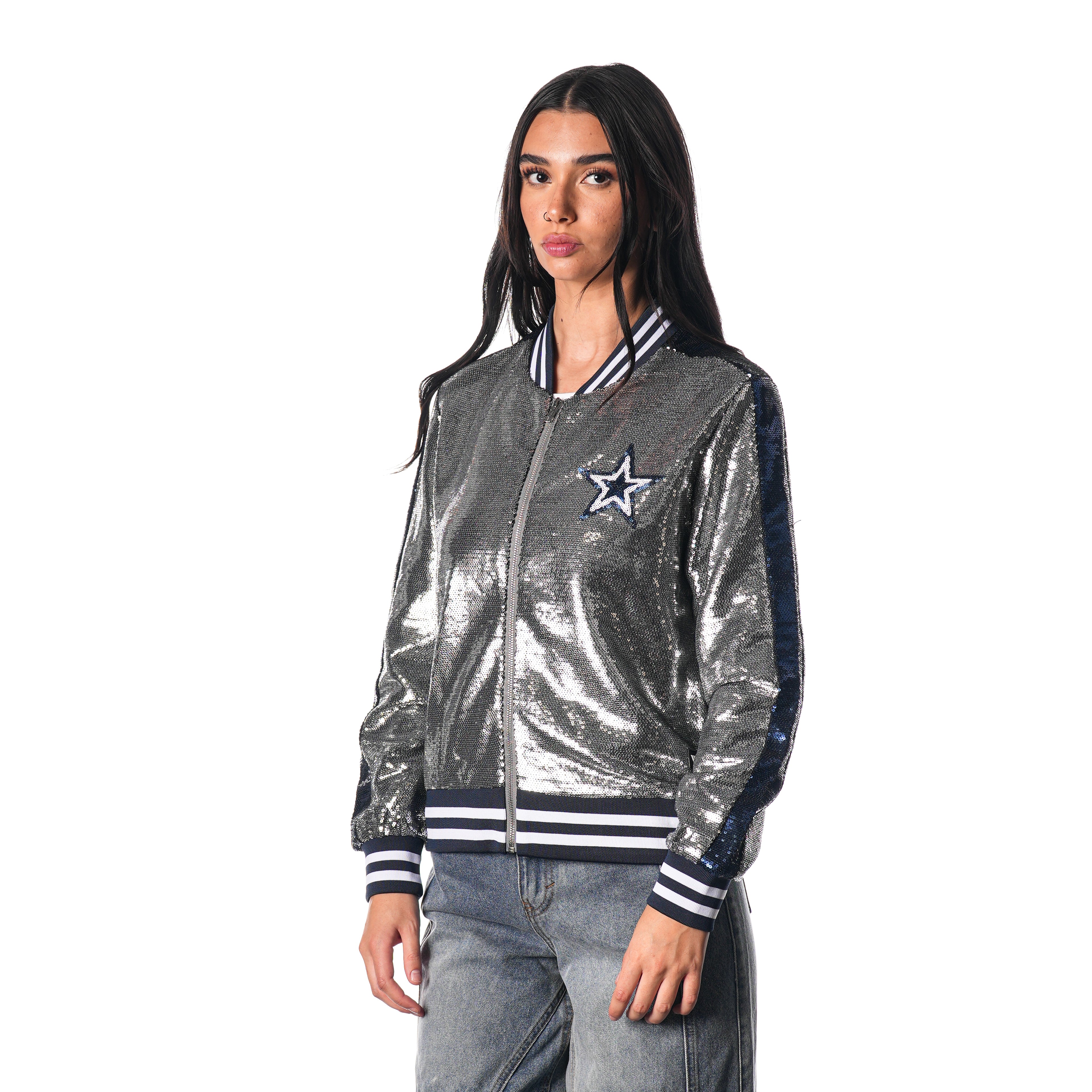 This statement jacket features all-over sequin detailing and the iconic Cowboys logo, blending bold style with team pride.
