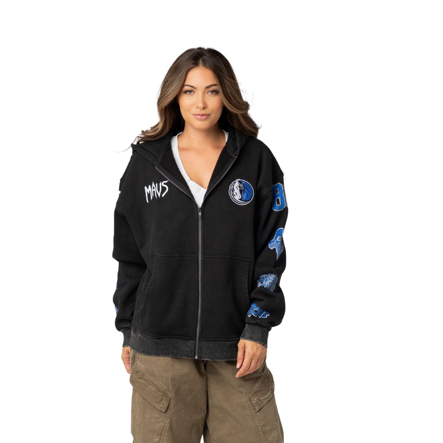 A full-zip black hoodie with bold Mavericks logos running down each sleeve and a clean team hit on the chest. The relaxed fit makes it an easy everyday layer, and the sleeve graphics give it a standout look.