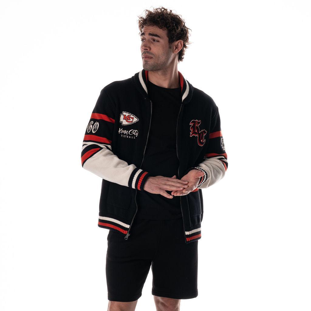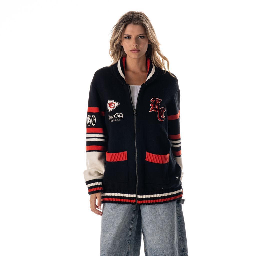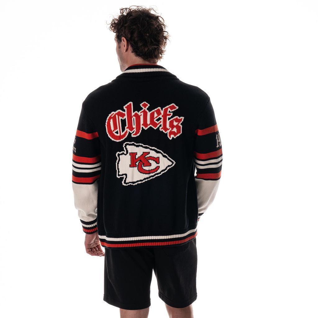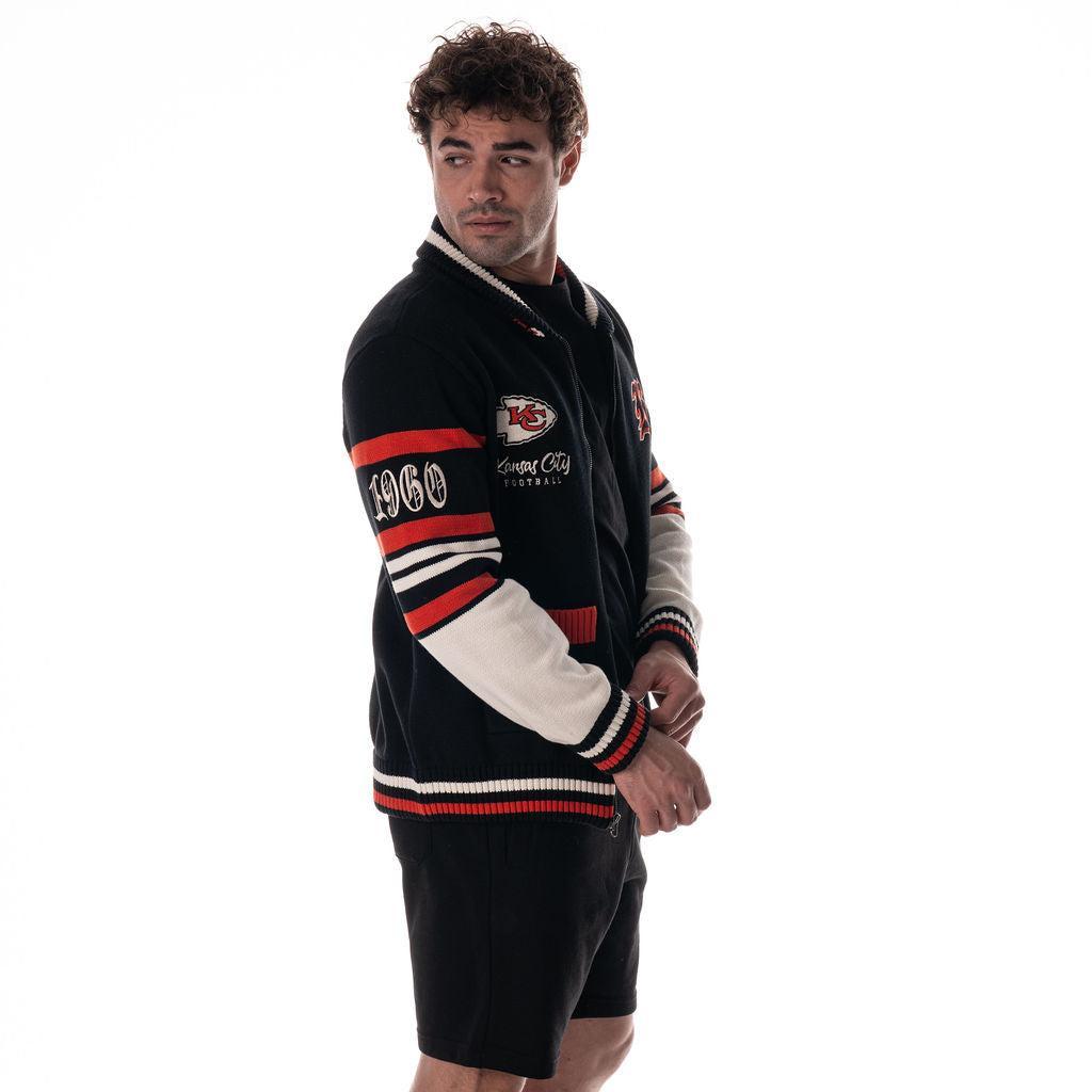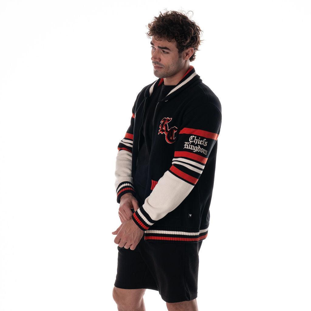 Rep the Kingdom with bold knit details. This Kansas City Chiefs jacquard sweater features a full-zip front and premium woven graphics that showcase team pride from every angle. The black base is accented with red and white striping on the sleeves and hem, while oversized Chiefs logos and wordmarks on the chest, arms, and back make a powerful statement. Built in a midweight knit, it’s the perfect layering piece for game day or casual wear.