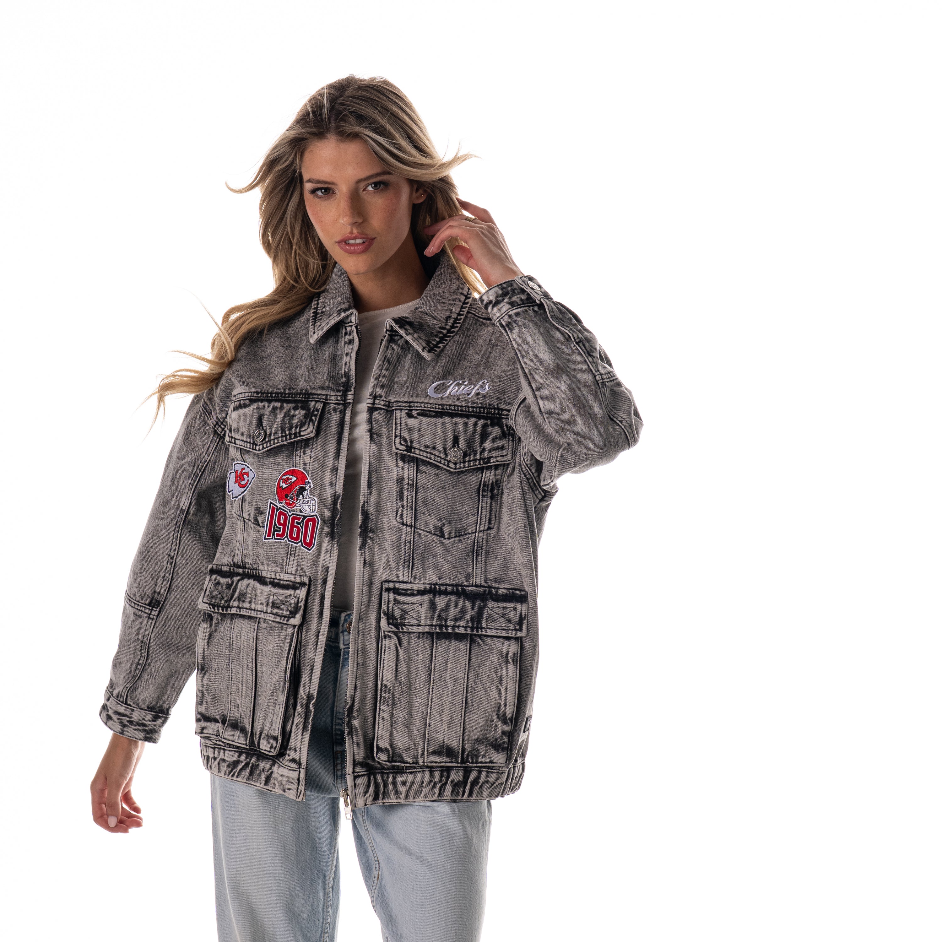 Show your team pride with this Chiefs denim jacket. Designed in a washed grey finish with bold patches on the chest and an oversized back logo, it’s the ultimate game day layer.