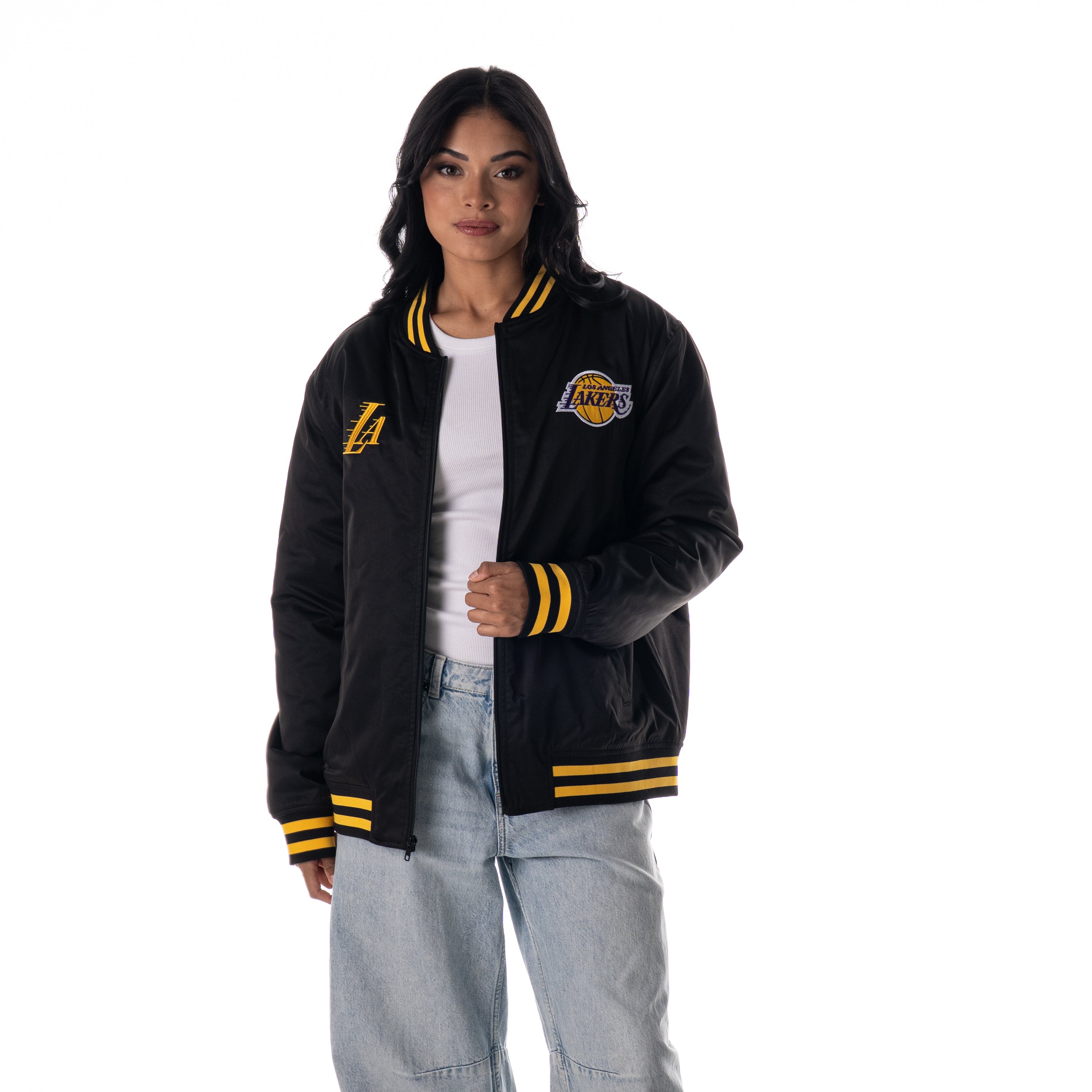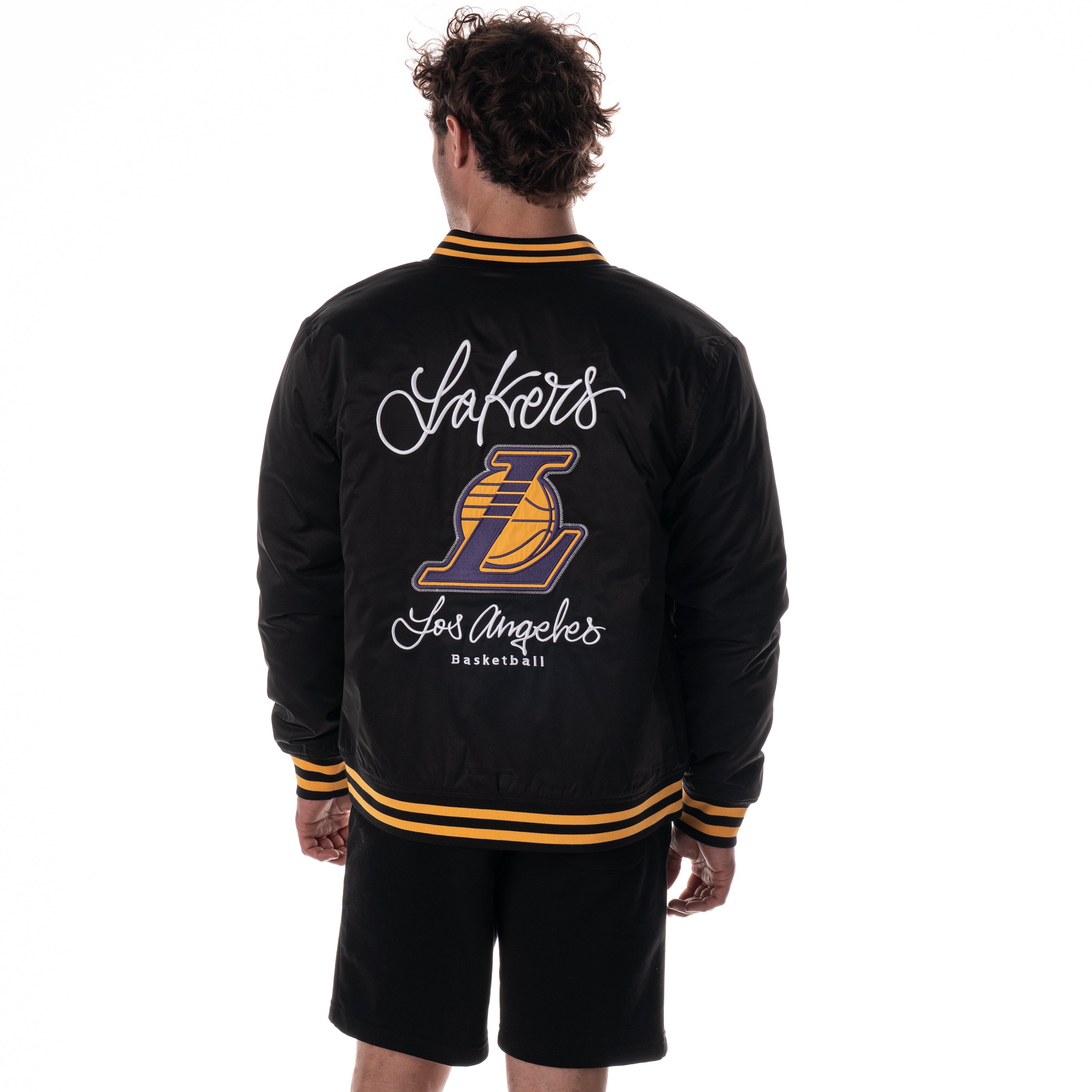 This black nylon bomber features bold team hits on the chest and a large Lakers logo on the back, finished with yellow-striped ribbing for that signature look. Easy to style and built for year-round wear.
