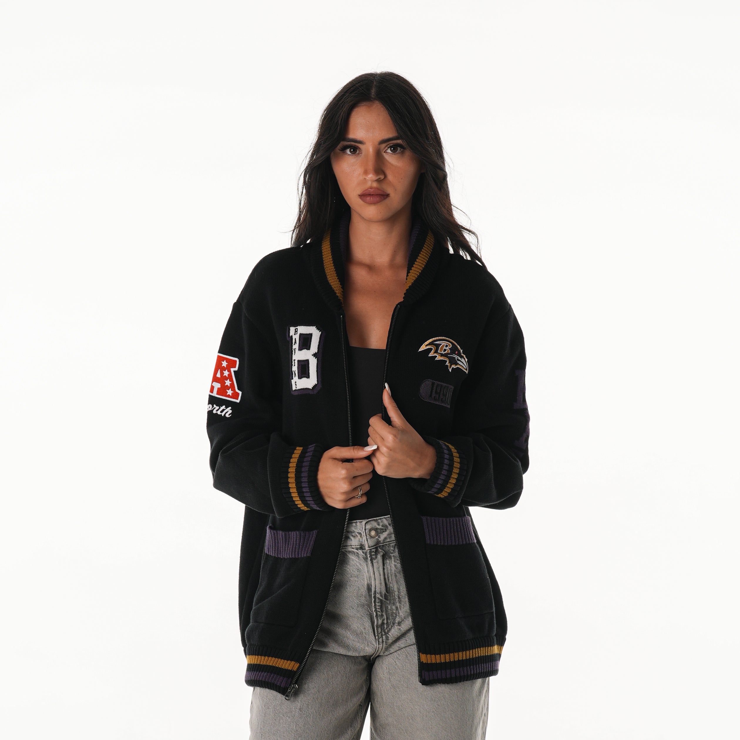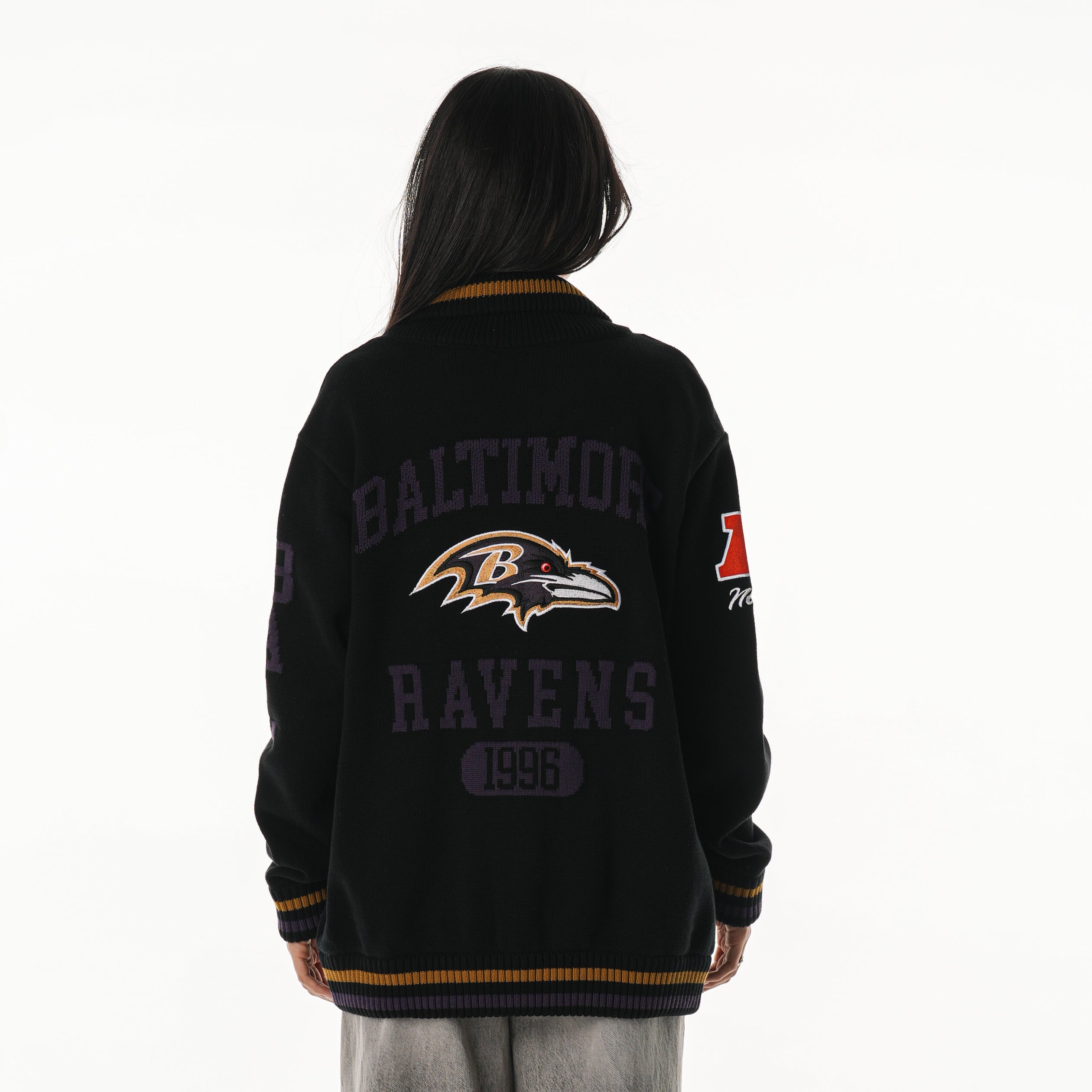 Rep your Ravens in standout style with this heavyweight jacquard knit sweater. Designed with a zip front and bold woven graphics, it features Baltimore’s logo and founding year across the back, plus team details on the chest and sleeves. Finished with striped ribbed trim for a classic varsity-inspired edge.