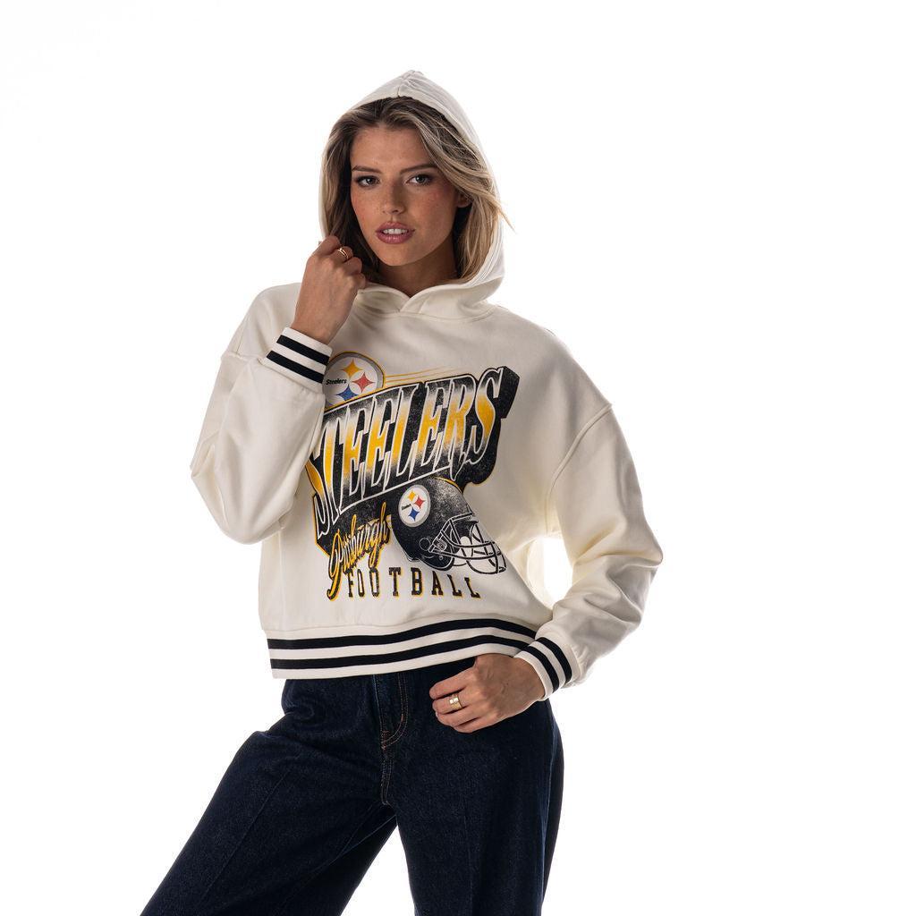 This cropped hoodie features a bold, vintage-inspired Steelers graphic across the front and a striped hem and cuffs that nod to classic varsity styles. Designed in a soft off-white tone with a relaxed fit, it’s a standout layer you can throw on for game day or any day.