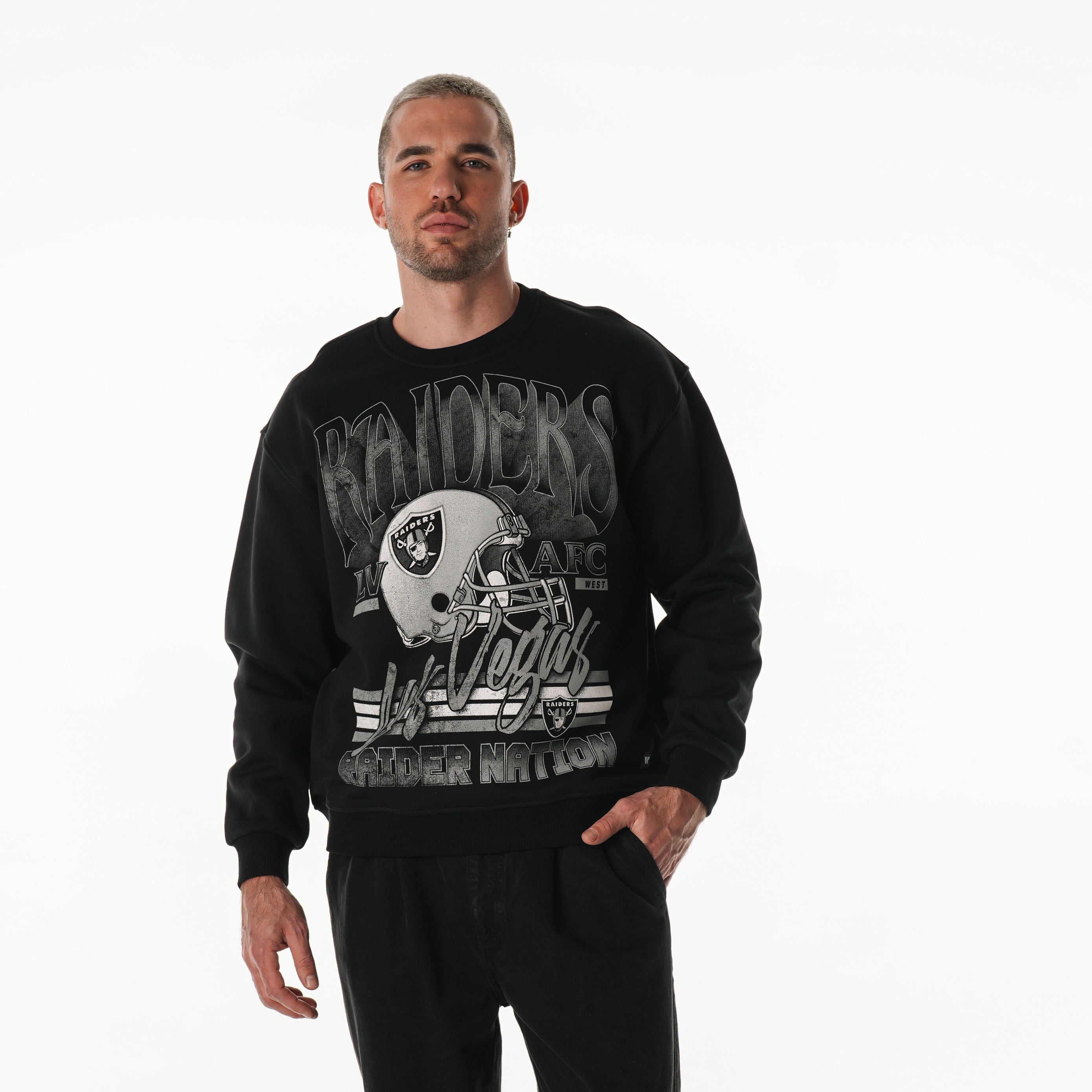 This Las Vegas Raiders crew fleece brings the heat with a statement front graphic featuring the iconic Raiders helmet, Las Vegas script, and “Raider Nation” callout. Designed in a classic black colorway with a vintage-style print, this midweight fleece layers easily for a full-season fit that stands out from the crowd.