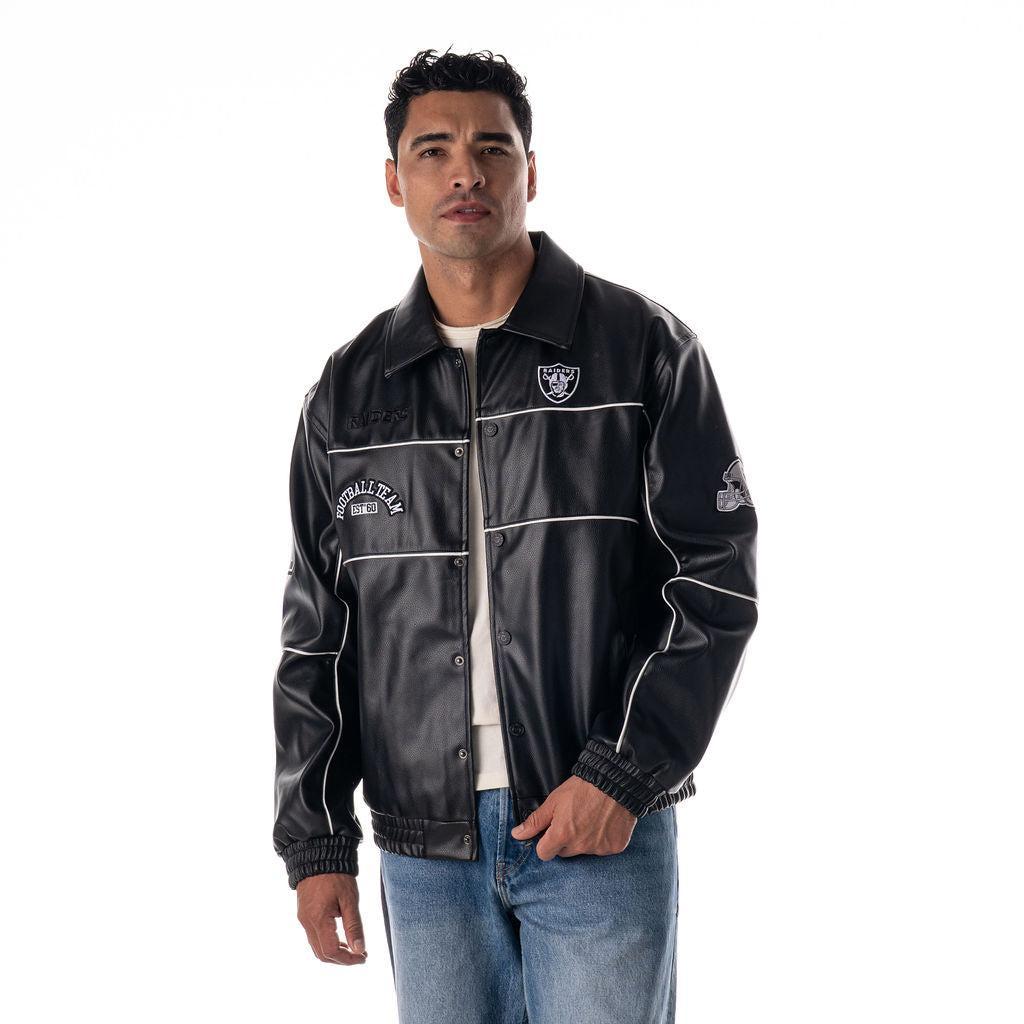 This Raiders faux leather racing jacket features sleek piping, and patch graphics. Finished with elastic cuffs and hem for a fitted, motorsport-inspired silhouette.