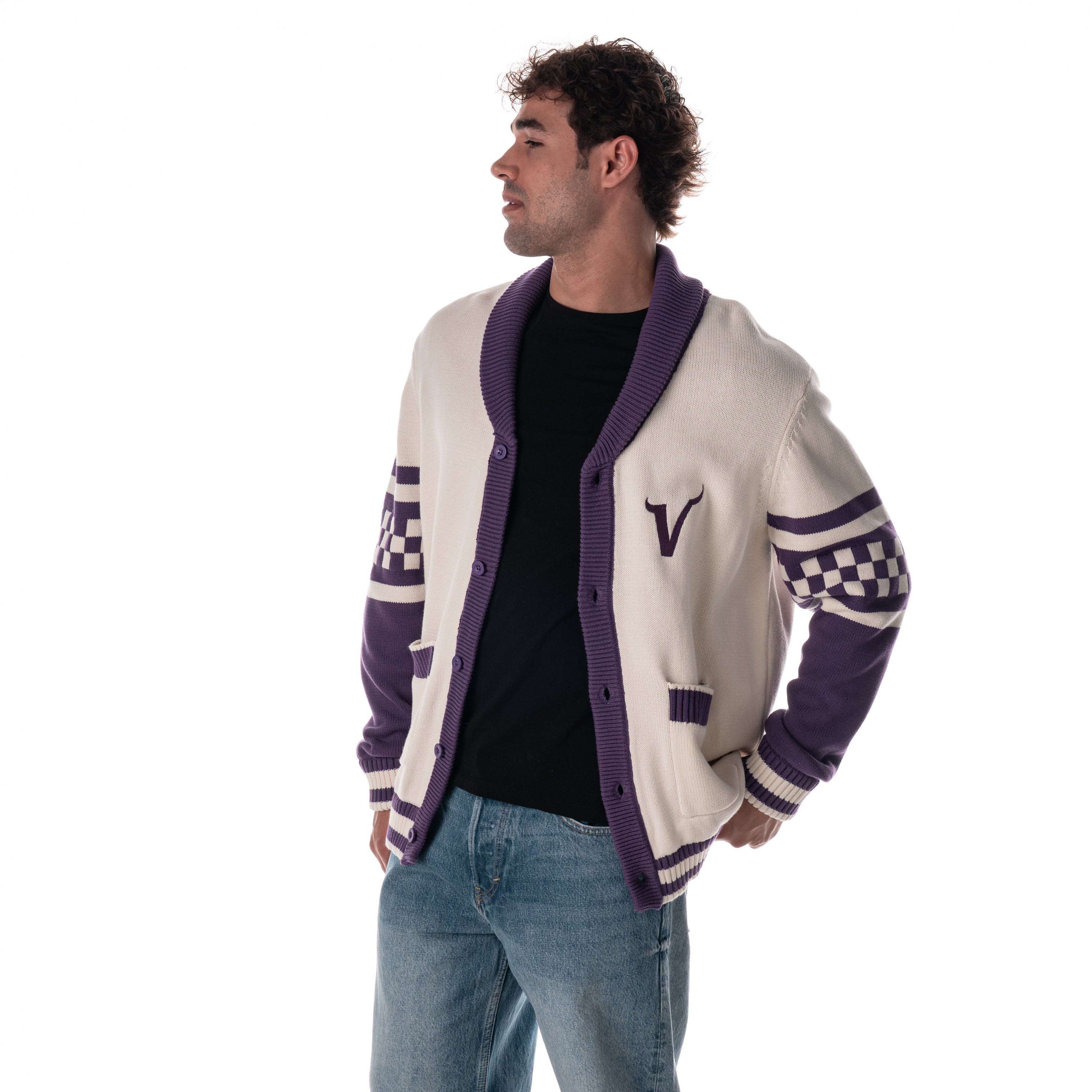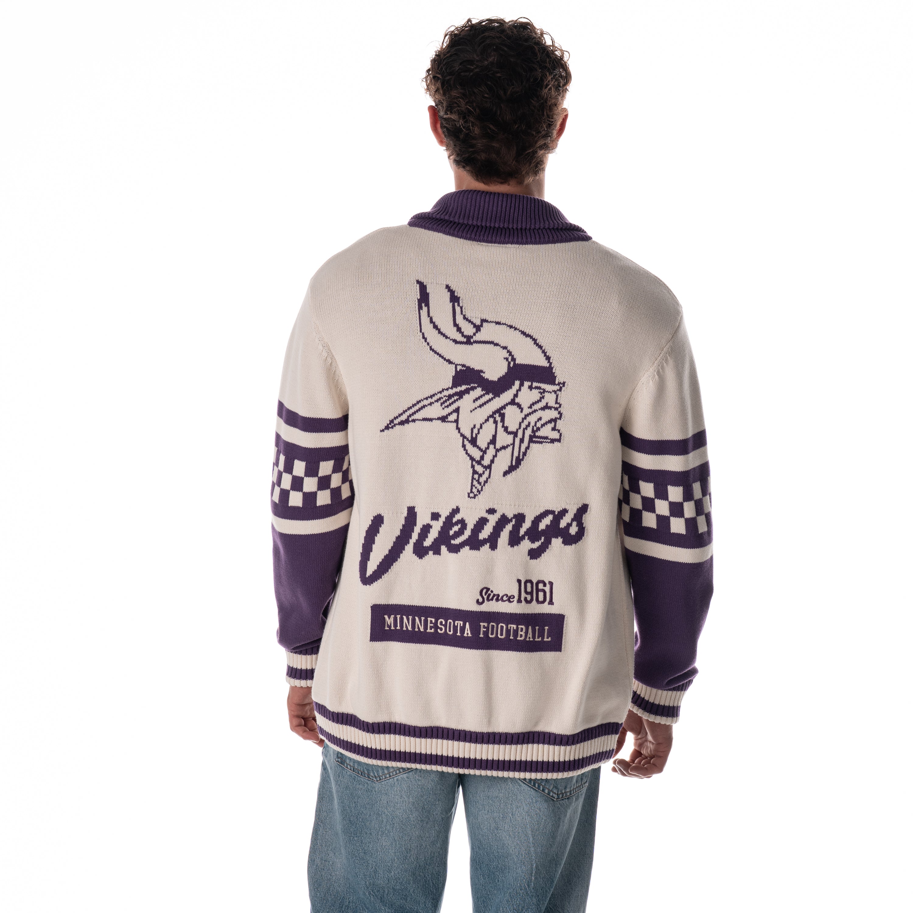 Rep your team in standout style with this Minnesota Vikings jacquard button-up sweater. Designed in a cream base with bold purple accents, it features checkered sleeve detailing, a front “V” logo, and a large Vikings graphic across the back. The ribbed shawl collar and button-up front add structure, while the cozy knit makes it perfect for layering all season long. Whether you’re at U.S. Bank Stadium or watching from home, this piece brings vintage-inspired energy to your game day lineup.