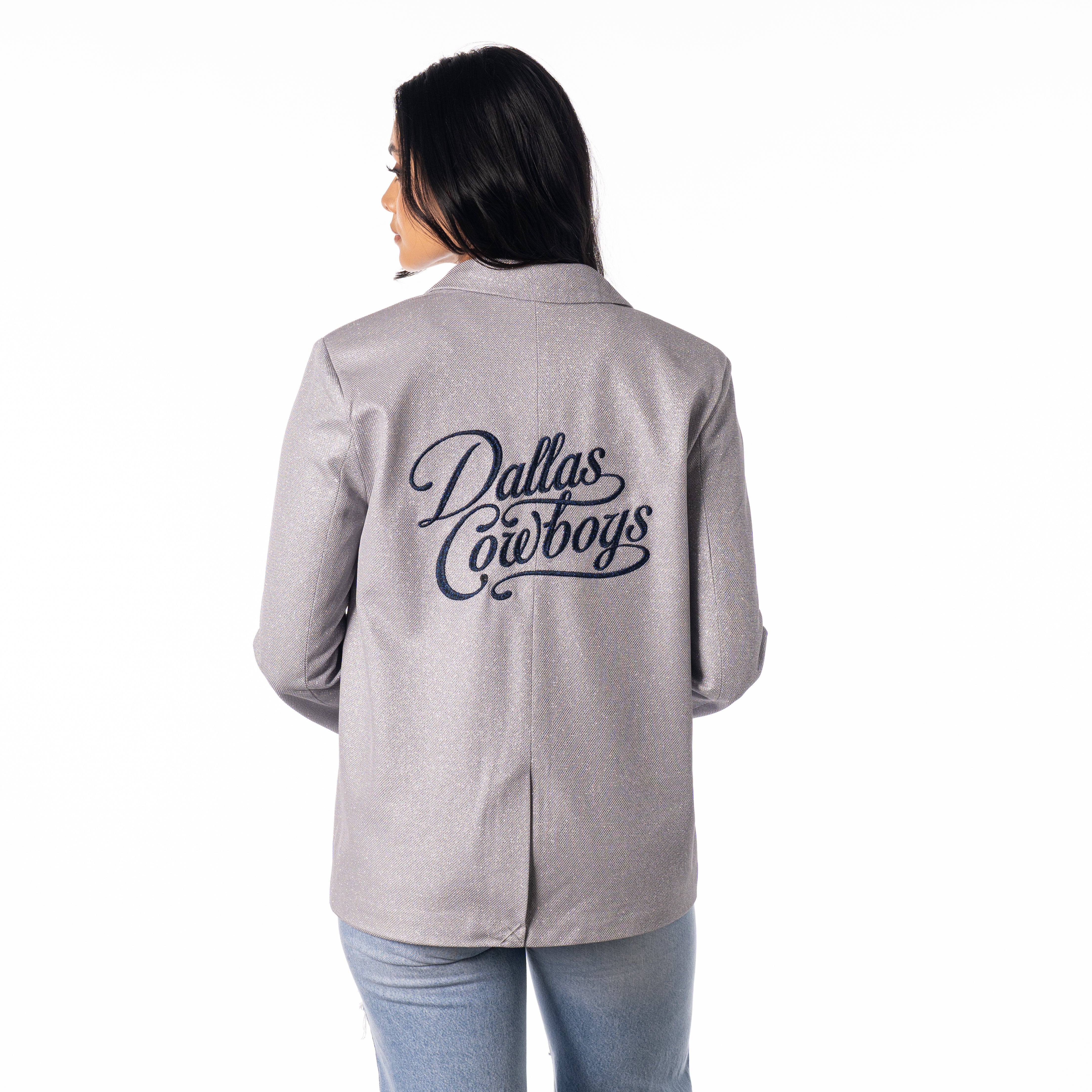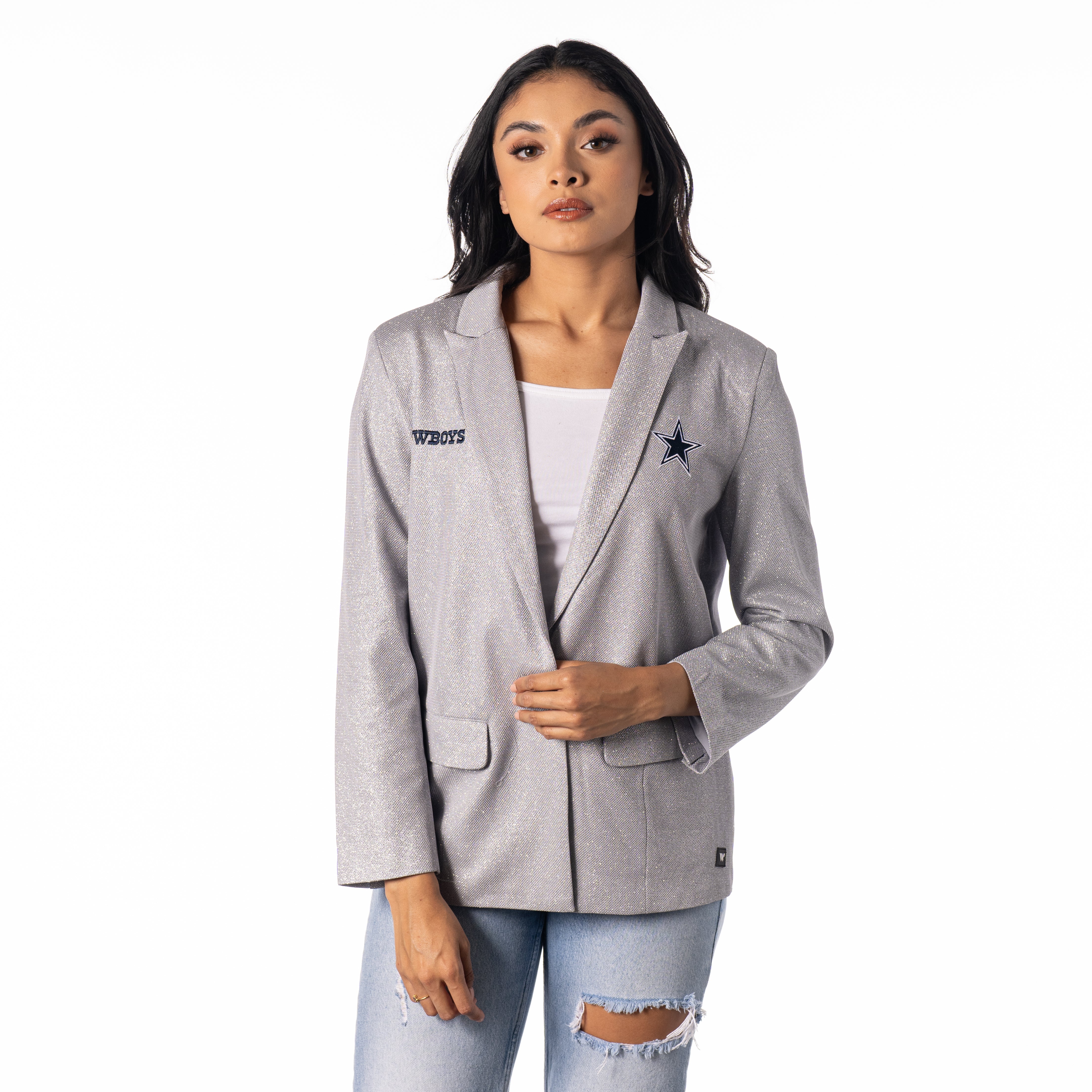 Game day, but make it fashion. The Dallas Cowboys Glitter Blazer brings the sparkle without sacrificing edge—featuring a tailored fit, subtle silver shimmer, and bold embroidered team graphics front and back. Dress it up, layer it down—either way, you're repping America's Team in style.