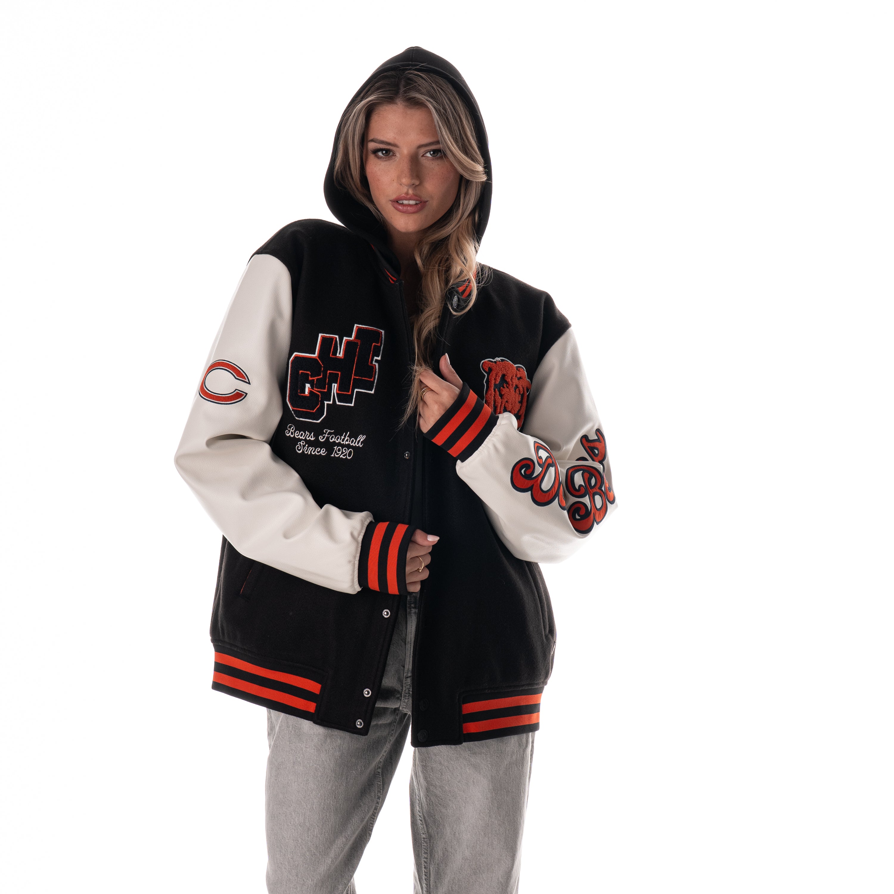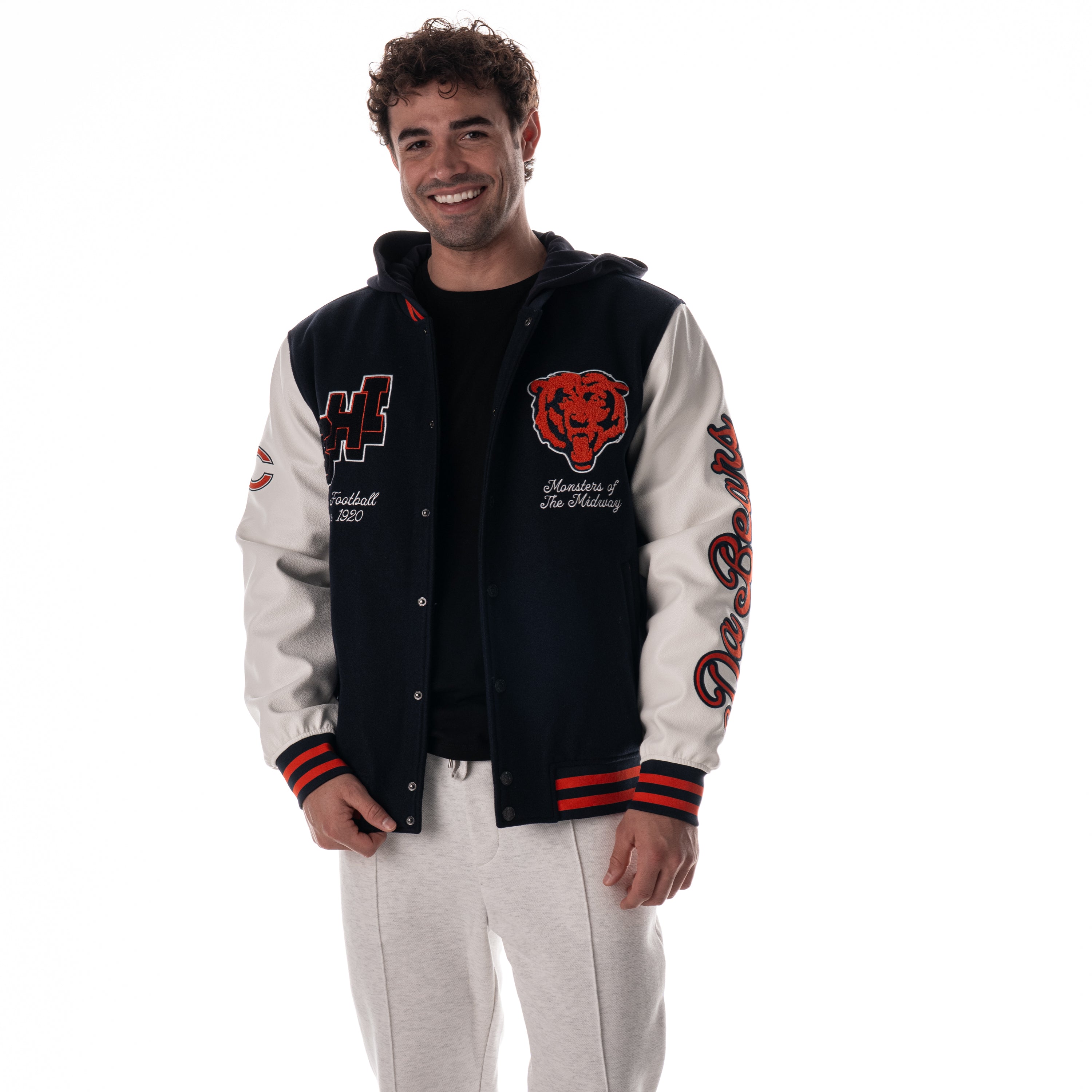 Rep the Bears in this hooded varsity jacket, built in navy with contrast white sleeves and bold red details. Oversized back graphics and front patches highlight Chicago pride, while the hood adds an edge to the classic varsity look.