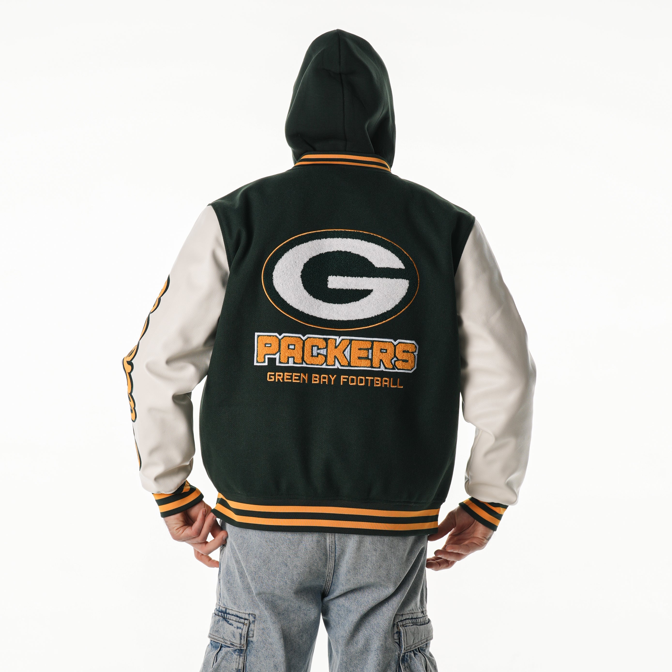 Stand out on game day with this Green Bay Packers hooded varsity jacket. Designed in the team’s signature green with contrasting white sleeves, it features chenille and embroidered patches throughout, including oversized Packers logos on the chest, back, and sleeves. A detachable hood adds versatility, while striped ribbed trim and snap-button closure give it that classic varsity look. Bold and timeless, this jacket is perfect for repping your team.