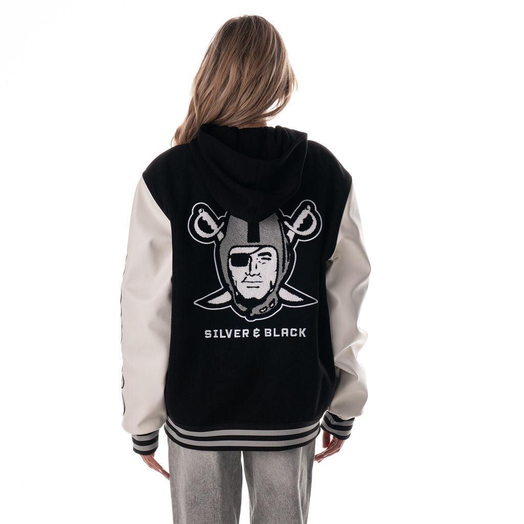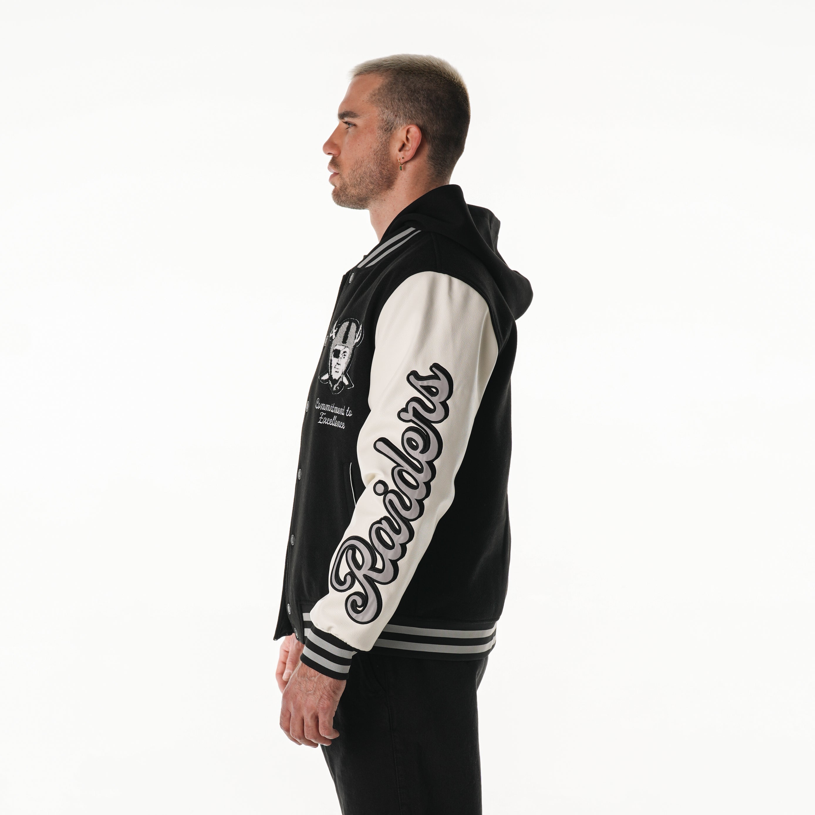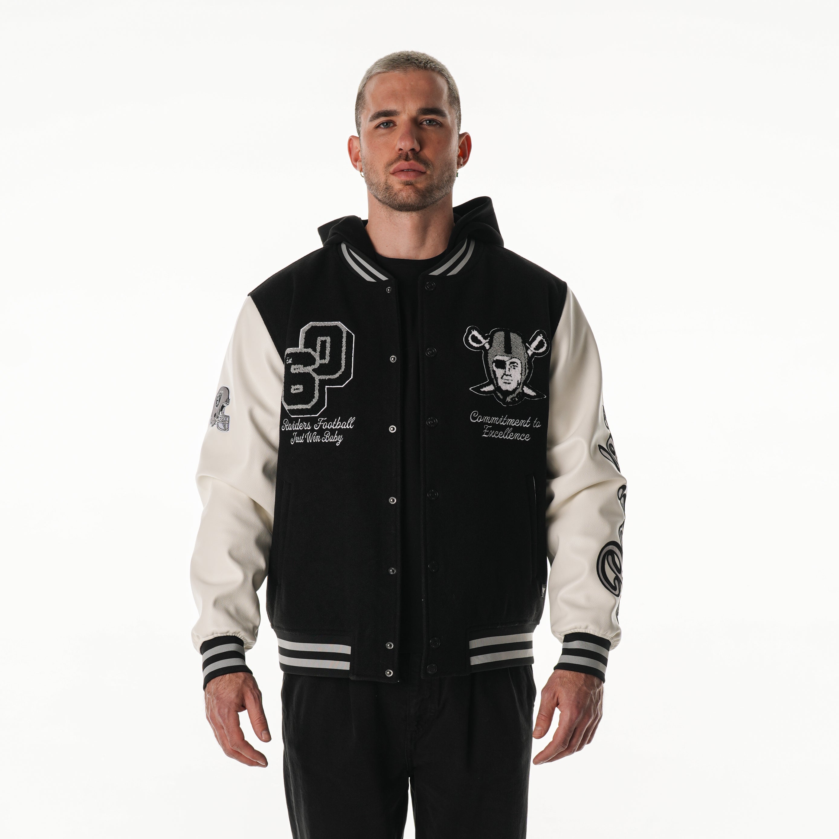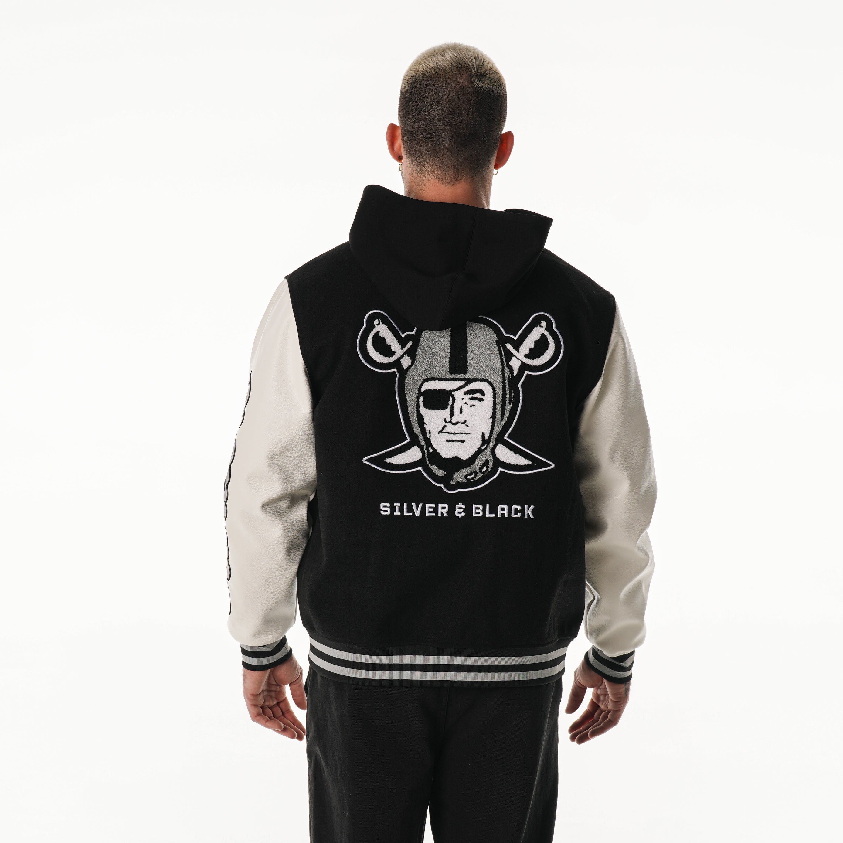Show your loyalty to the Silver & Black in standout style. This Las Vegas Raiders hooded varsity jacket brings a modern twist to classic fan gear, blending vintage varsity vibes with bold embroidered graphics across the front, back, and sleeves. Featuring Raiders helmet patches, script embroidery, and a luxe wool body with faux leather sleeves, it's the kind of piece that speaks volumes—whether you're at Allegiant Stadium or out on the street. The removable hood adds extra versatility, while the premium materials keep it warm and structured.