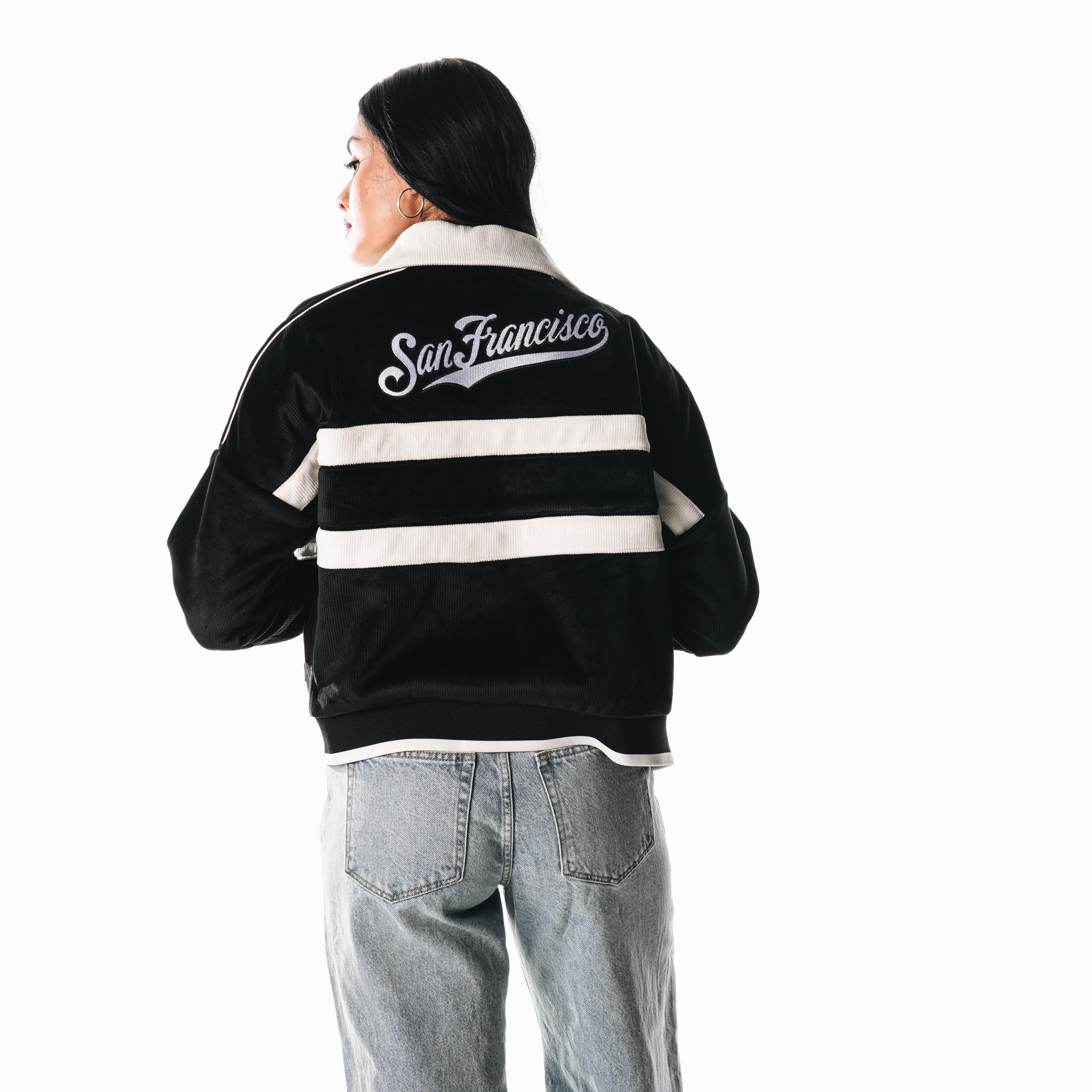 Featuring a plush black corduroy shell with cream panel accents and embroidered team details, this funnel neck bomber offers a bold yet elevated edge. The zip front, structured collar, and retro varsity silhouette make this a standout staple for layering up in style.