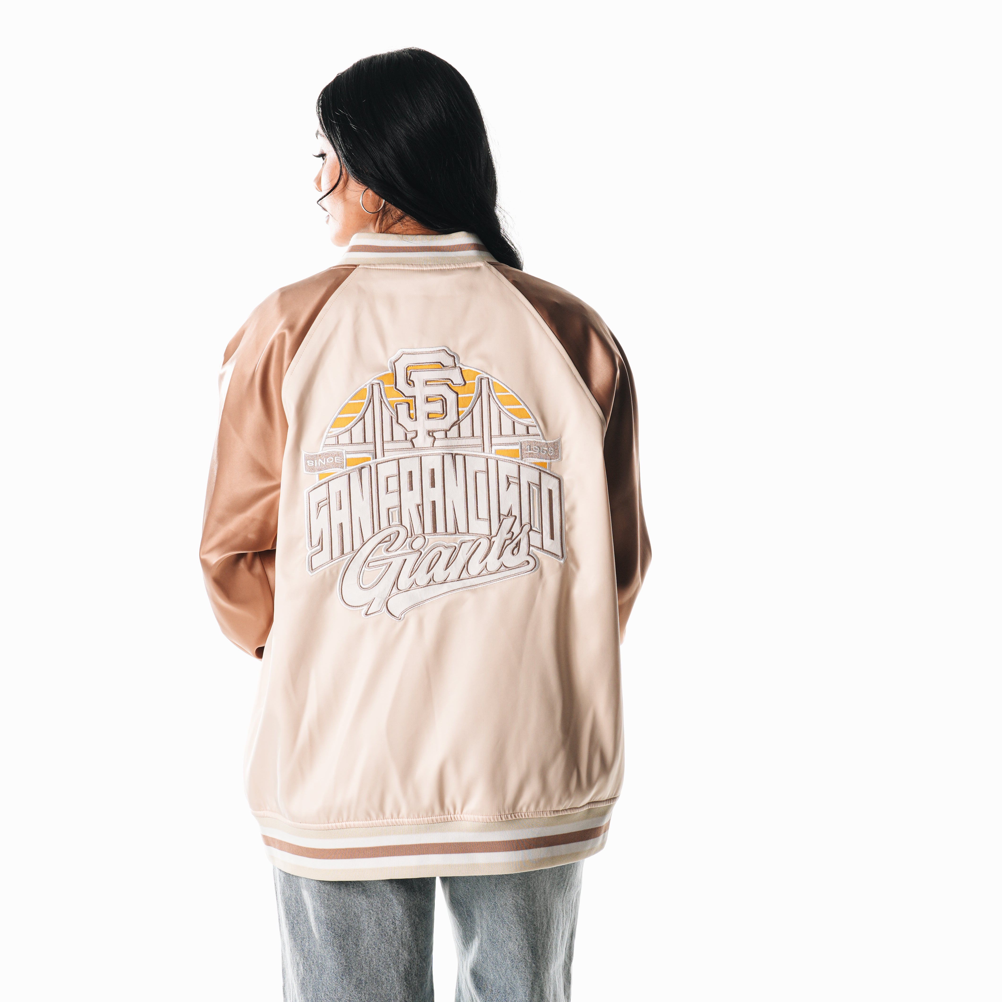 Where West Coast heritage meets elevated game day style. This cream bomber with light brown raglan sleeves reps the Giants with a tonal front logo and oversized back embroidery featuring a golden bridge and skyline-inspired detailing. Classic striped ribbing ties it all together.