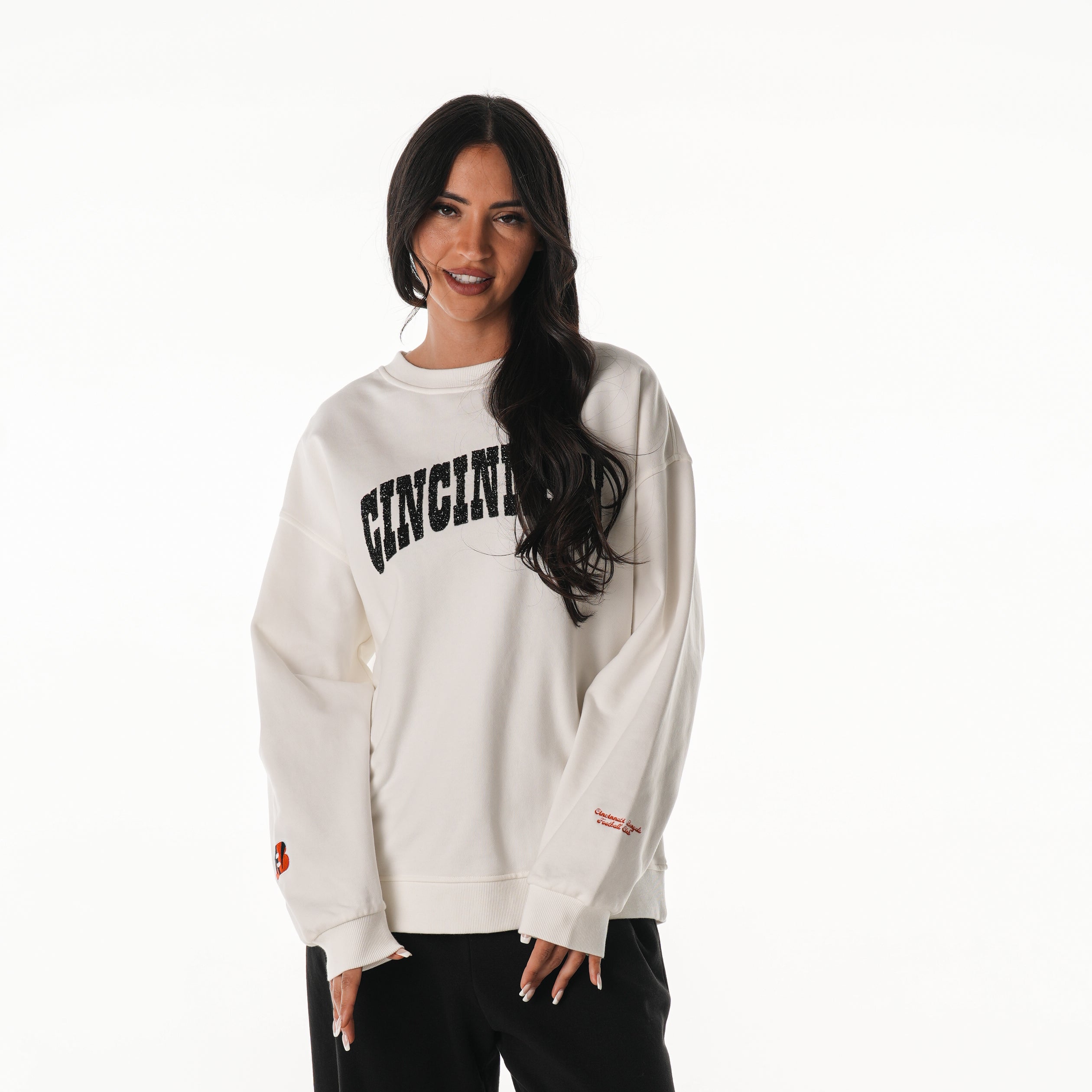 Rep the Bengals in standout style with this crew neck fleece featuring bold crystal rock “Cincinnati” lettering across the chest. Designed in crisp white with subtle team details on the sleeve, this piece brings comfort and a touch of shimmer to your game day look.