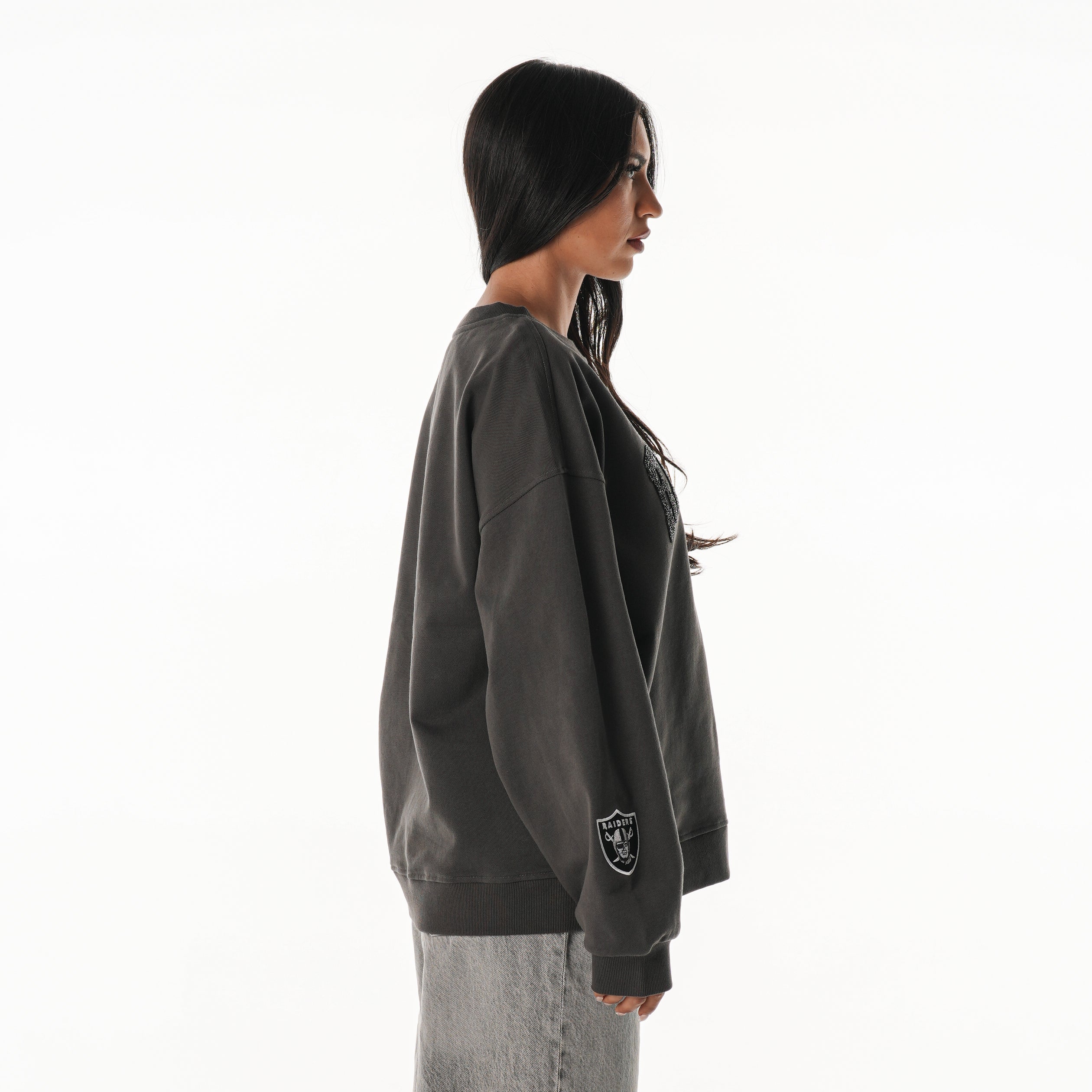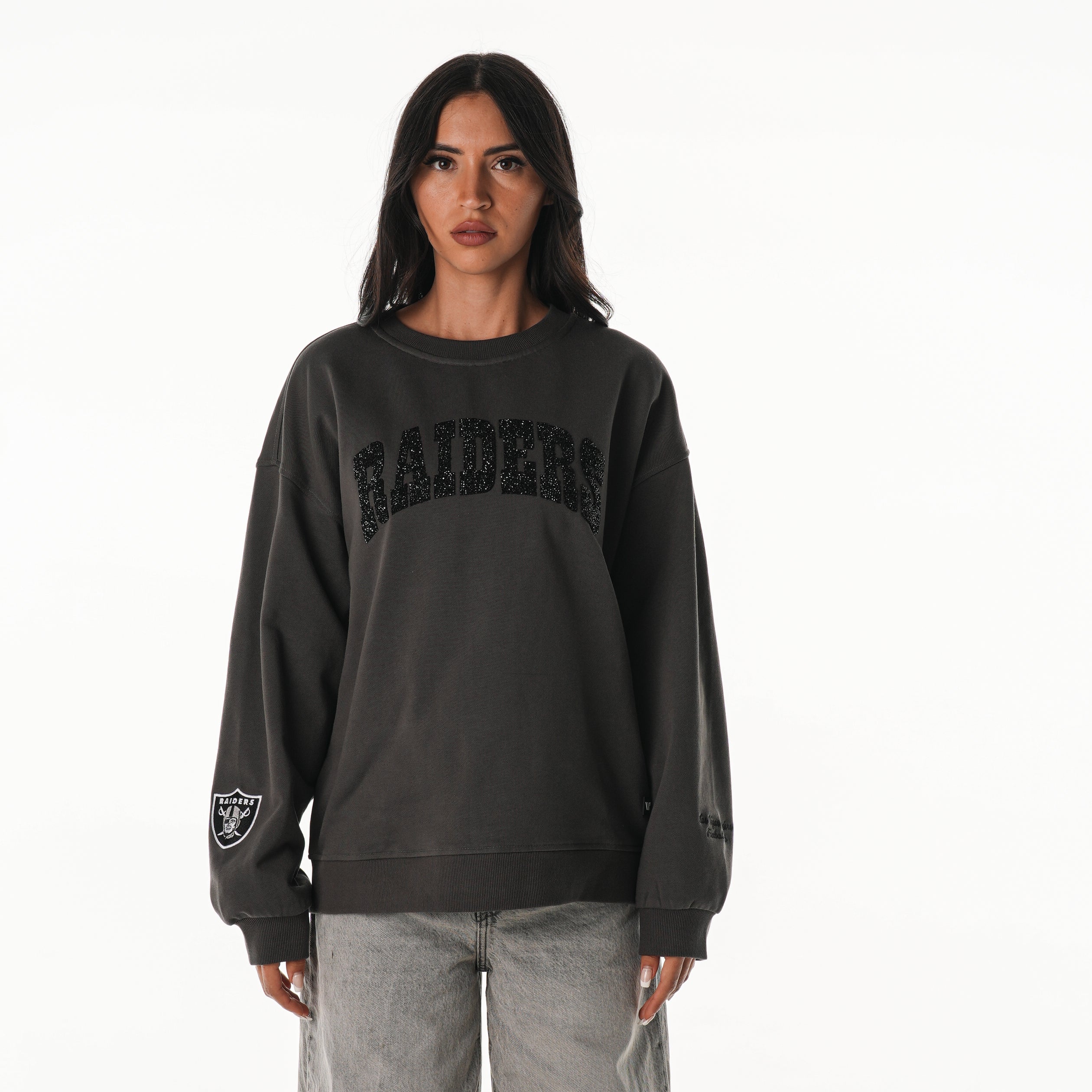 Turn up the shine. This Charcoal Oversized Crystal Rock Crew Fleece delivers elevated edge with all-over sparkle and bold team energy. Featuring tonal crystal embellishments that catch the light from every angle, this fleece blends oversized comfort with statement-level glam—perfect for standout looks on or off the field.