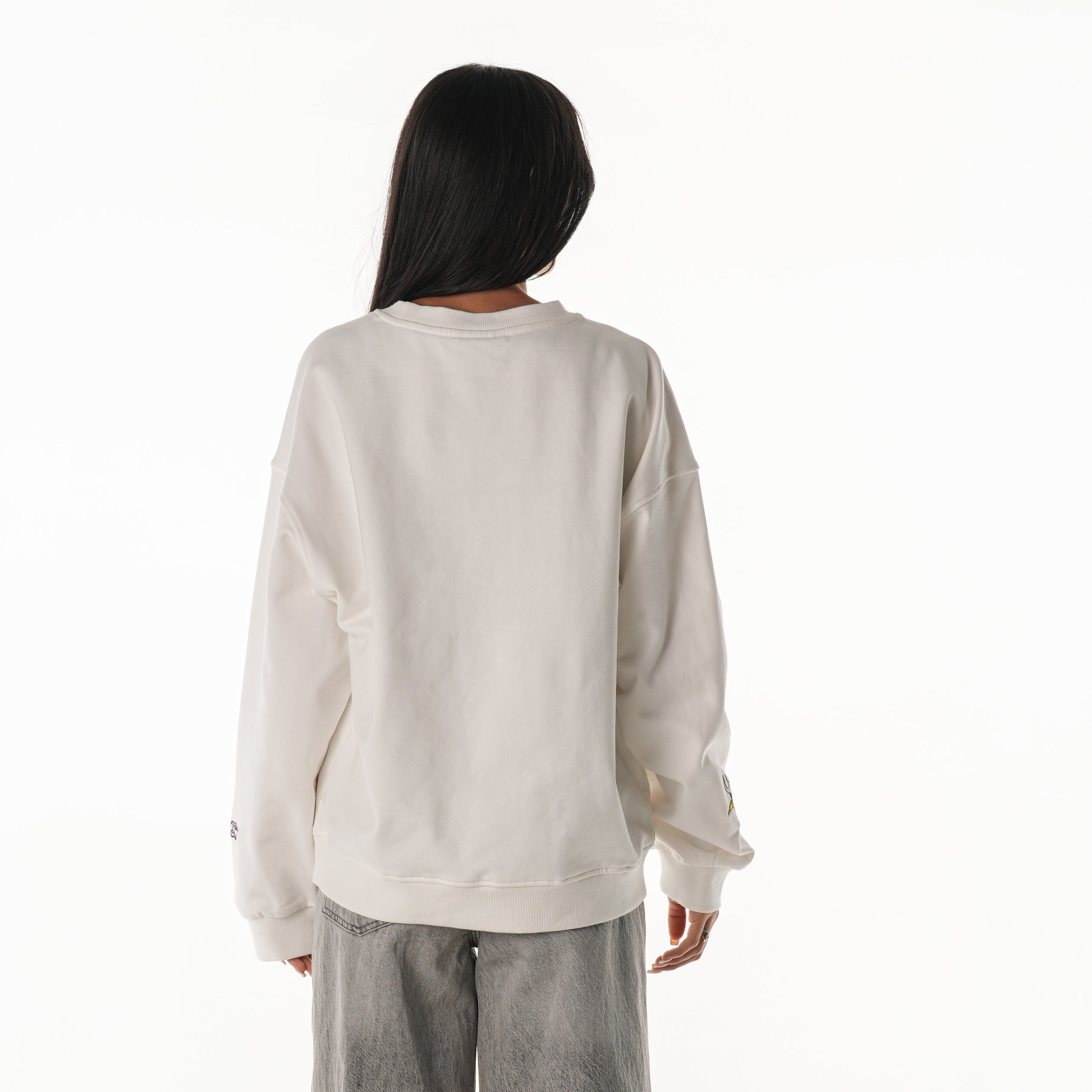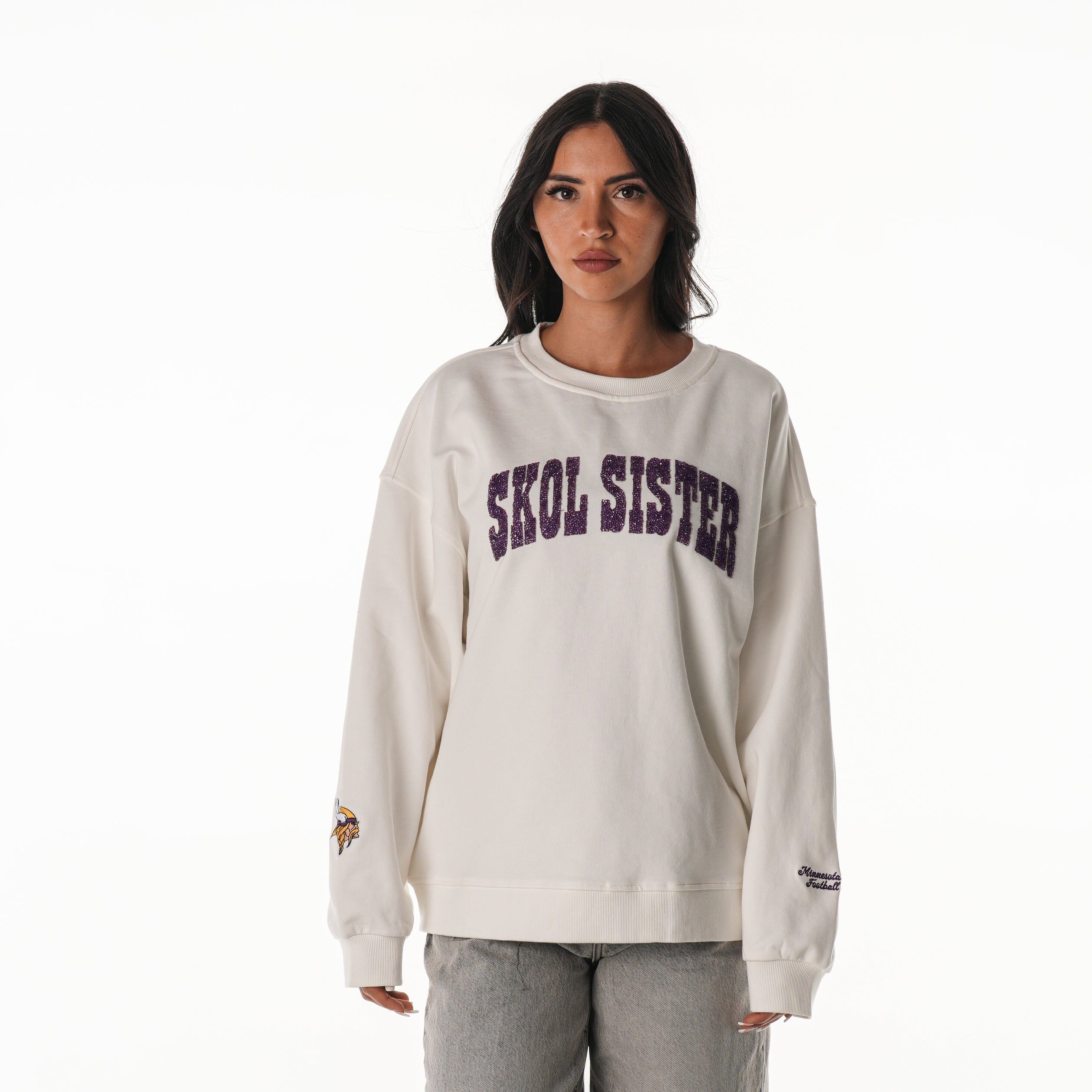 Rep the Vikings in this oversized crew fleece, featuring bold "SKOL SISTER" graphics on the front and team details on the sleeves. Designed in soft white fleece, it’s the perfect layer for game day or everyday wear.