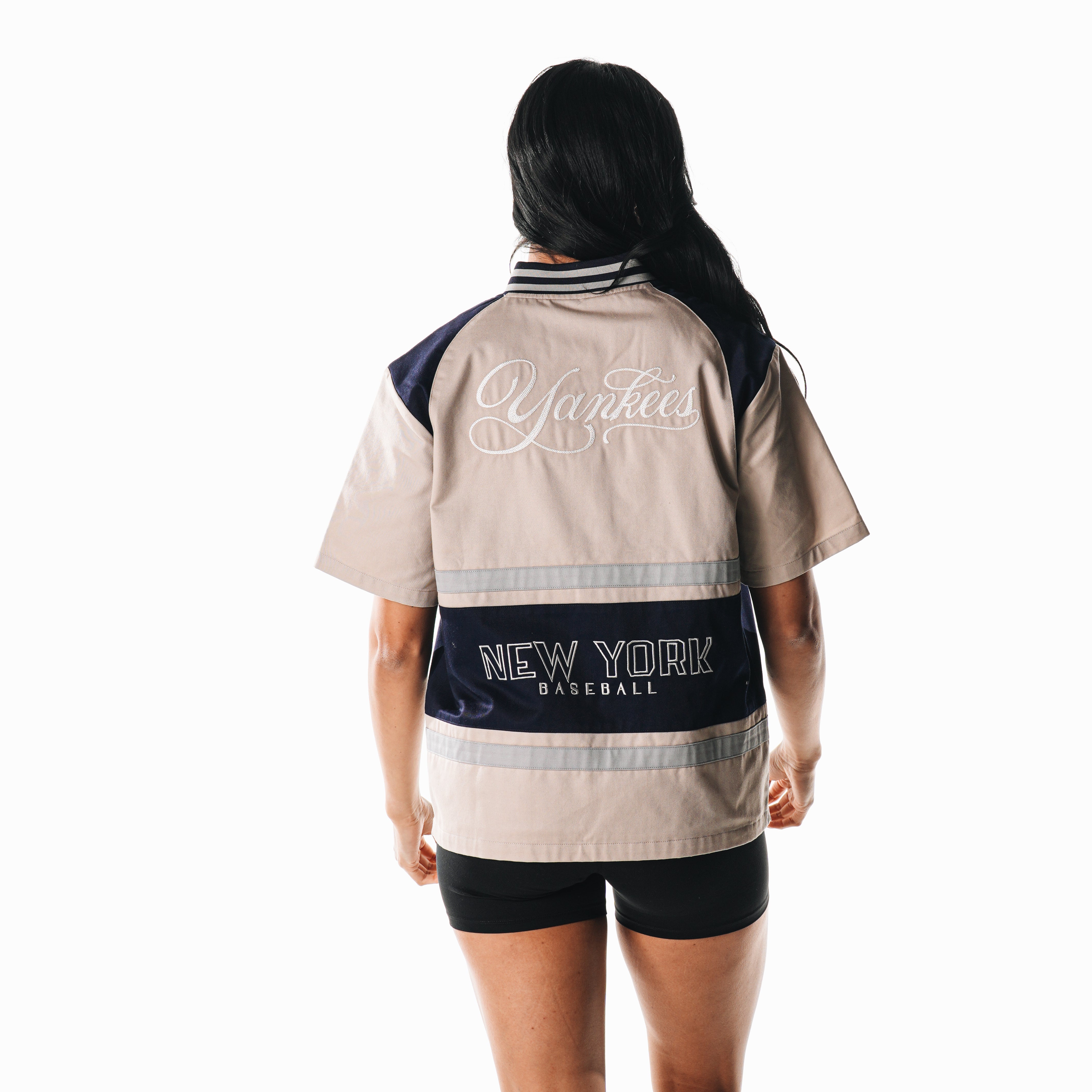 Rep the Bronx Bombers in bold style with the NY Yankees Racing Zip Up Tee. Featuring a cream body with navy paneling and silver striping, this short sleeve zip-up design showcases embroidered Yankees logos, “Bronx Bombers” script, and racing-inspired details. Lightweight and relaxed, it’s built for the stands, the streets, and everywhere in between.
