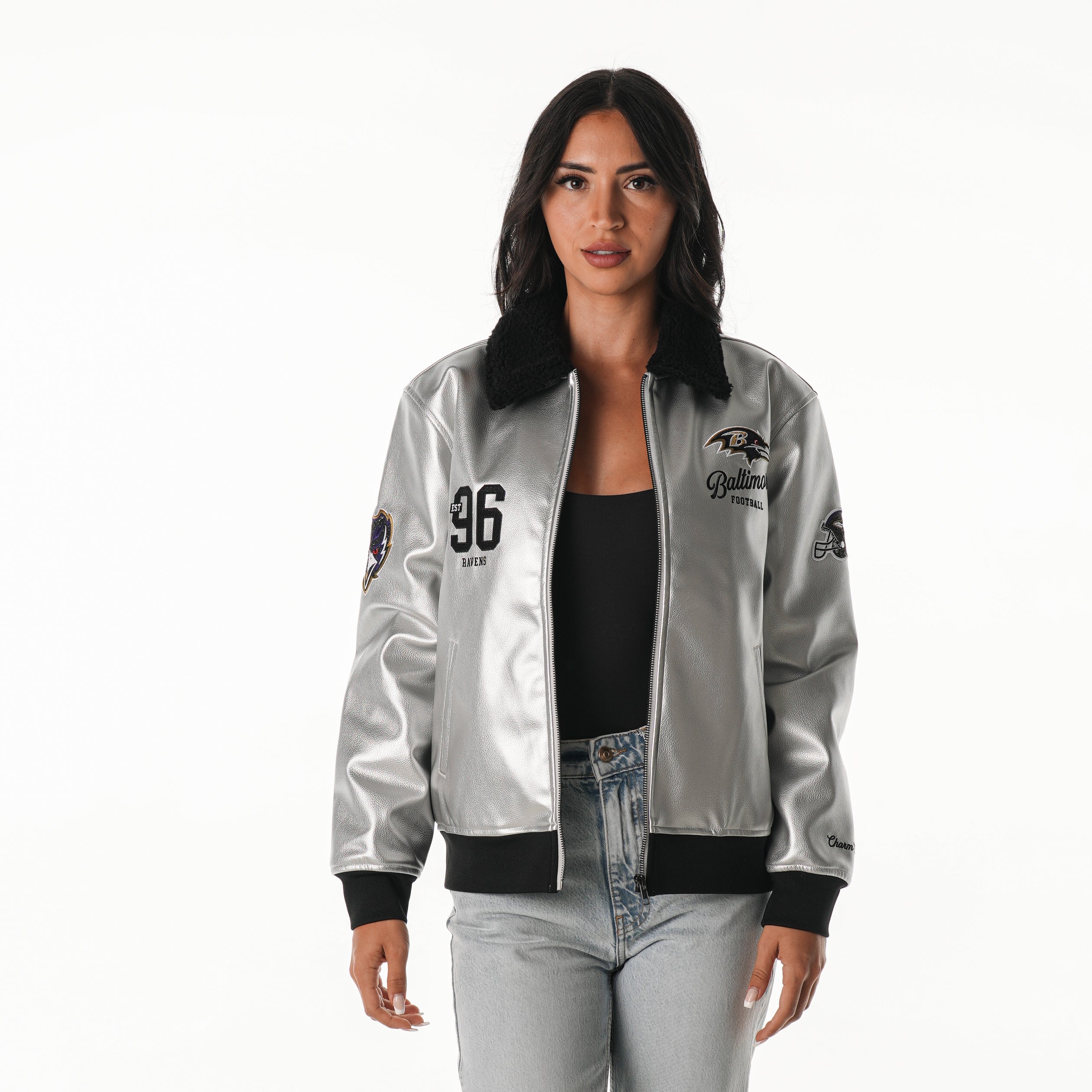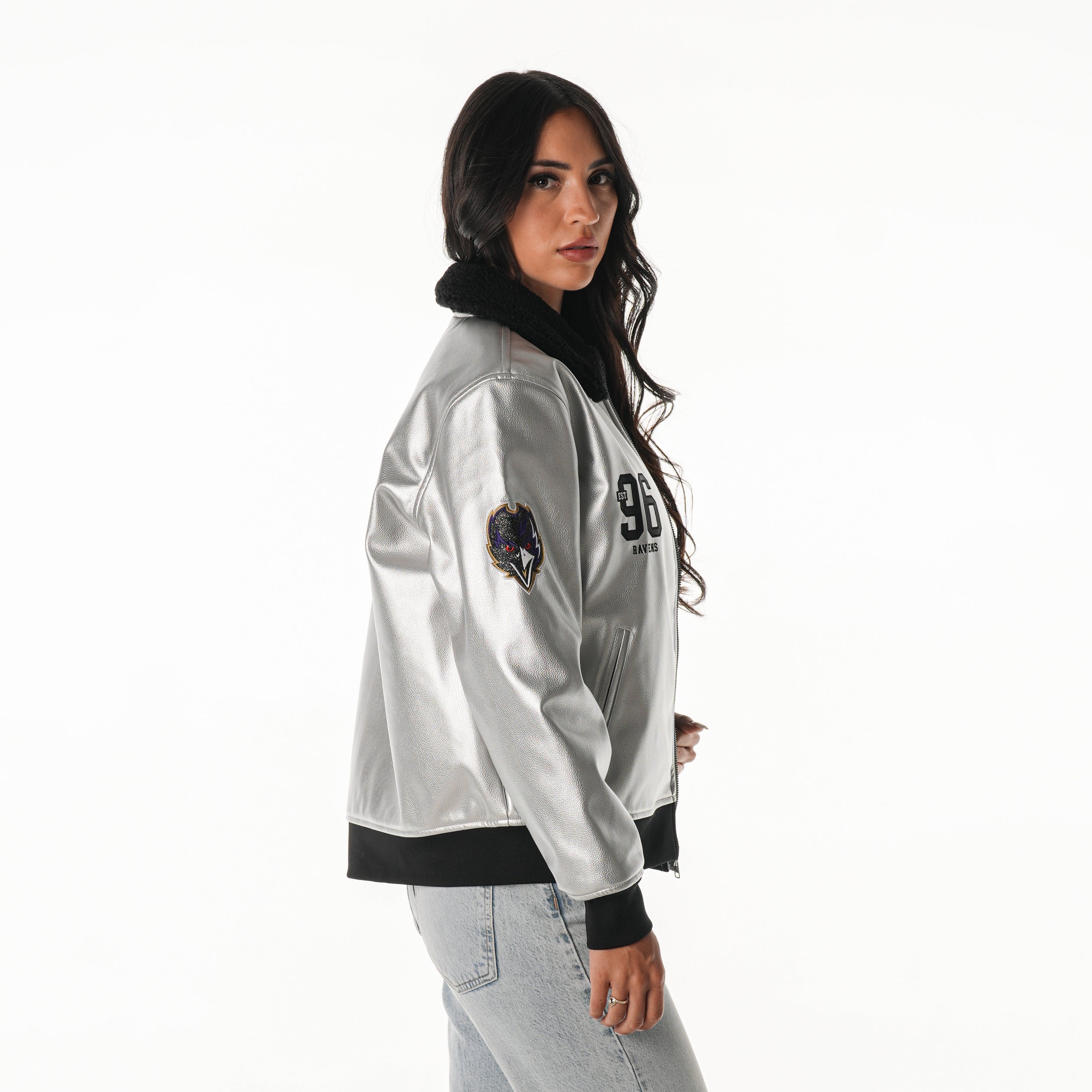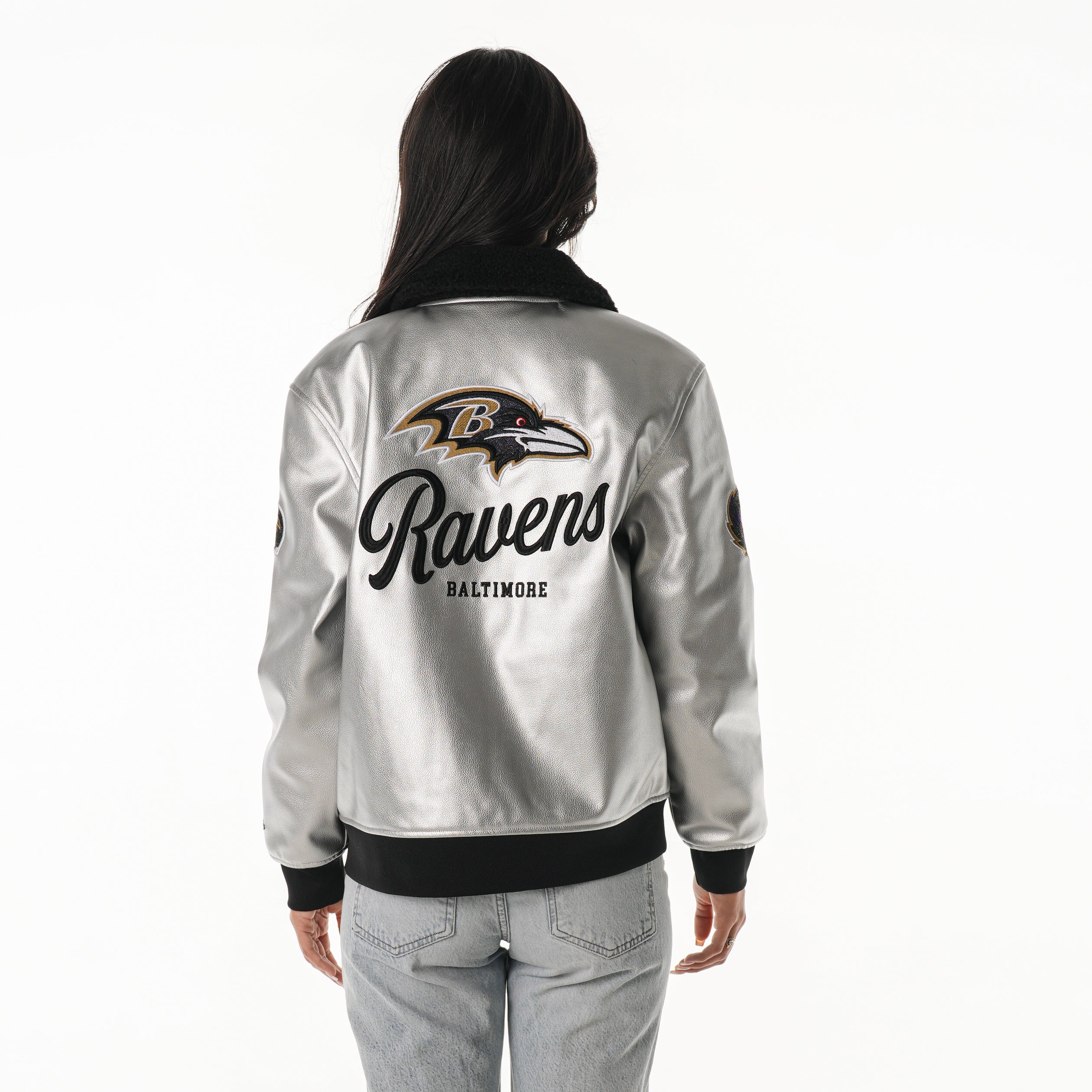 Bring the shine to game day with this Baltimore Ravens metallic bomber. The bold silver finish is matched with standout Ravens graphics on the chest, back, and sleeve, plus a contrast collar and cuffs that complete the look. A true statement layer for repping your team.