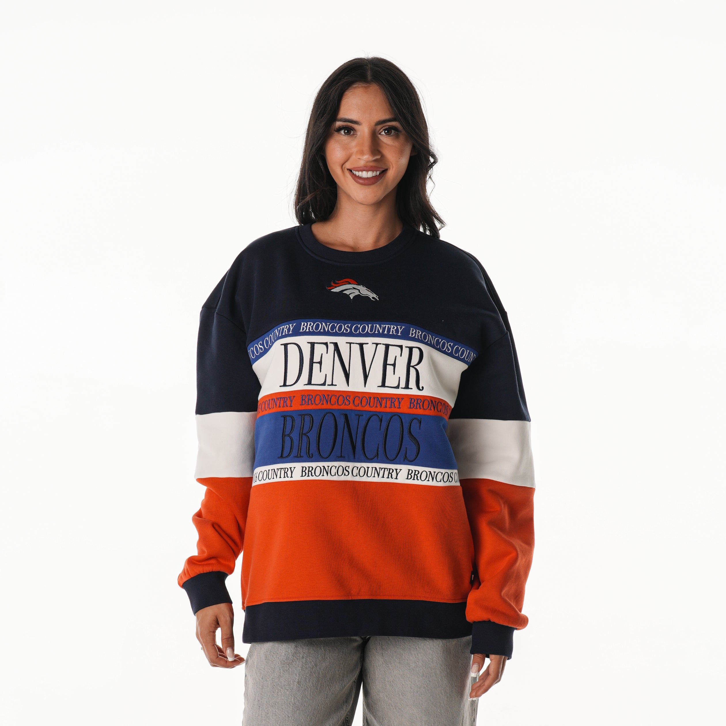 Stand out in bold Broncos style with this colorblock crew fleece. Designed with striking navy, orange, blue, and white panels, it features all-over “Broncos Country” striping across the chest, oversized Denver Broncos lettering, and the team logo for a statement look.