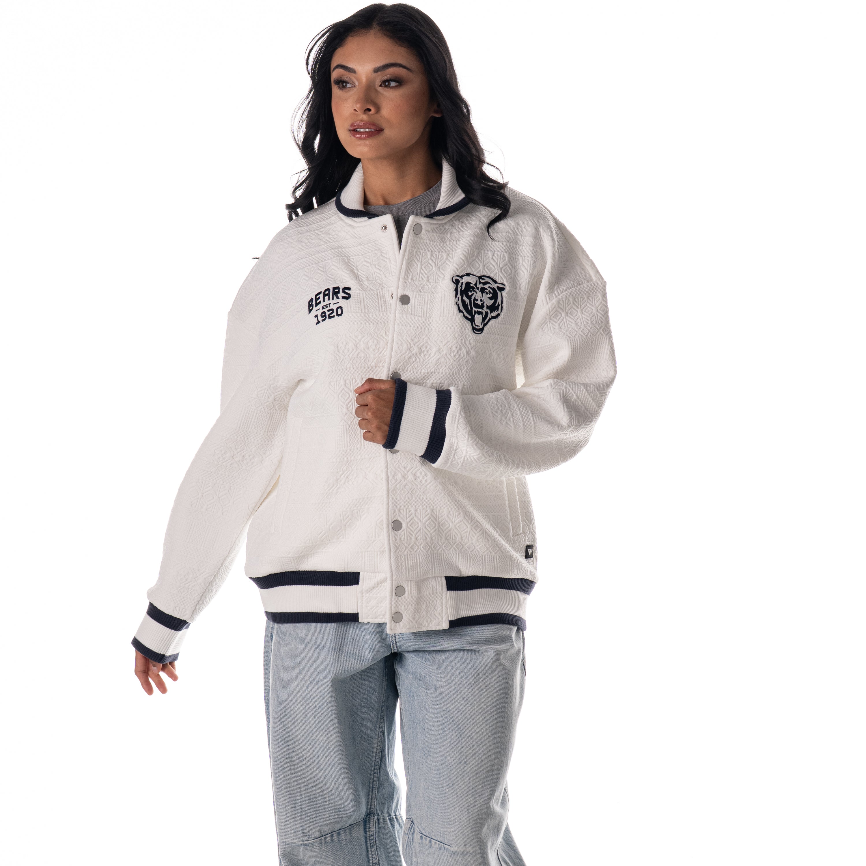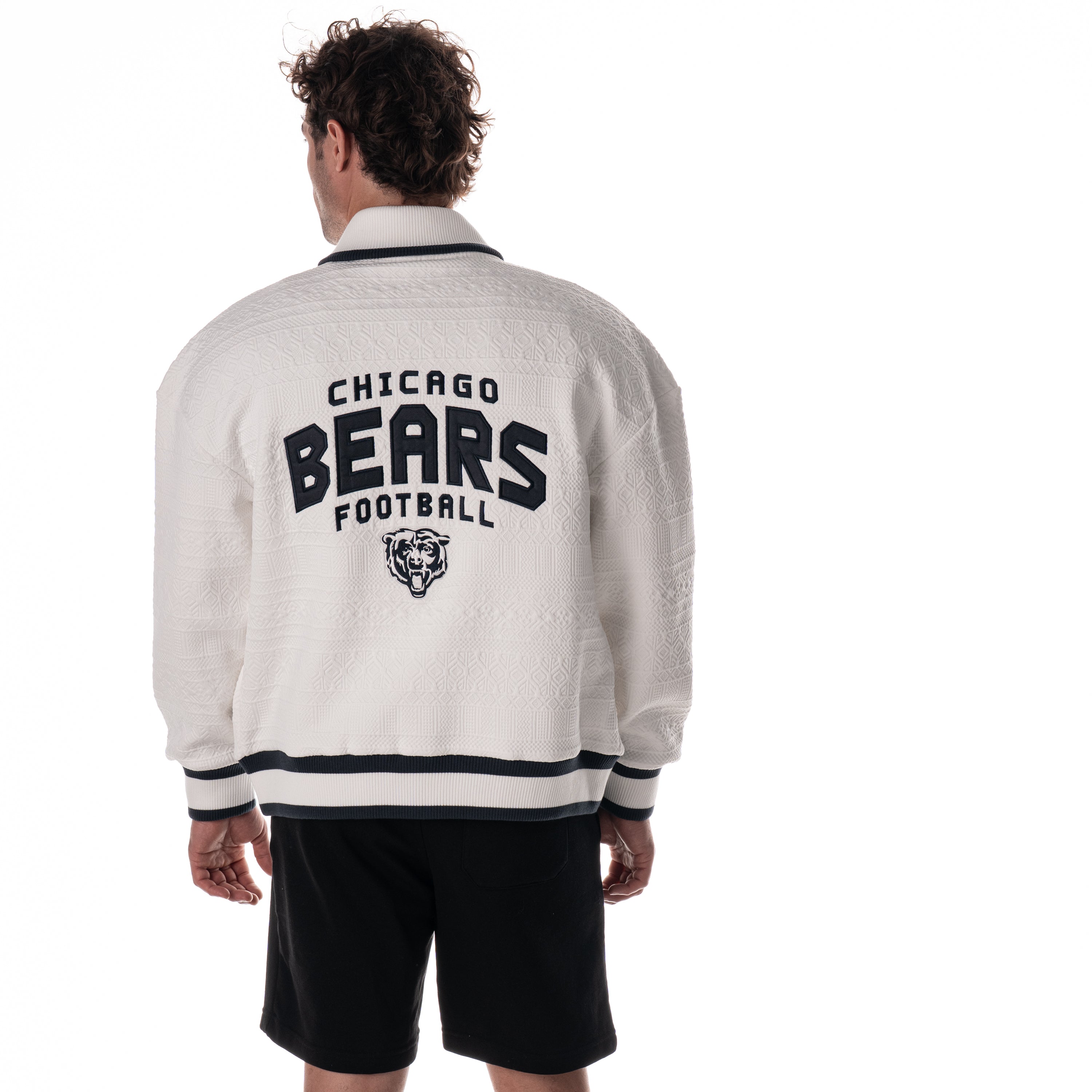 Classic cable knit bomber featuring Chicago Bears embroidery and striped ribbed trim. Designed in vintage white for a clean, timeless look.