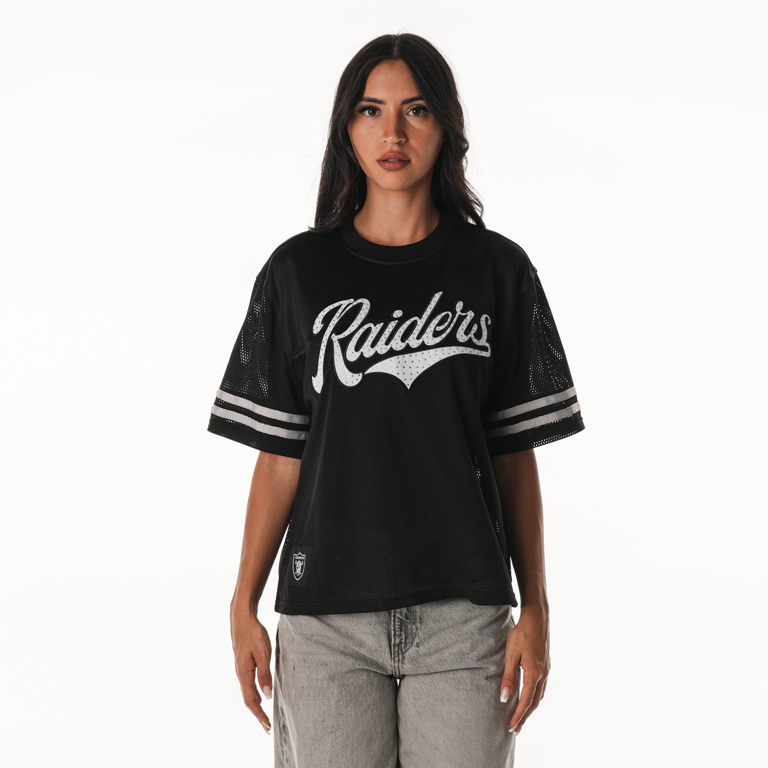 Rep your team with standout style. This Las Vegas Raiders mesh jersey is all about bold energy with a lightweight, breathable construction and crystal-studded "Raiders" script on the front. Featuring silver striped sleeves and a shimmering oversized back logo, it’s the ultimate mix of glam and game day grit. The boxy fit keeps things effortlessly cool whether you're in the stands or on the street.