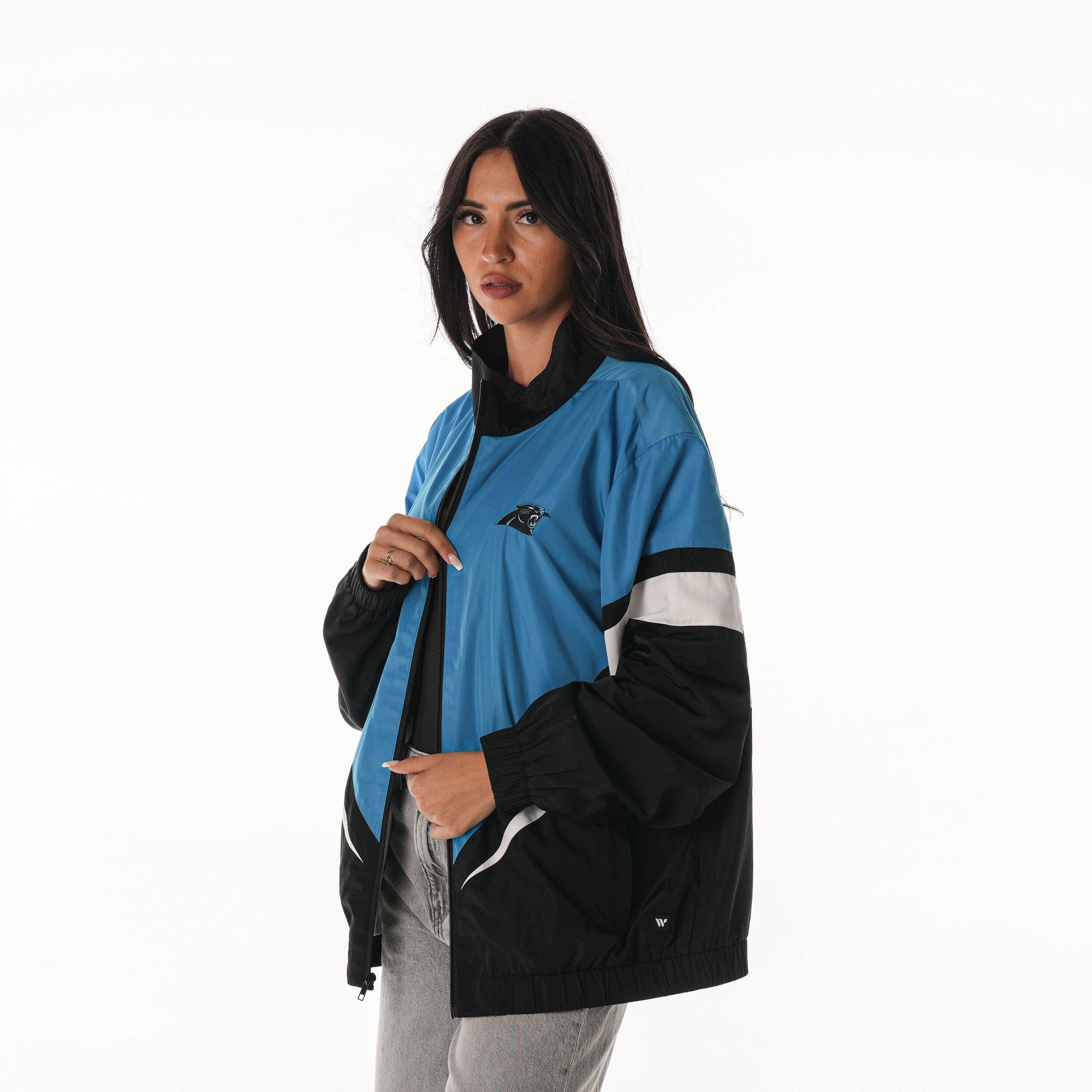 Rep your team with bold energy. This Carolina Panthers Track Jacket brings classic streetwear vibes to game day with its sharp chevron color-block design and retro silhouette. Featuring a zip-up front, elastic cuffs, and official Panthers branding, this lightweight jacket is made to layer up in style—whether you're at the stadium or on the go.