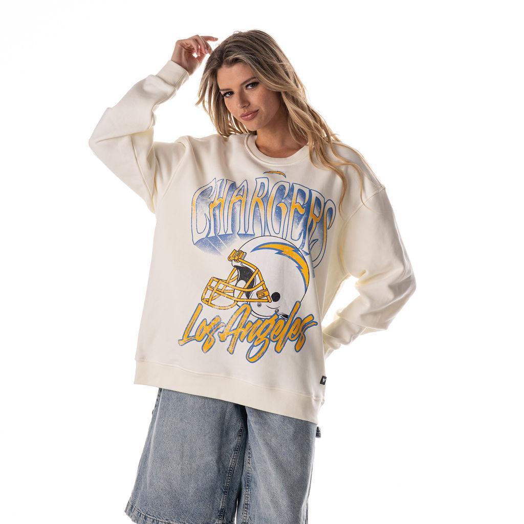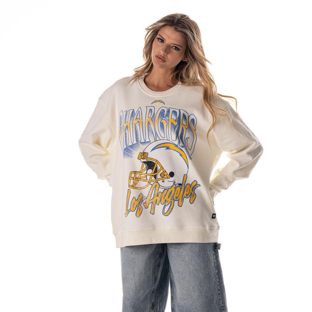 This Los Angeles Chargers crew fleece features a bold graphic print that channels retro football vibes with a modern twist. Designed in a soft vintage white tone with varsity-style font and a throwback helmet graphic, it's a standout piece for any fan. Whether you're heading to SoFi or repping the Bolts off-duty, this fleece brings the energy.