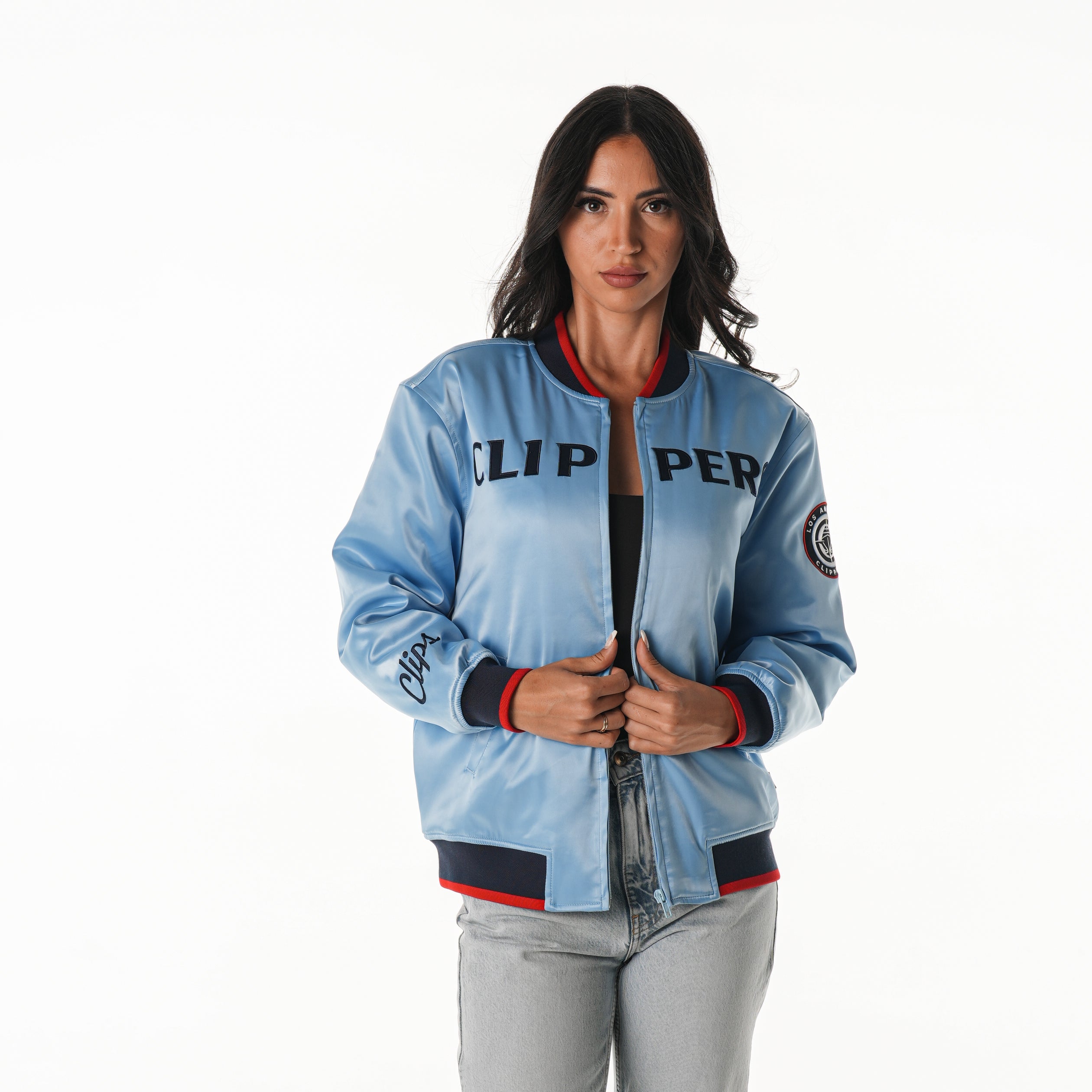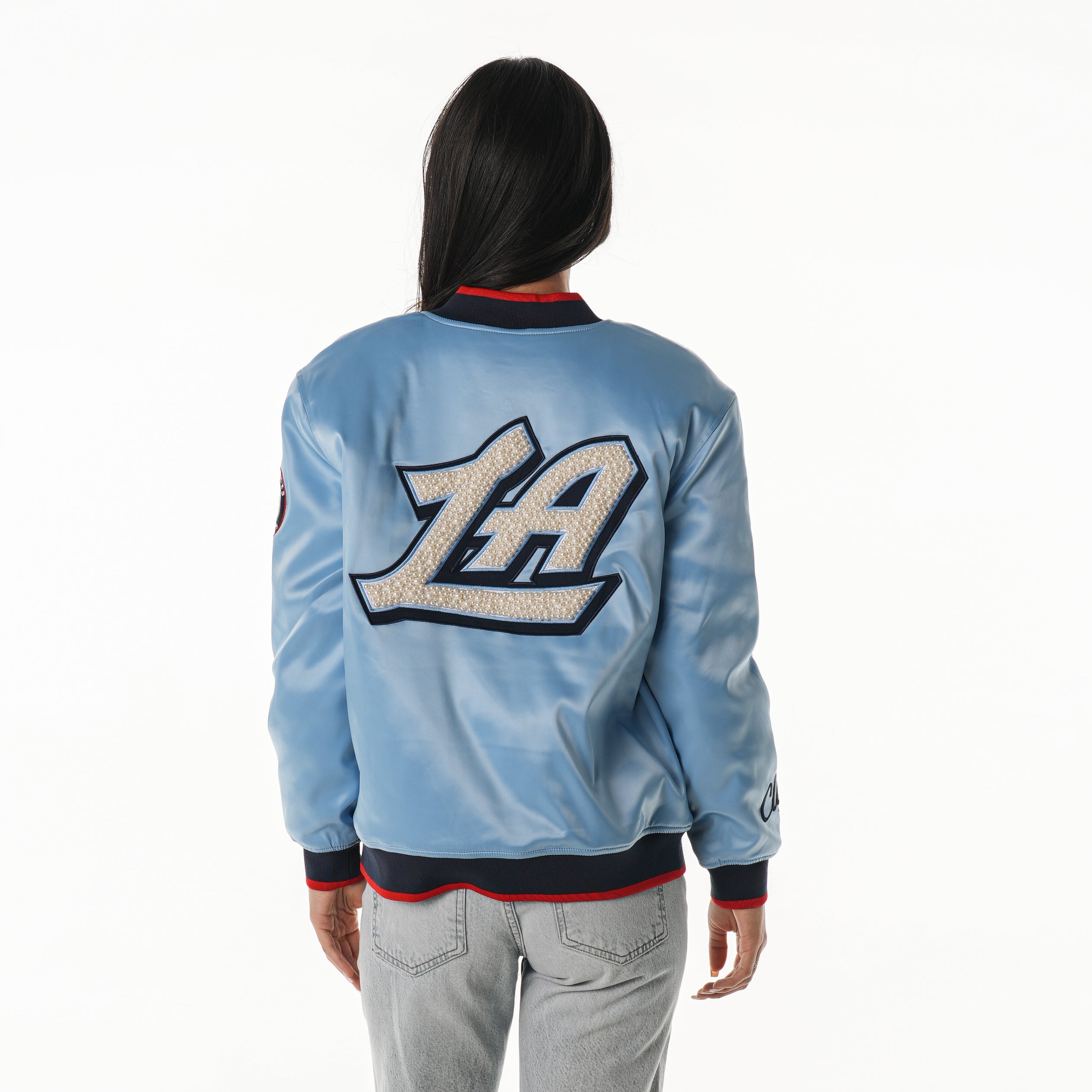 A sleek satin bomber with standout Clippers details. This Pacific Blue jacket features bold front lettering, striped rib trim, and a statement LA graphic across the back with pearl-style detailing. A polished, modern take on team pride that pairs easily with any fit.