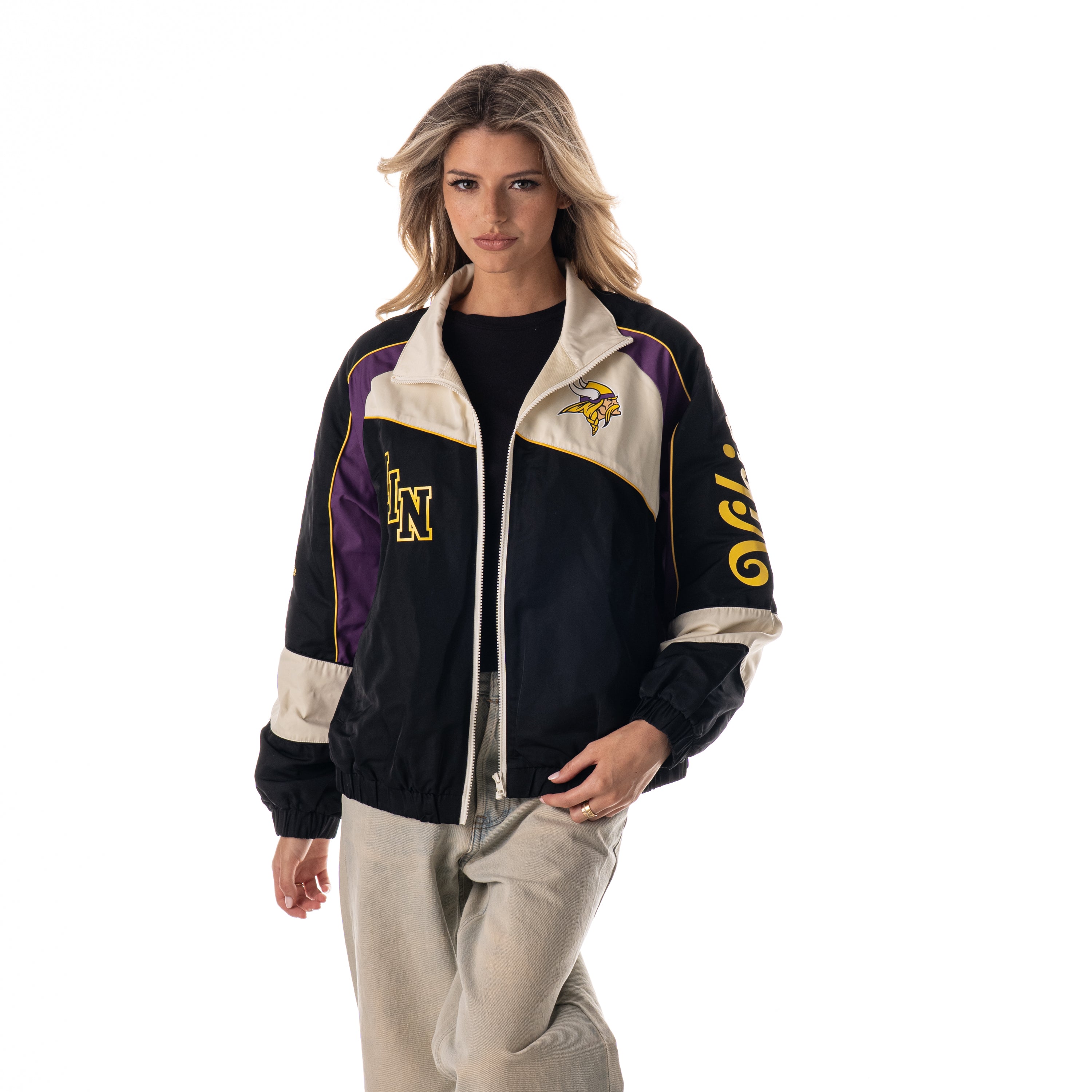 Rep the Vikings in this oversized raglan track jacket, designed with bold team graphics across the back and contrast sleeve details. Purple, cream, and black color-blocking highlight a retro athletic vibe.