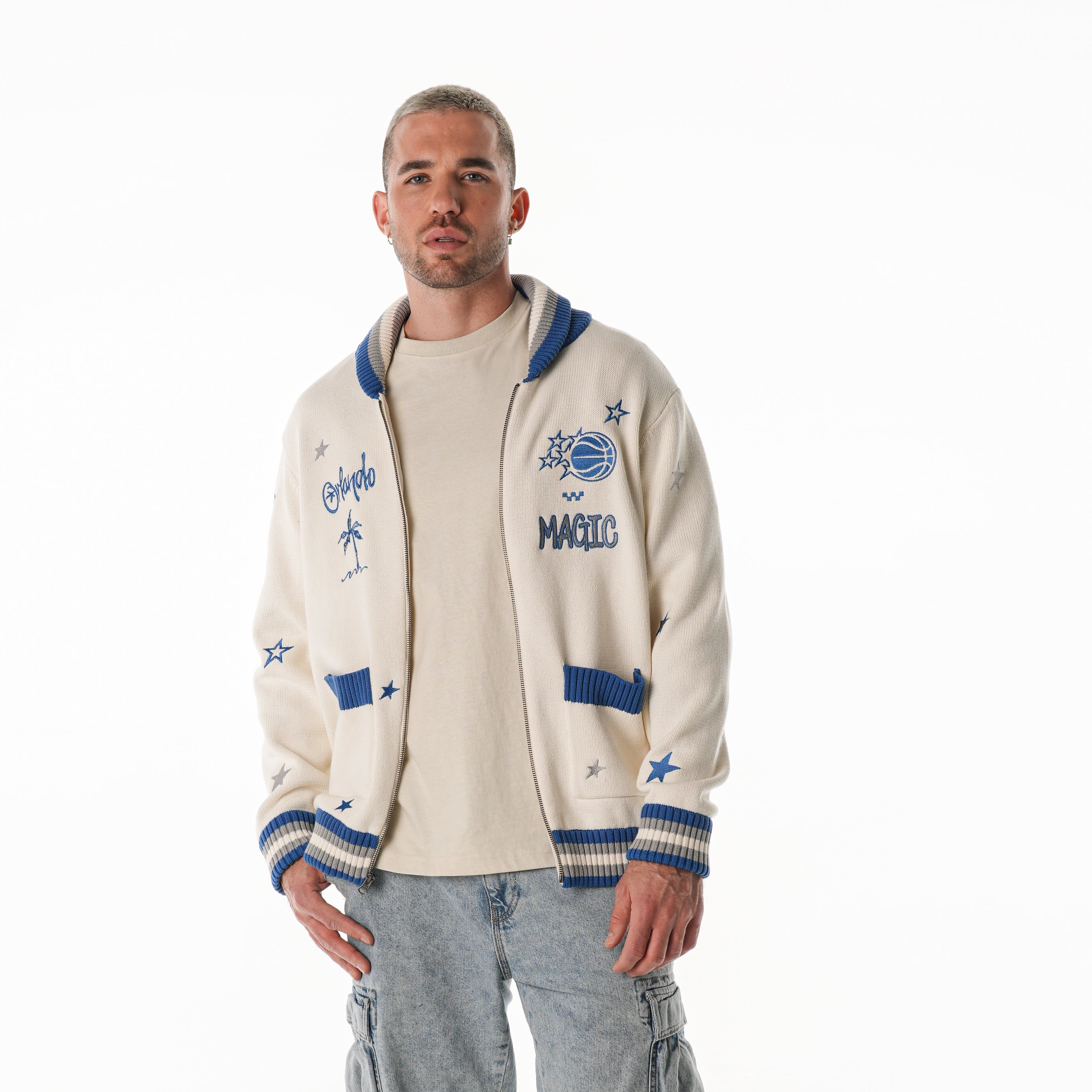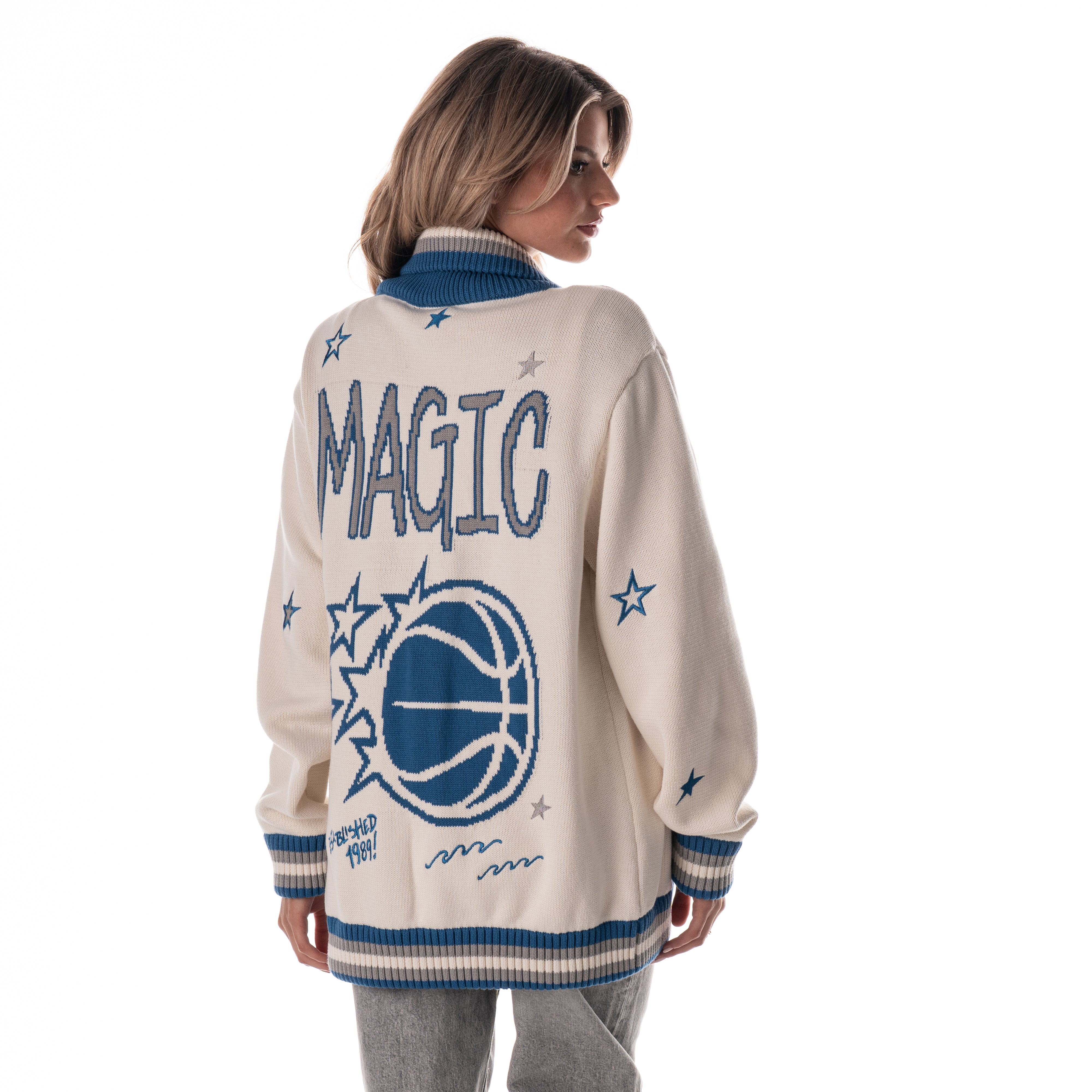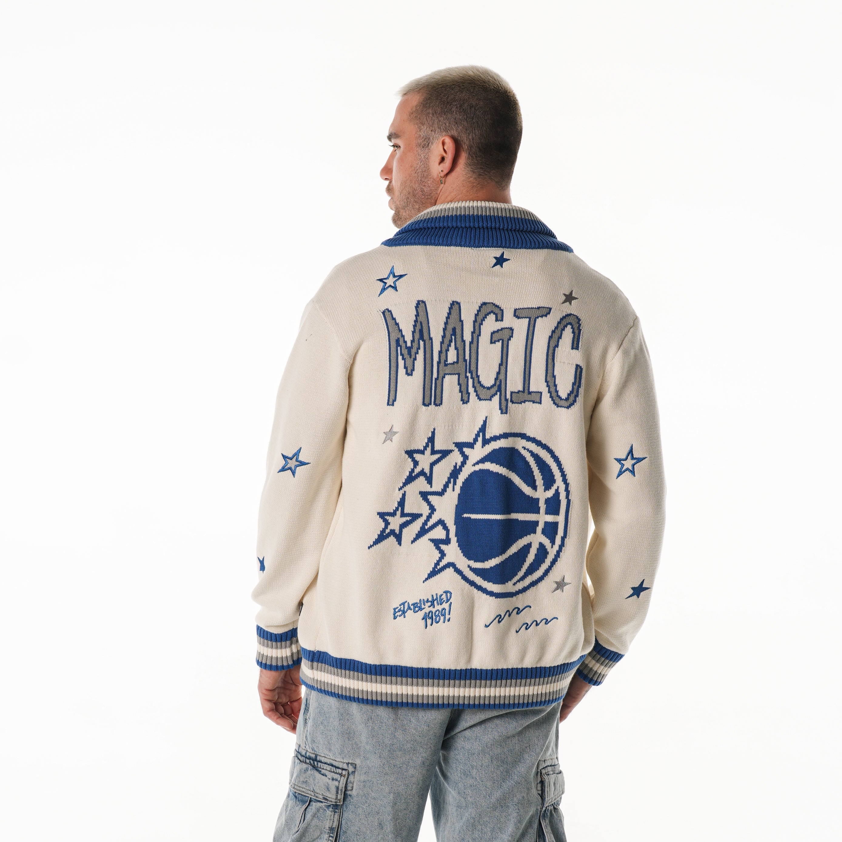 Rep your squad from every angle. This Orlando Magic sweater features a full-zip front and custom jacquard knit design with bold team branding on the front, sleeves, and back. The cream base is accented with Magic blue for a vintage-inspired look that keeps things modern and clean.