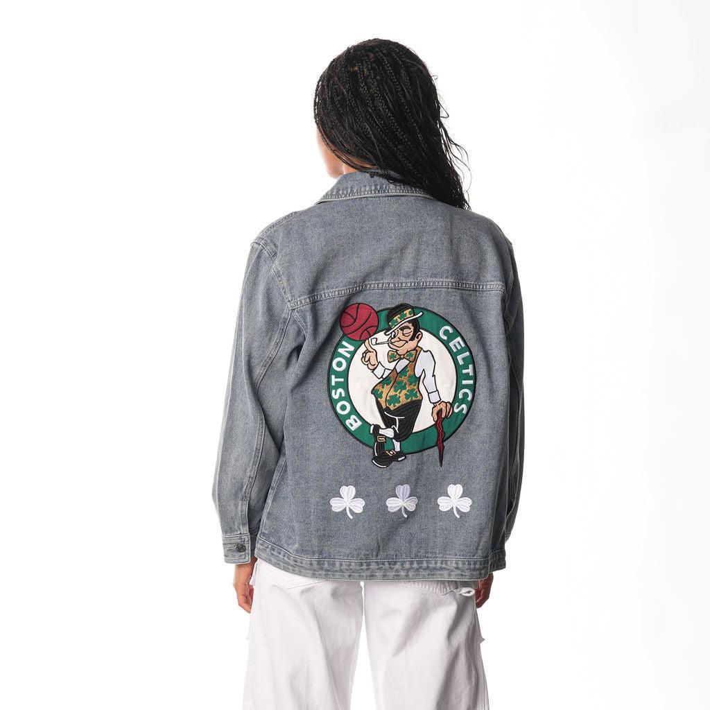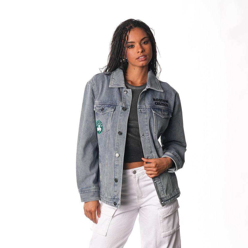 The Boston Celtics Women's Denim Jacket in denim offers a classic look with bold team accents. Perfect for showing off your Celtics pride in effortless style.
