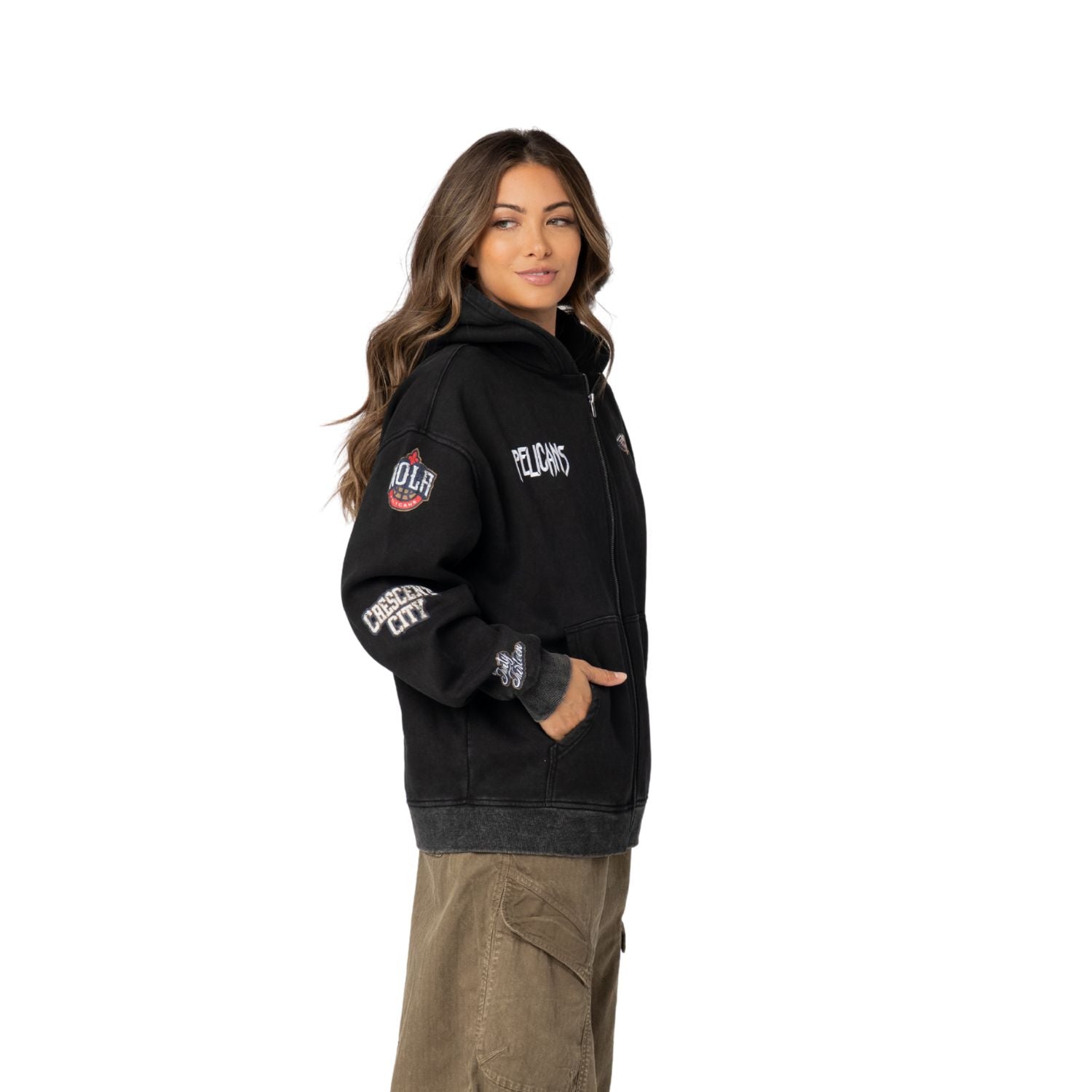 A black full-zip hoodie designed with Pelicans logos down each sleeve and a clean team mark on the chest. Laid-back, comfortable, and ready for everyday rotation.