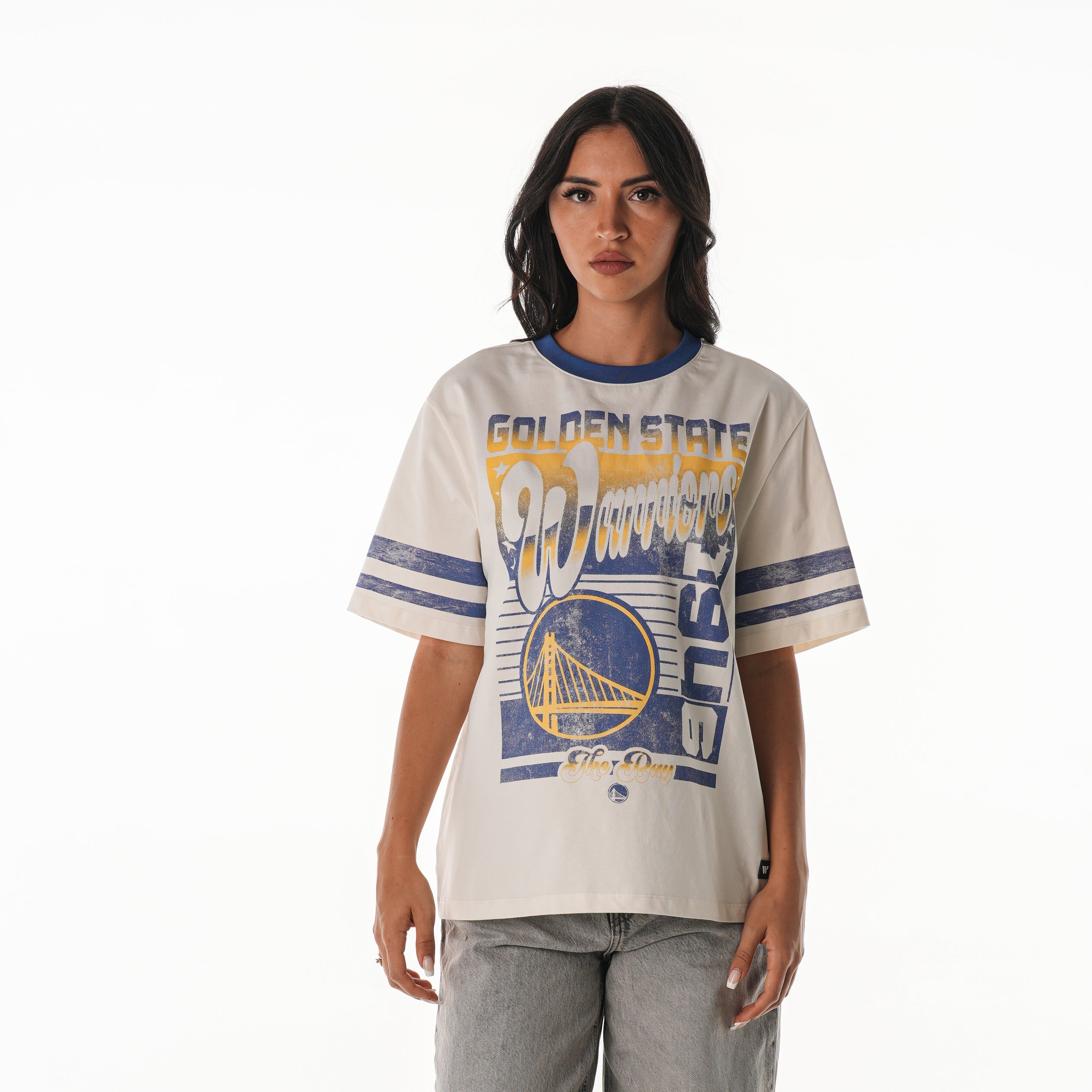 A cream vintage-style drop shoulder tee with a relaxed fit and a bold Warriors graphic across the front. Easy to style and made for everyday wear.