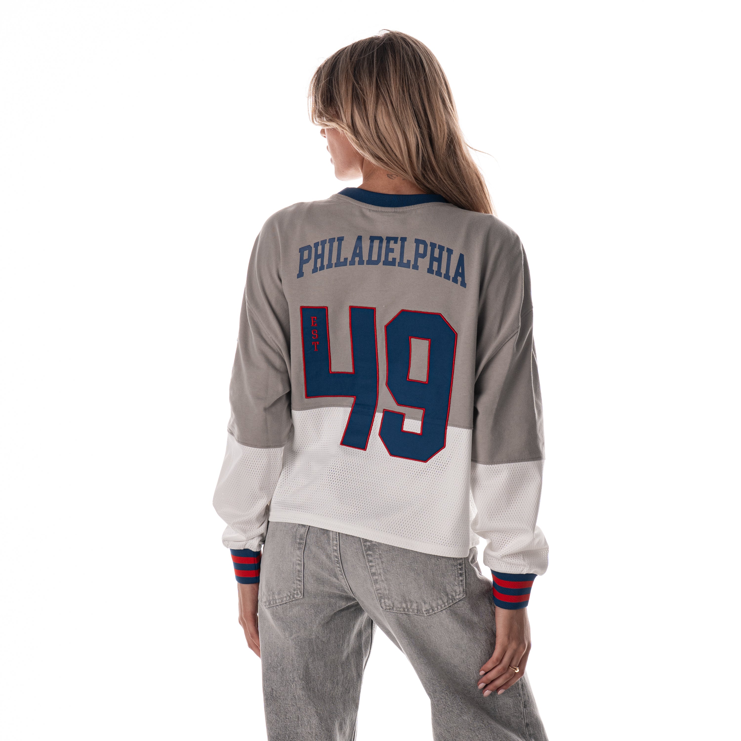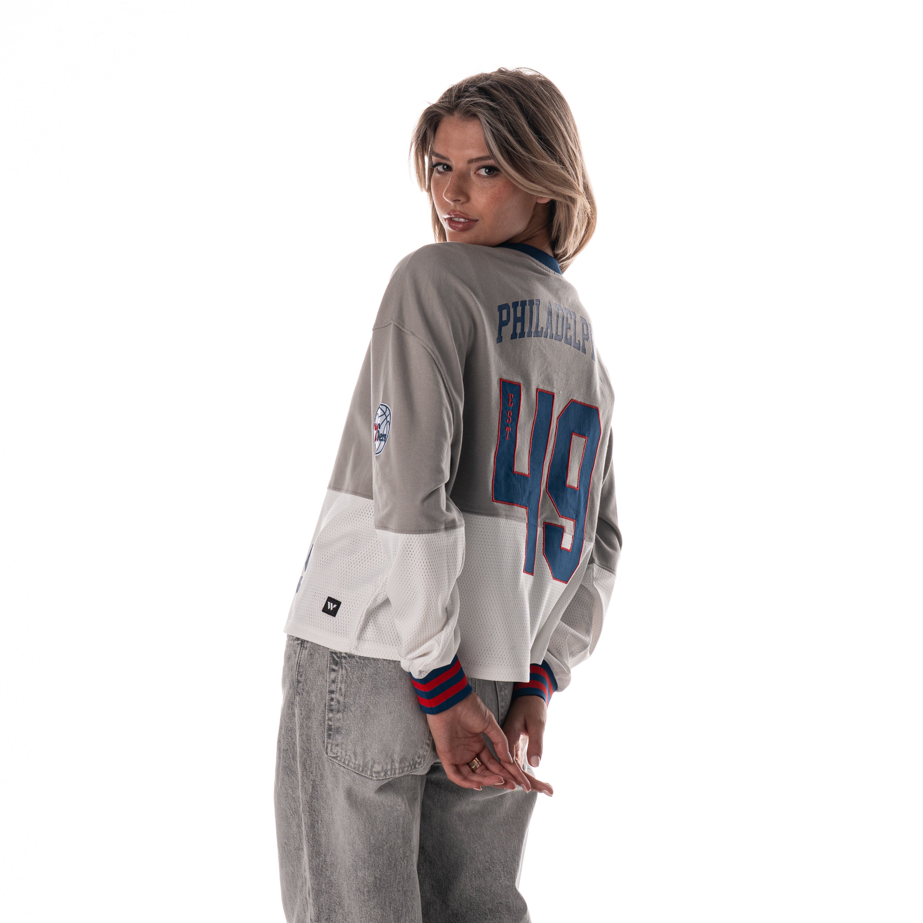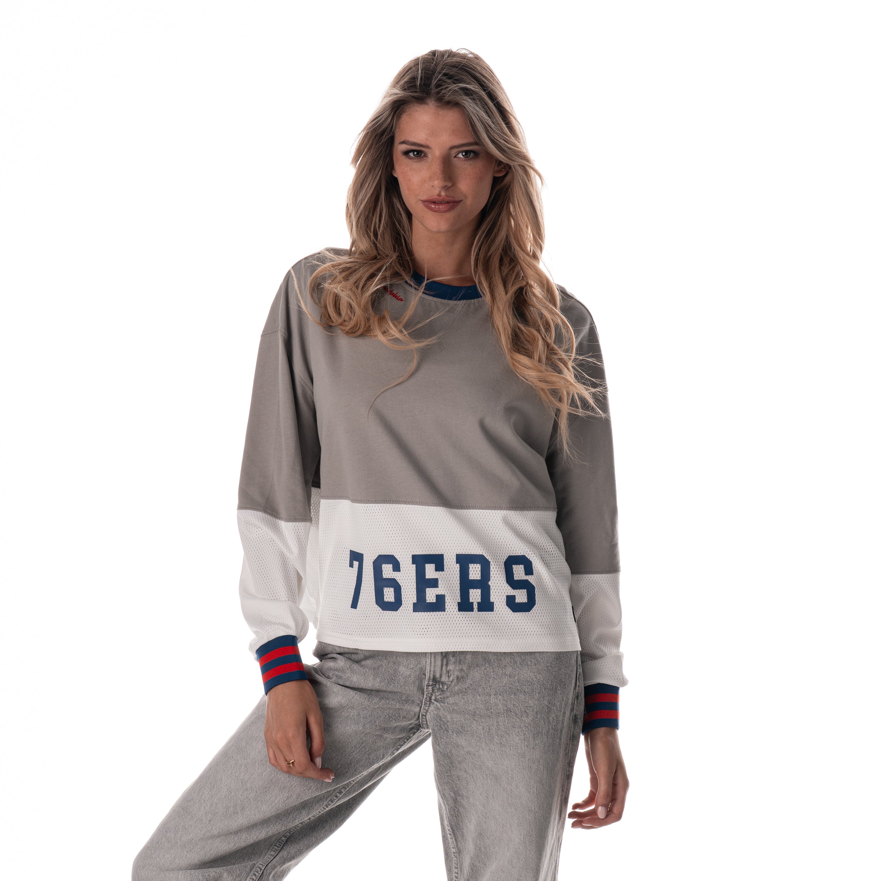 A cropped long-sleeve fleece with a split grey-and-white design and a mesh lower panel for a lighter, sport-inspired feel. The front keeps it simple with a bold 76ERS, while the back features the PHILADELPHIA hit and oversized 49 graphic. Easy, relaxed fit.