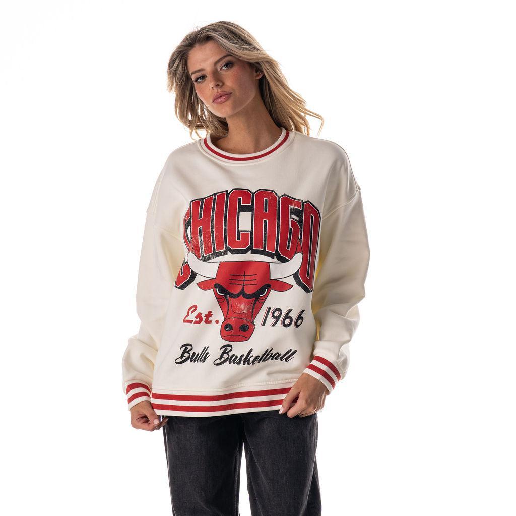 Rep the Bulls in iconic red and cream. This oversized fleece crew channels vintage vibes with collegiate-style text, bold logo placement, and varsity striping on the cuffs and hem.
